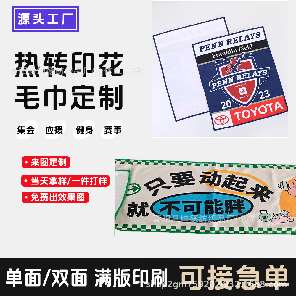 热转移印花集会毛巾手感柔软吸水性好,印花准确度高,不受花型限制,复杂花型也没问题,不用制版,打样方便,出货快,欢迎下单咨询。