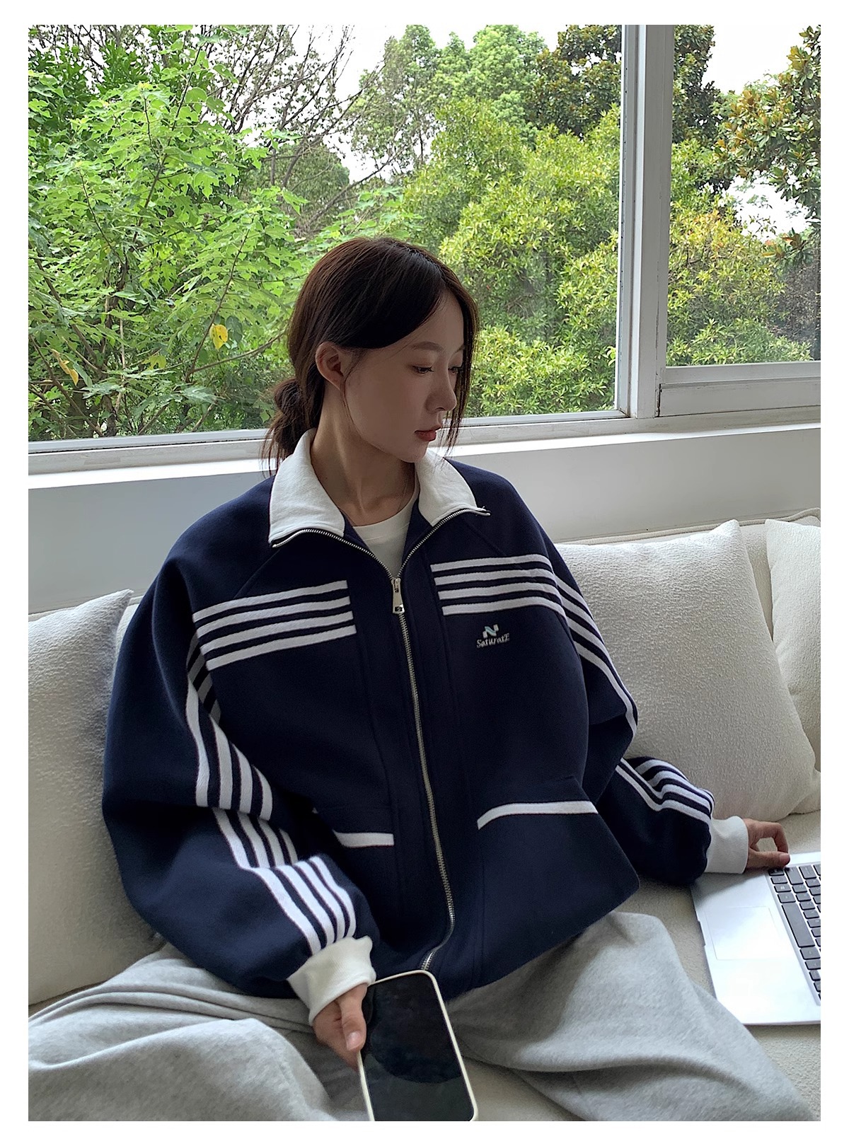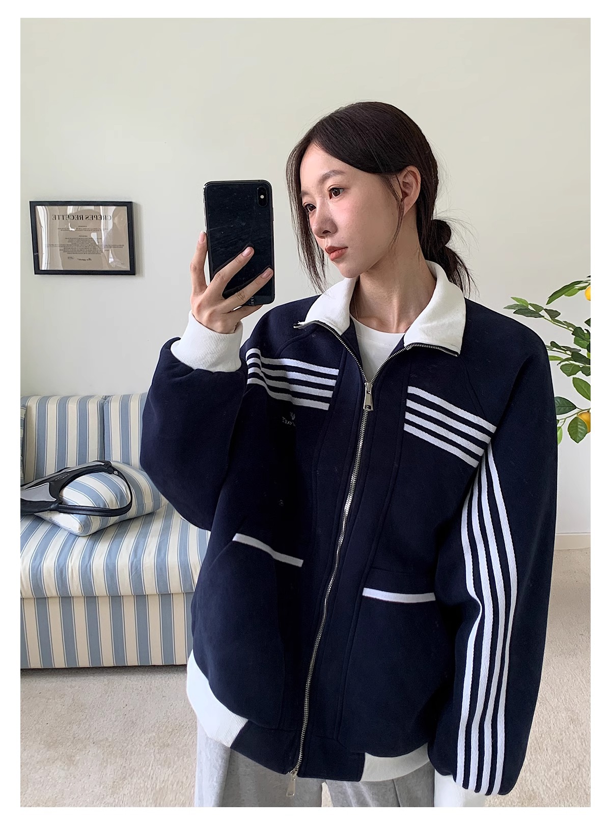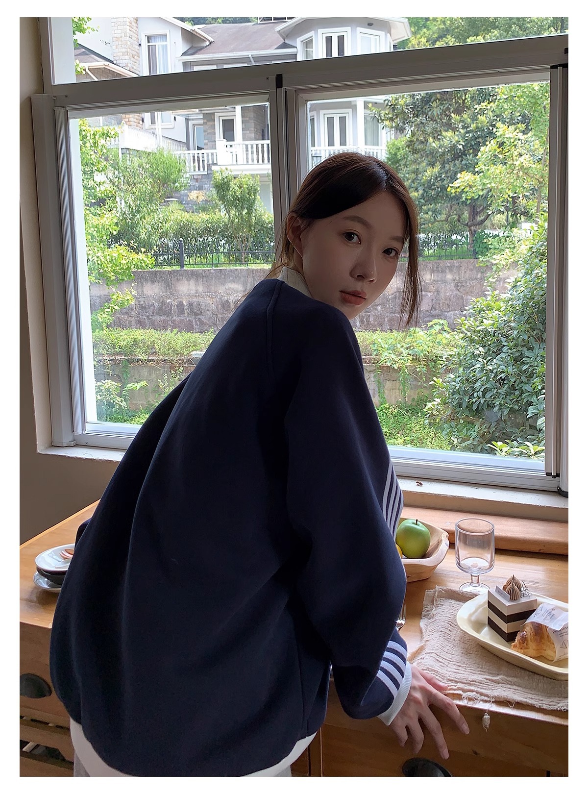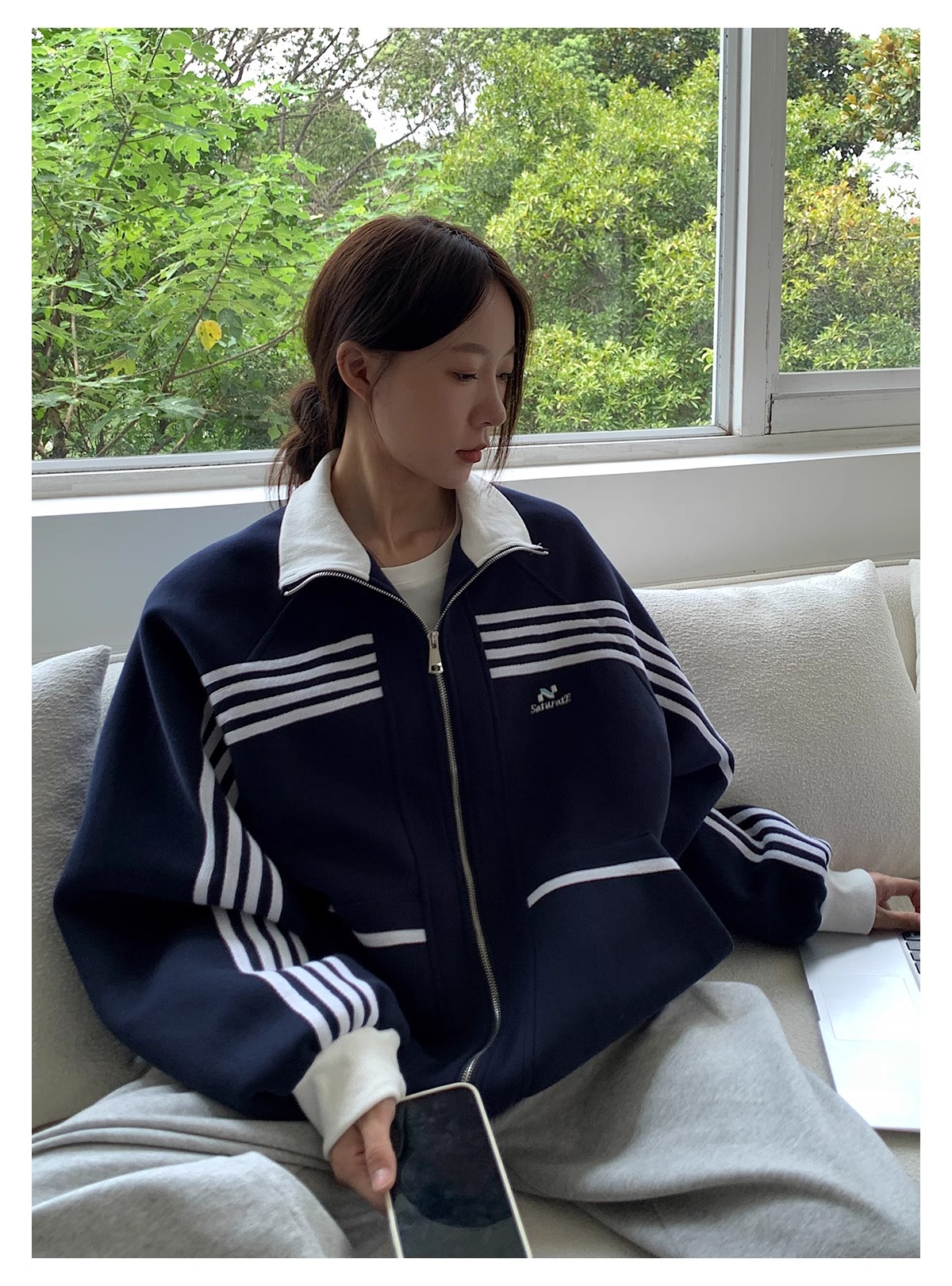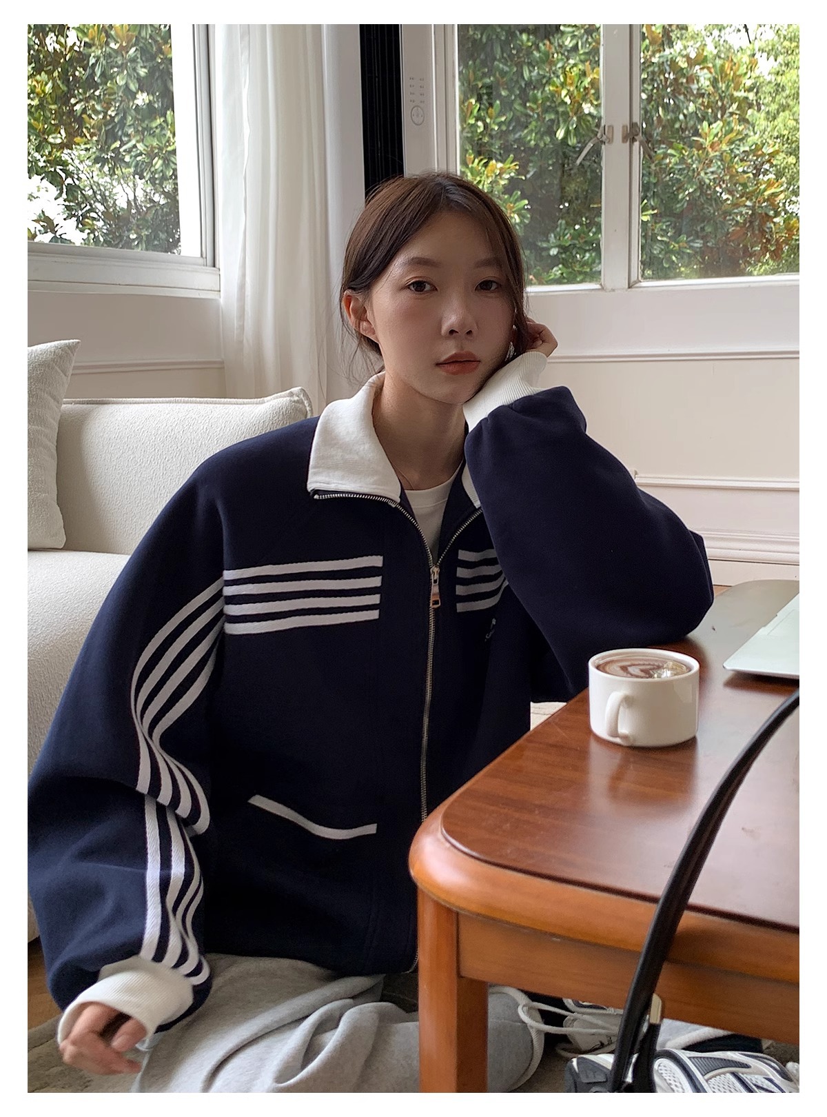 미국 스타일 무거운 줄무늬 야구 세트 코트 여성 가을 디자인 대비 컬러 스티칭 카디건 재킷 코트 칼라 톱 한국어스토어 가기