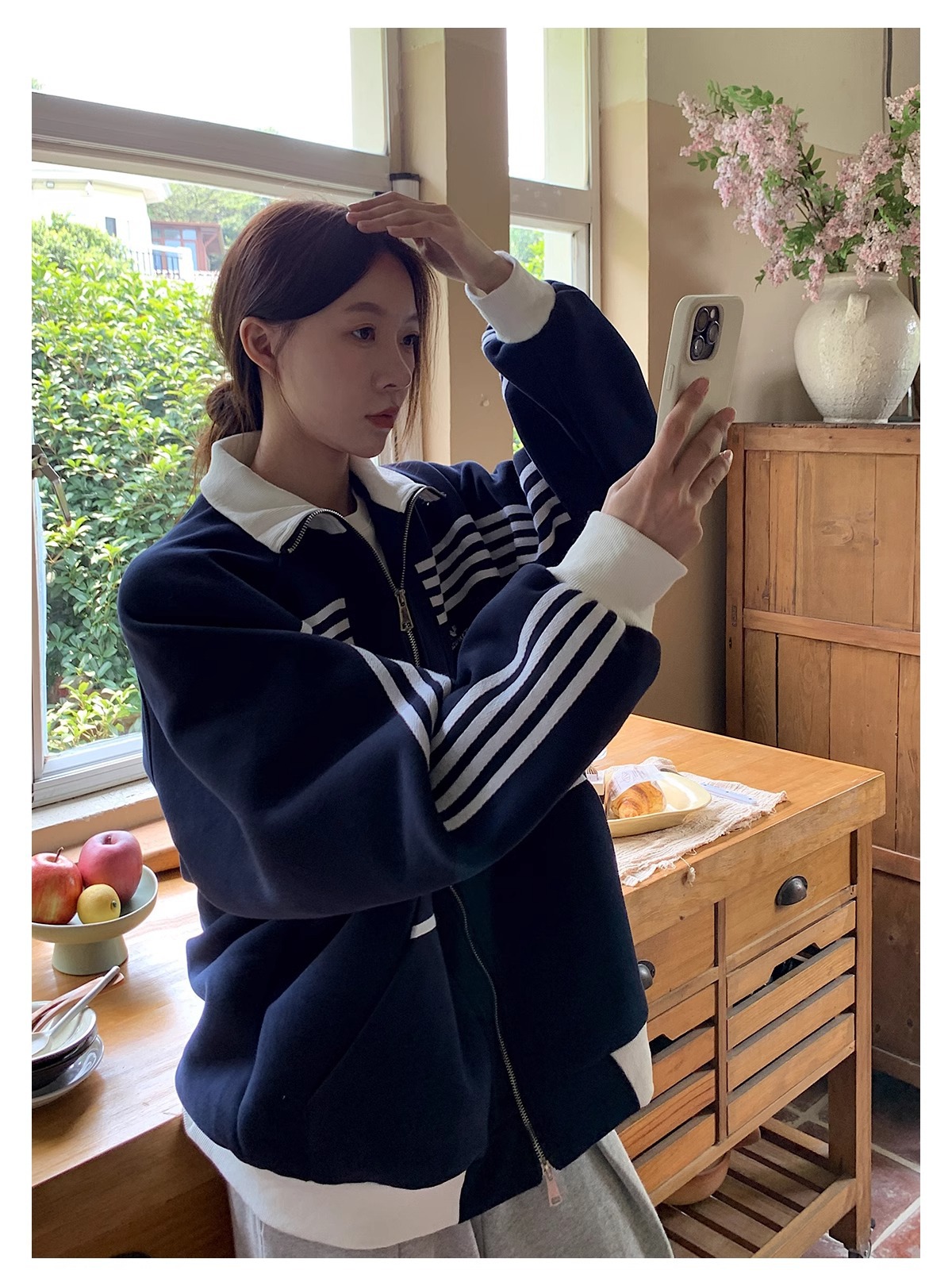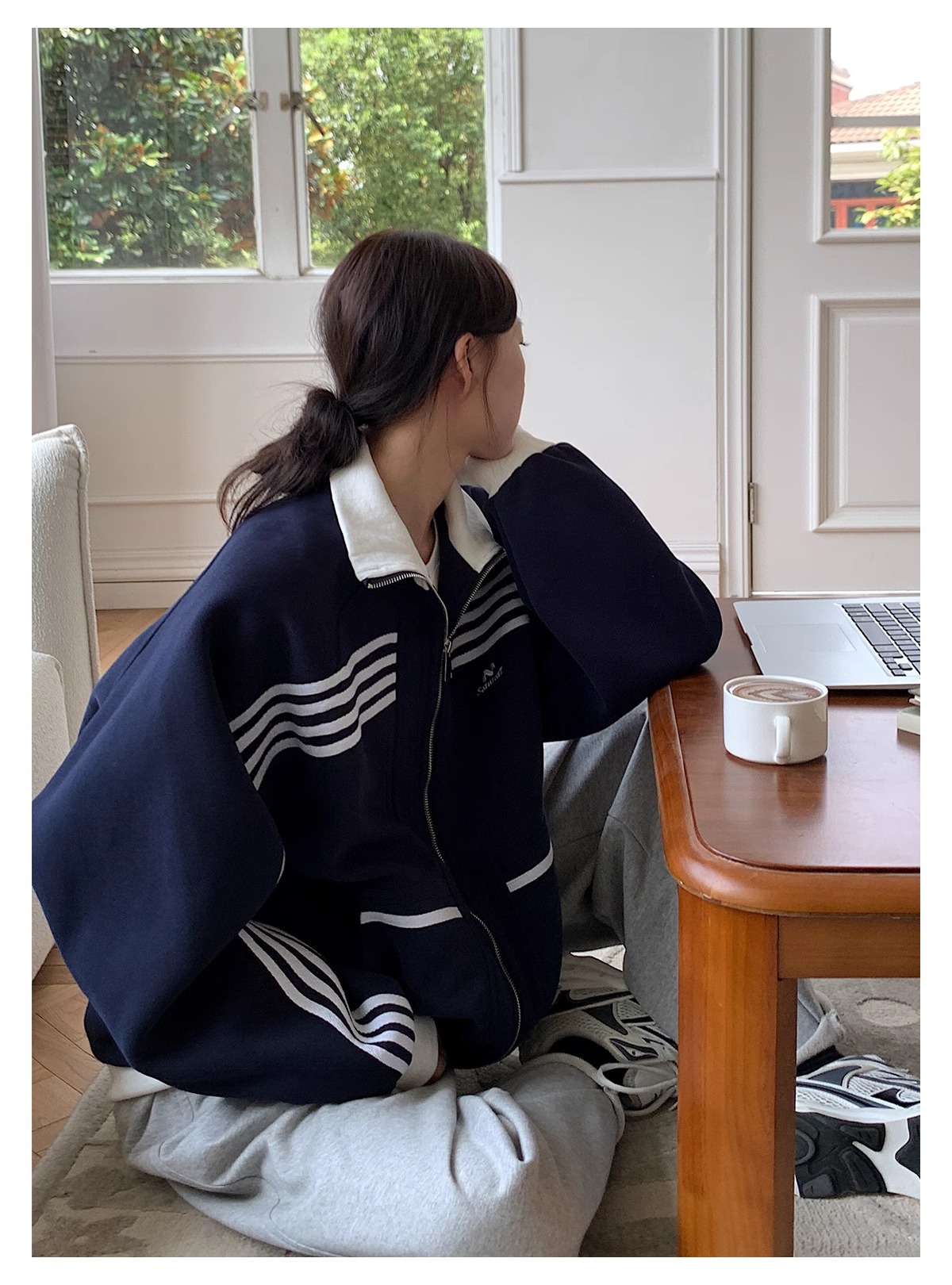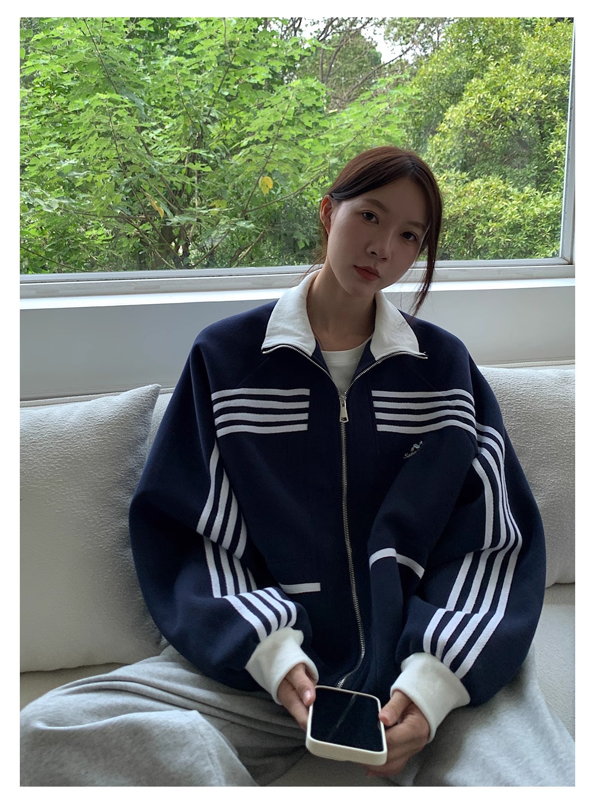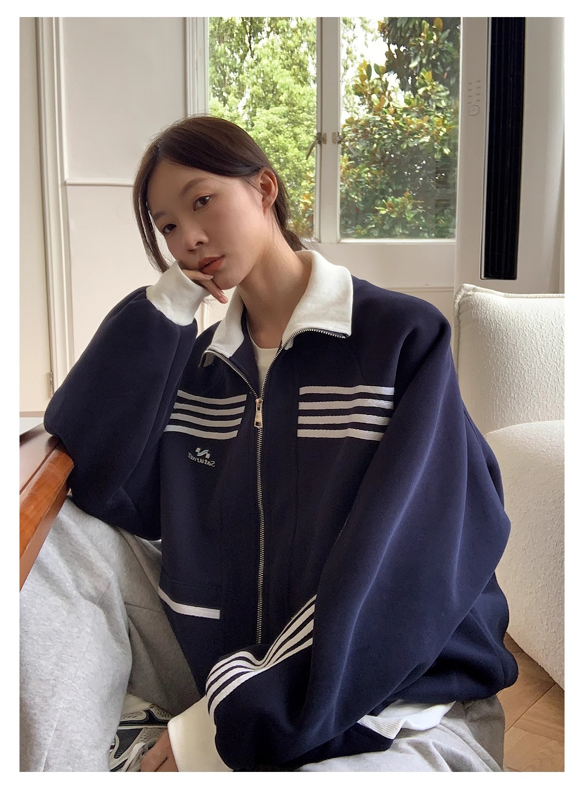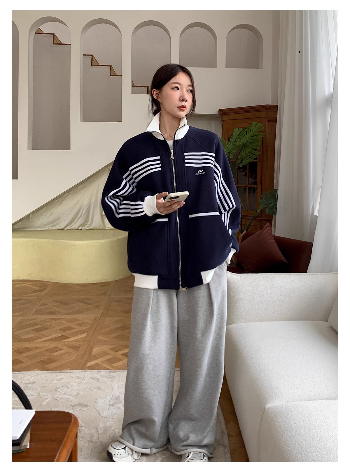 미국 스타일 무거운 줄무늬 야구 세트 코트 여성 가을 디자인 대비 컬러 스티칭 카디건 재킷 코트 칼라 톱 한국어스토어 가기