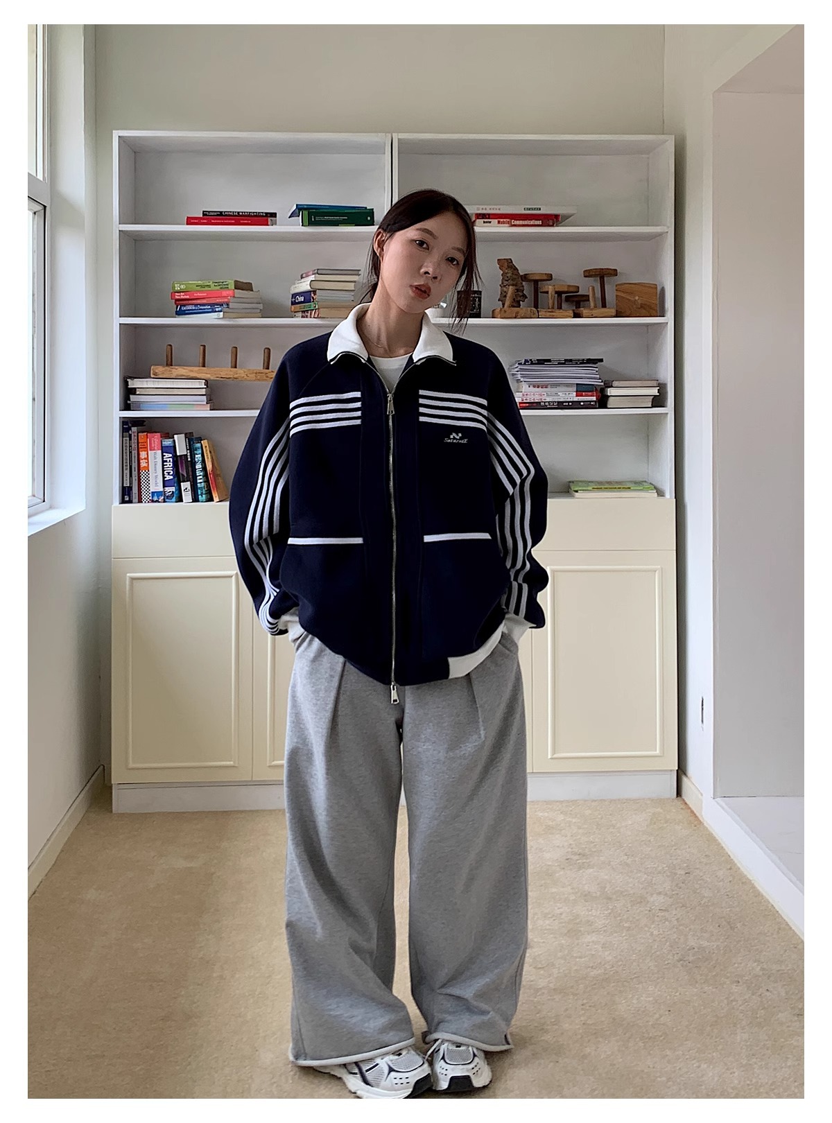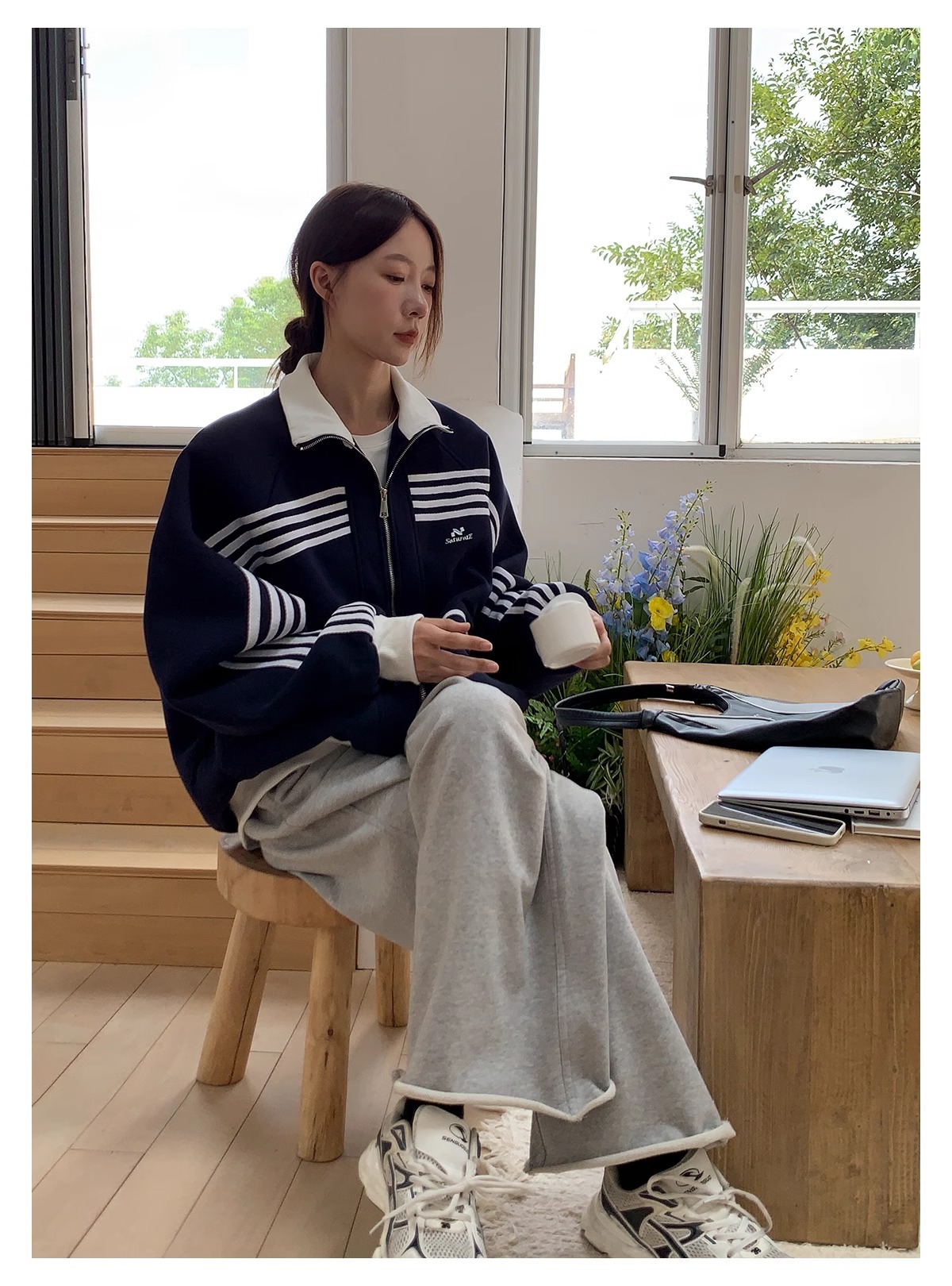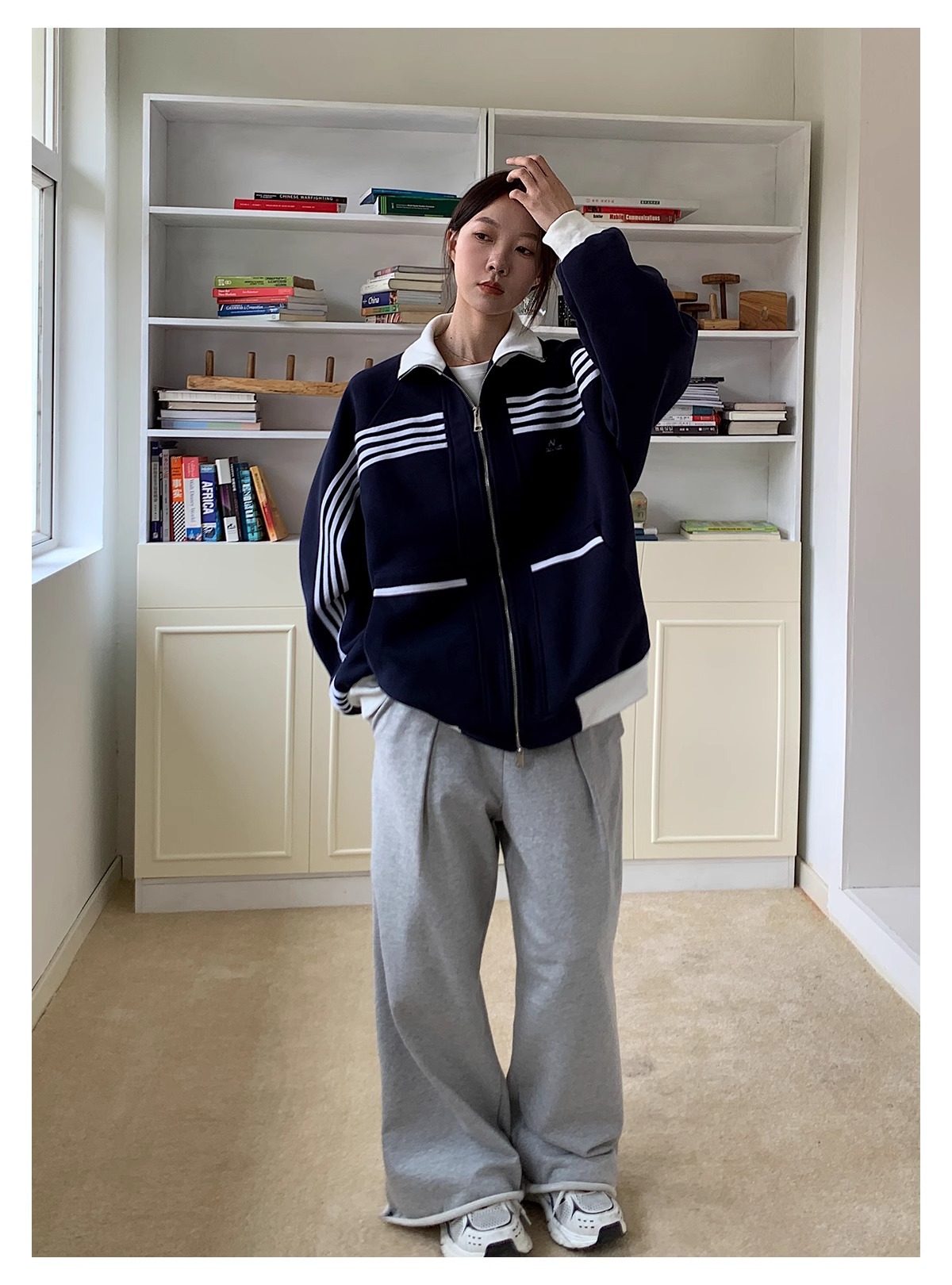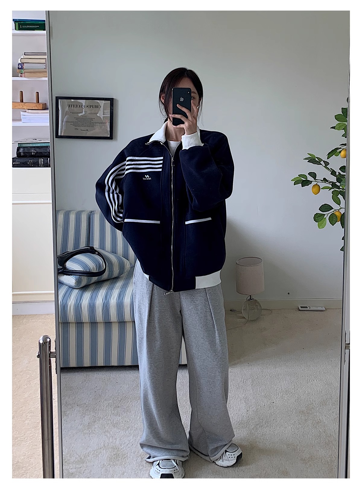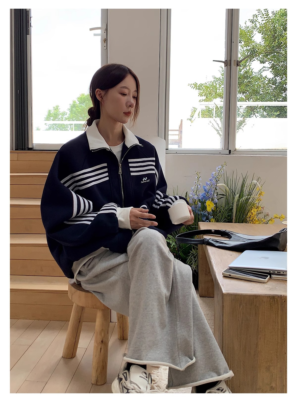 미국 스타일 무거운 줄무늬 야구 세트 코트 여성 가을 디자인 대비 컬러 스티칭 카디건 재킷 코트 칼라 톱 한국어스토어 가기
