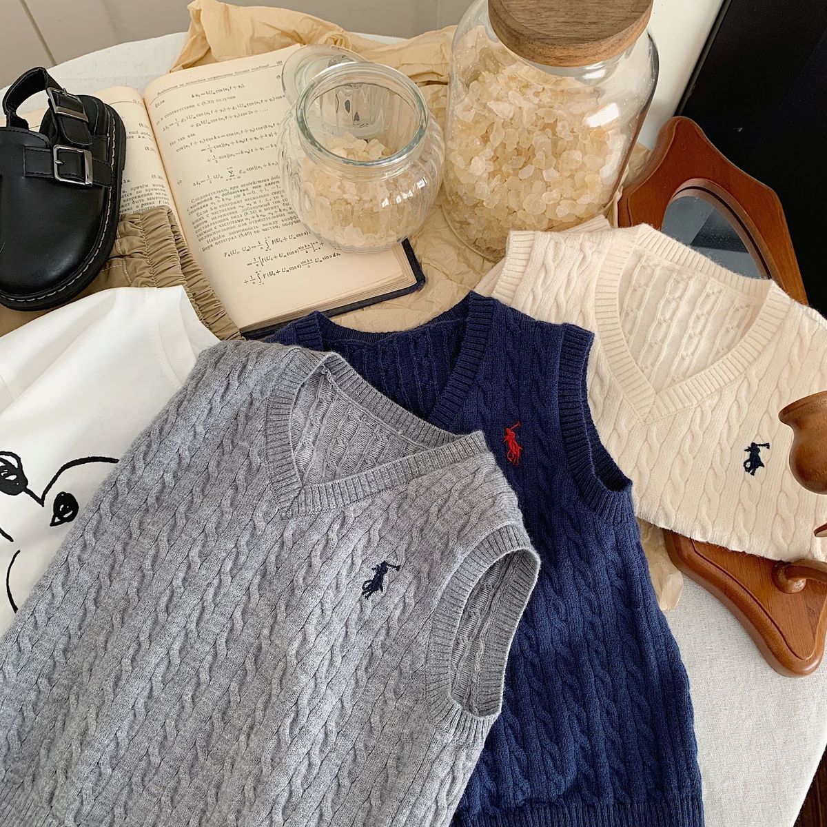2024 남학생과 여학생을위한 새로운 어린이 봄과 가을 조끼 조끼로 장식 된 니트 조끼 V-Neck 스웨터 어린이 가을 패션스토어 가기