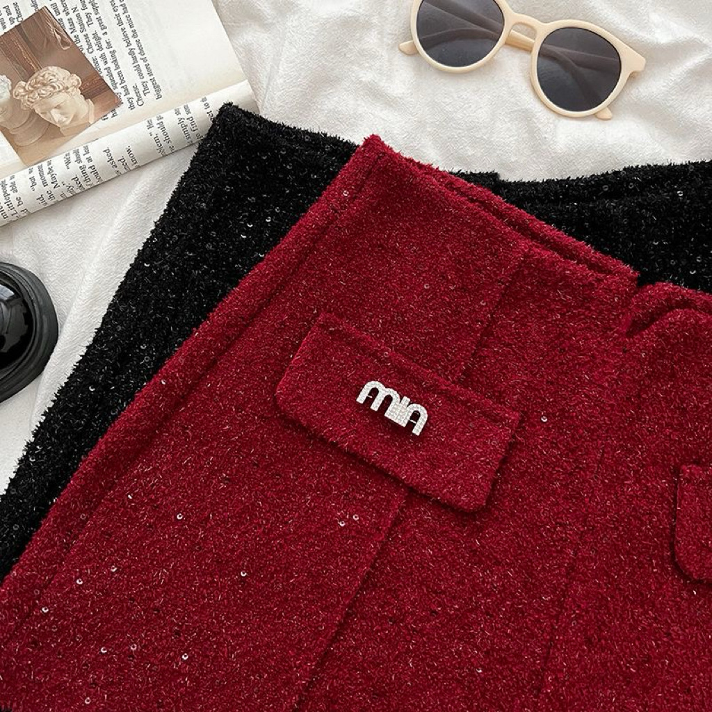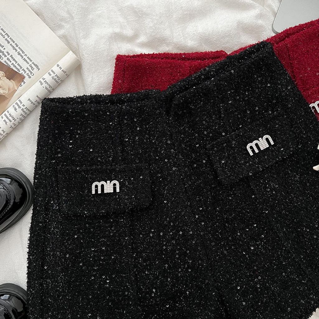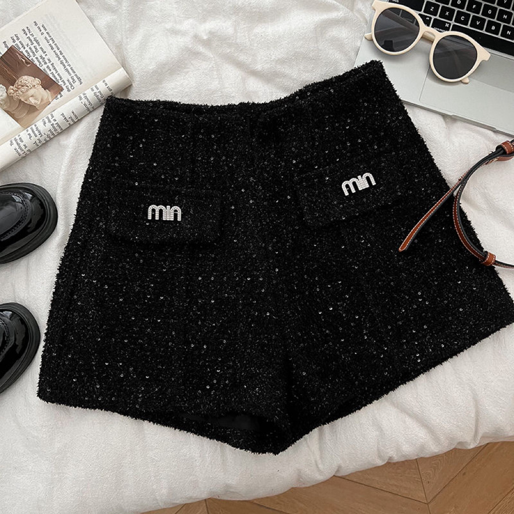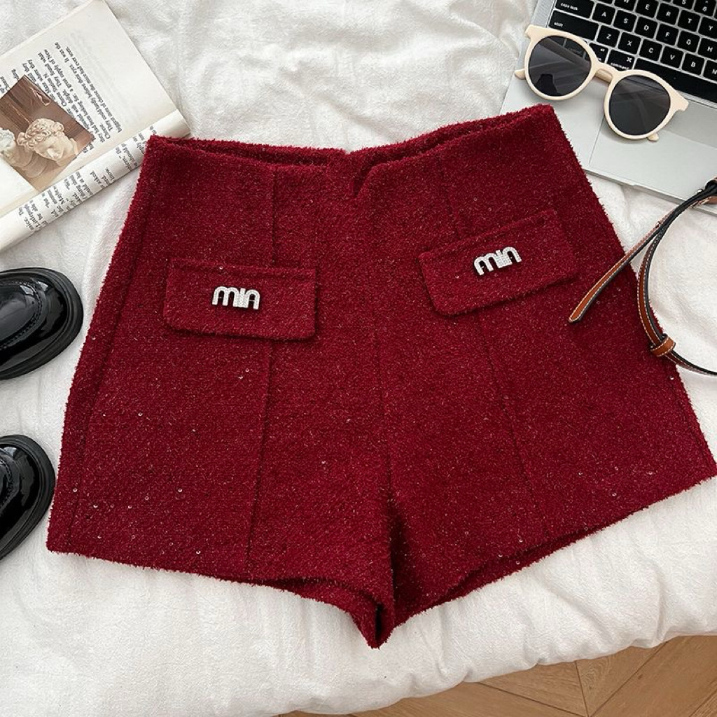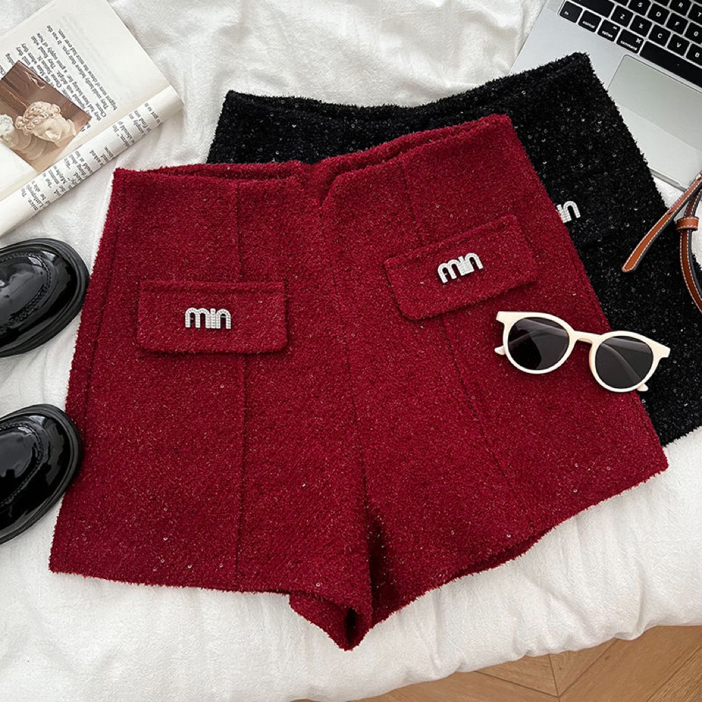여자 작은 향기로운 스타일 반바지 2025 가을 새로운 스타일 편지 핀 가짜 주머니 불규칙한 탄성 높은 허리 반바지