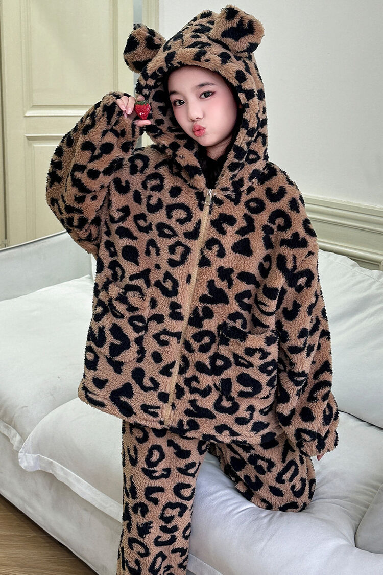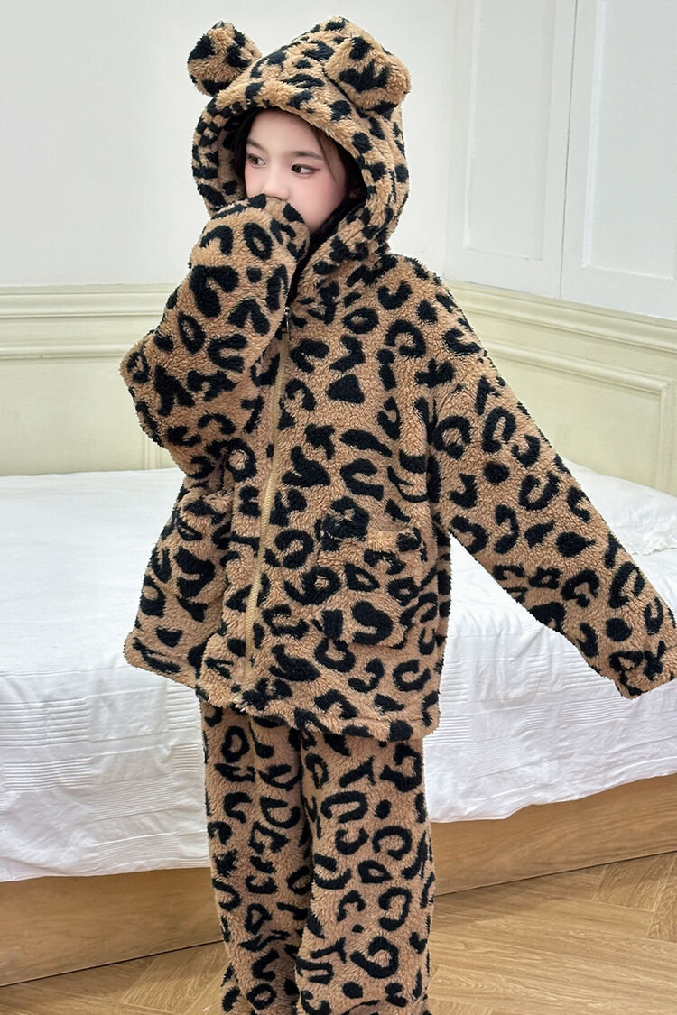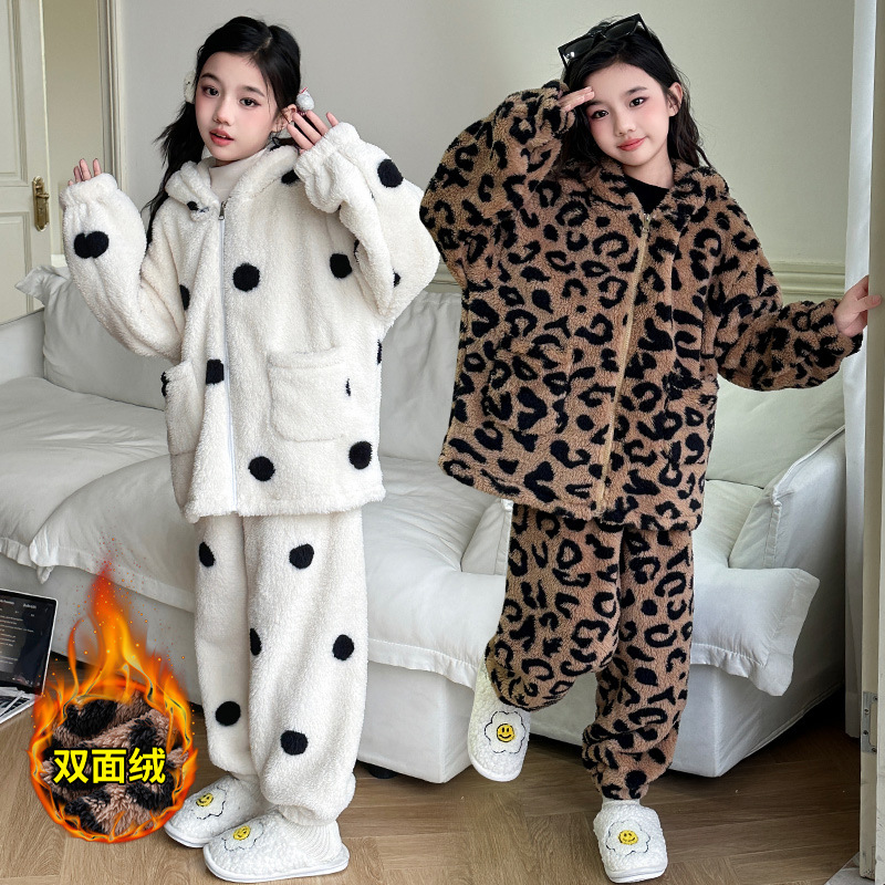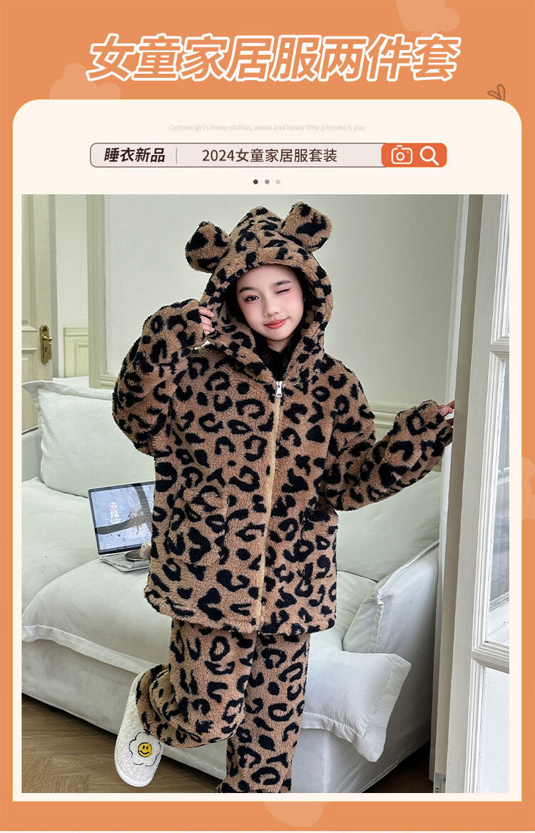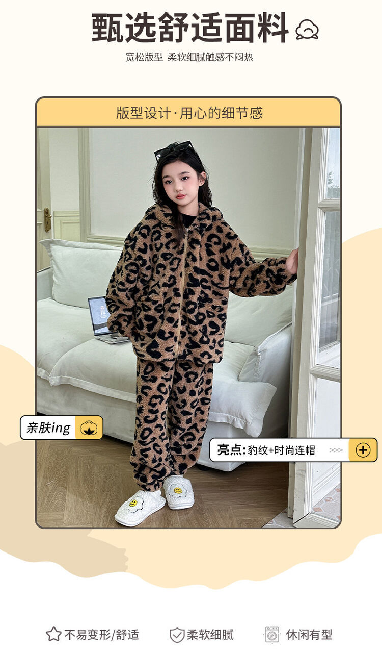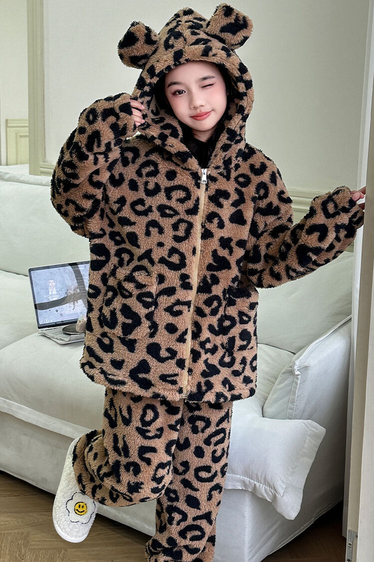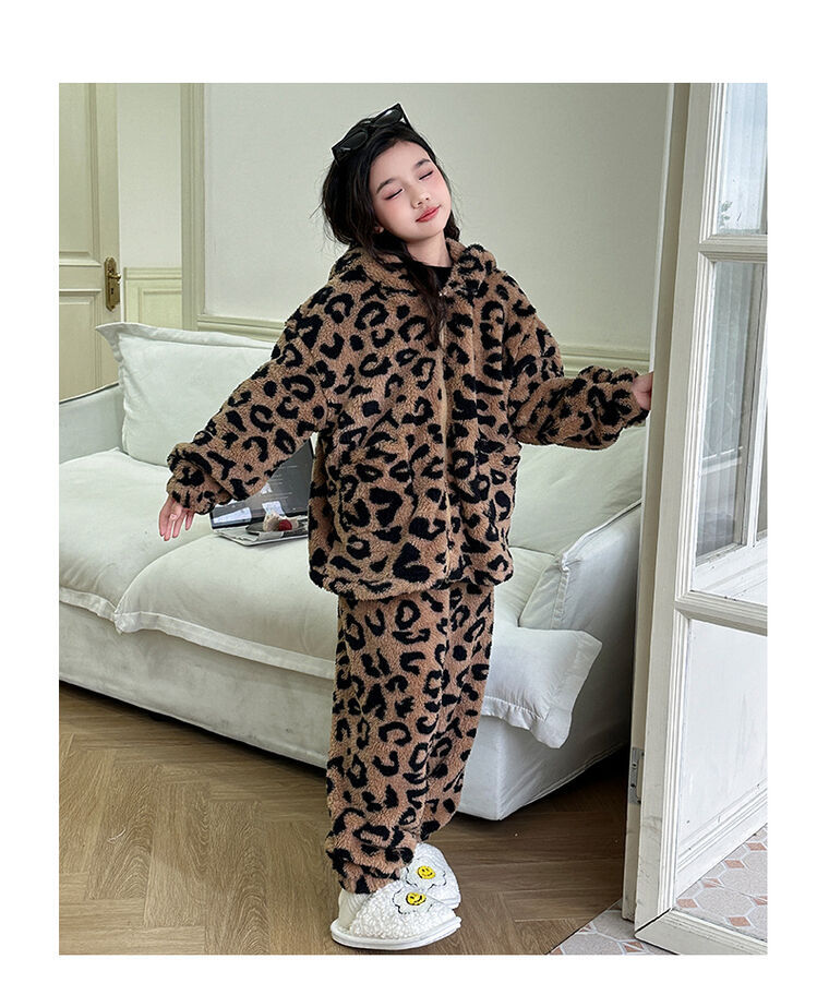 여자 후드 파자마 어린이 겨울 두꺼운 양면 양털 레오파드 무늬 홈 옷 유행 여자 따뜻한 세트 입고