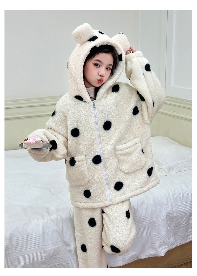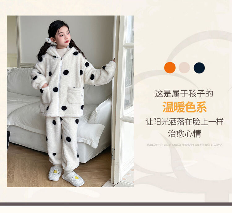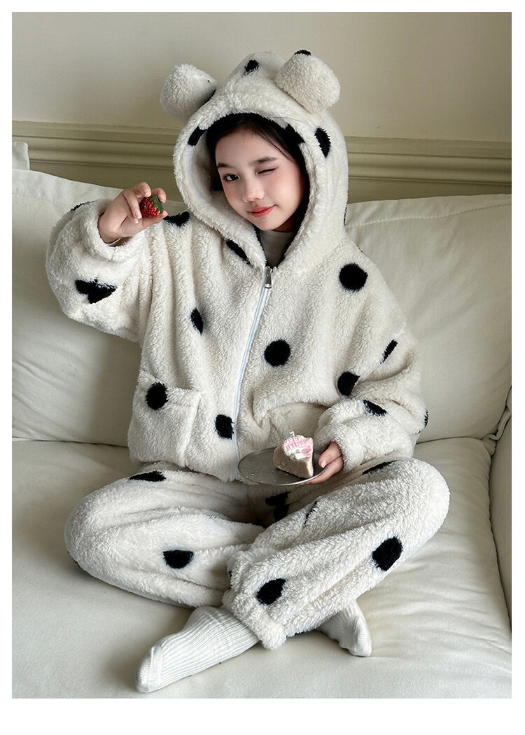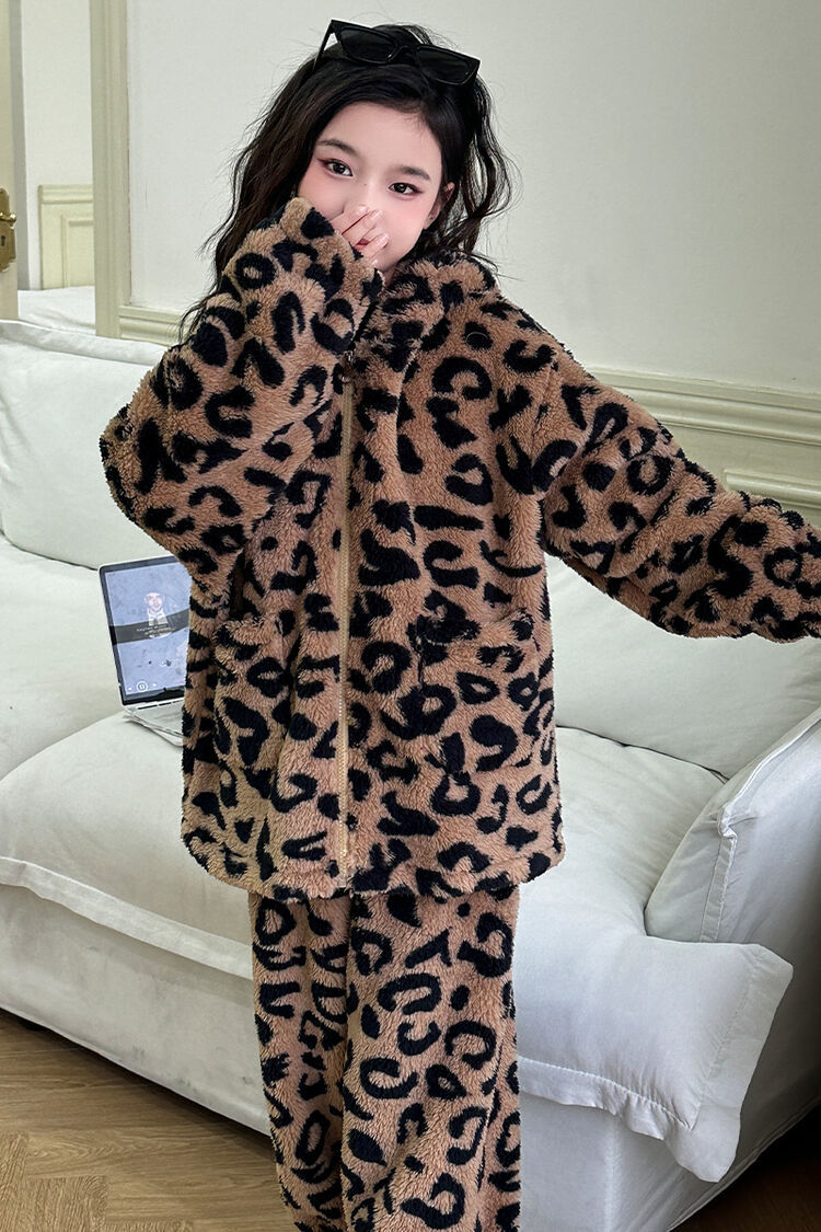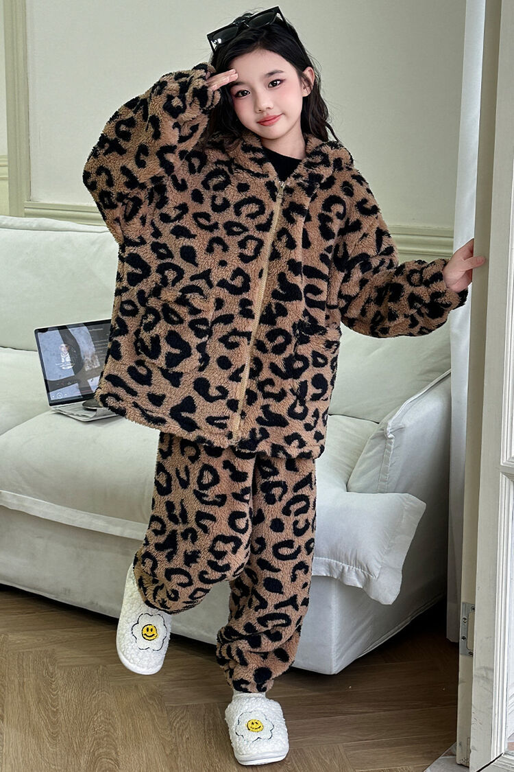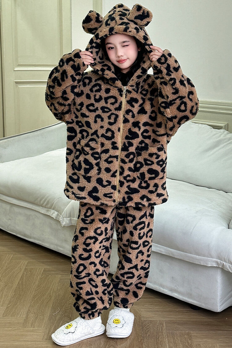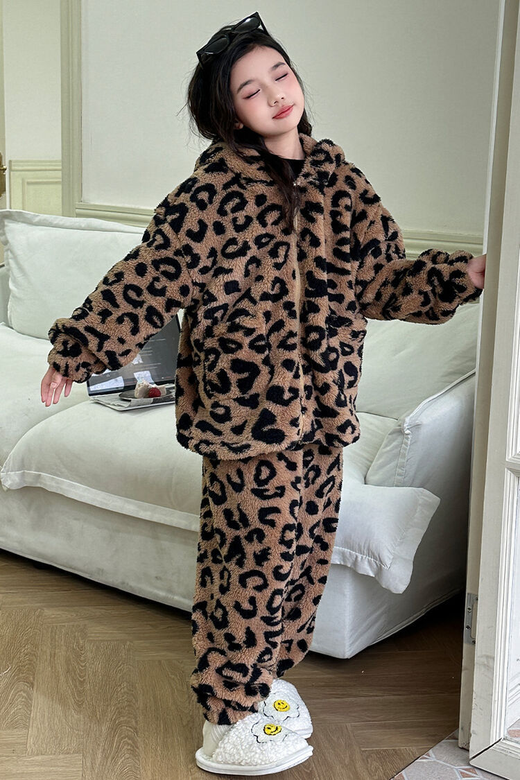 여자 후드 파자마 어린이 겨울 두꺼운 양면 양털 레오파드 무늬 홈 옷 유행 여자 따뜻한 세트 입고