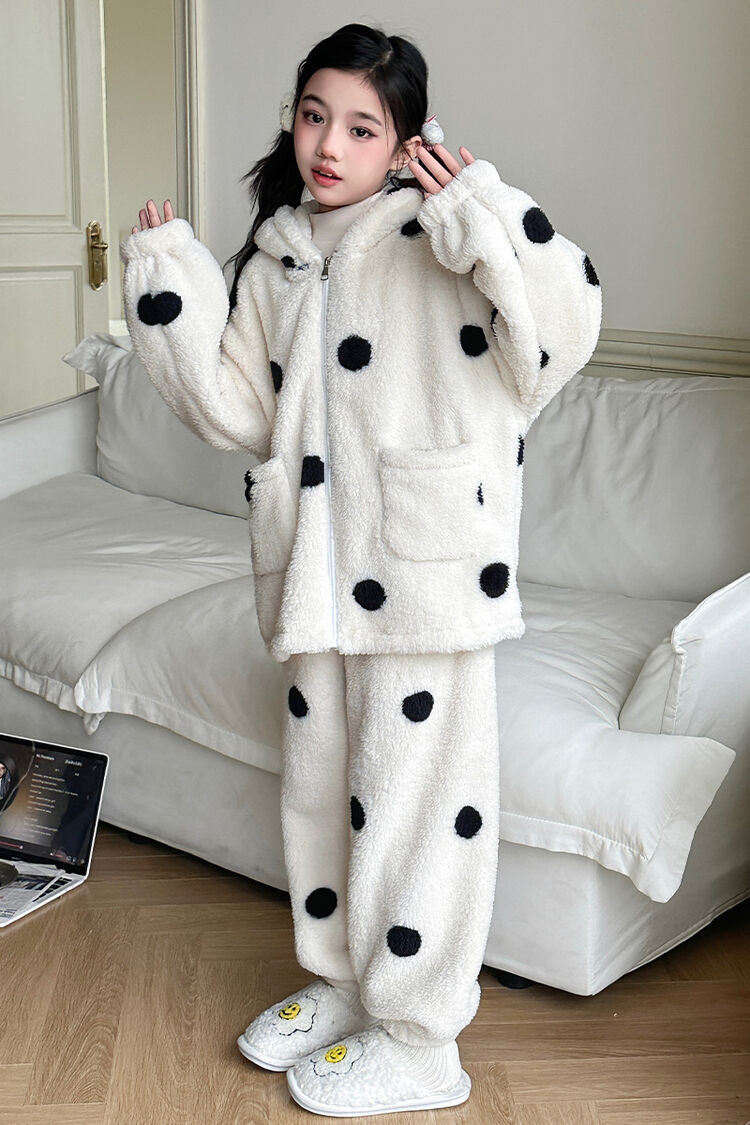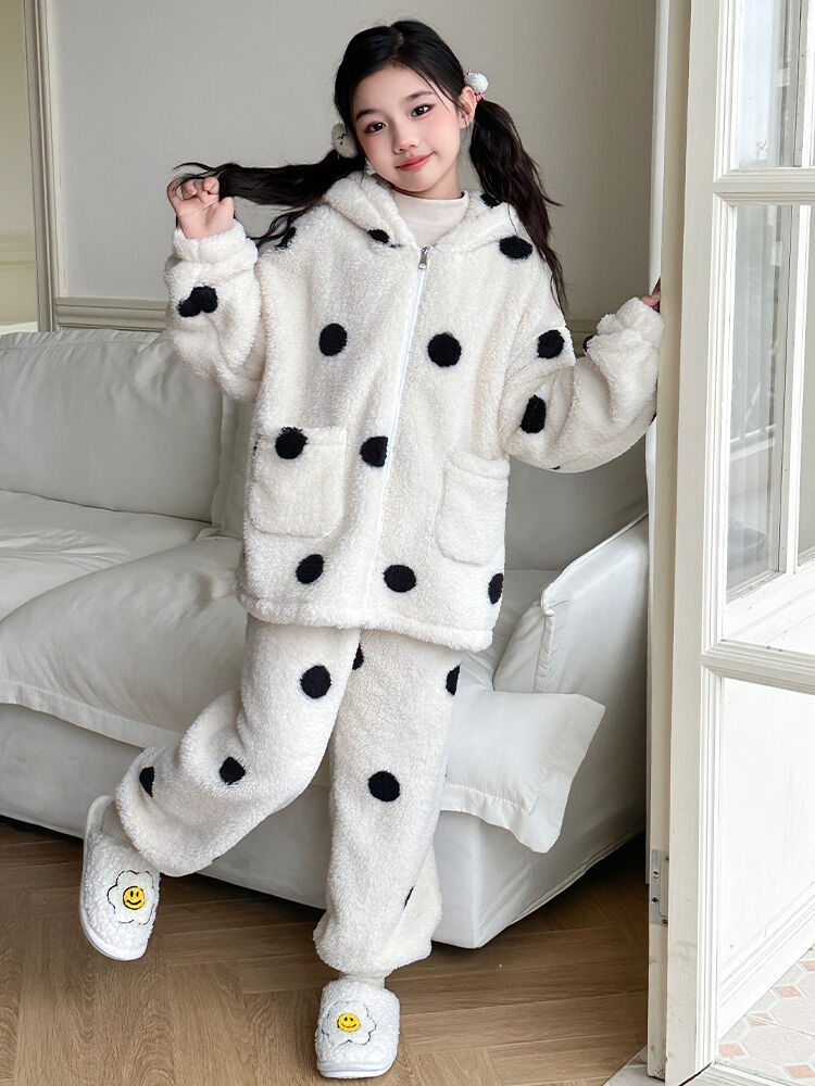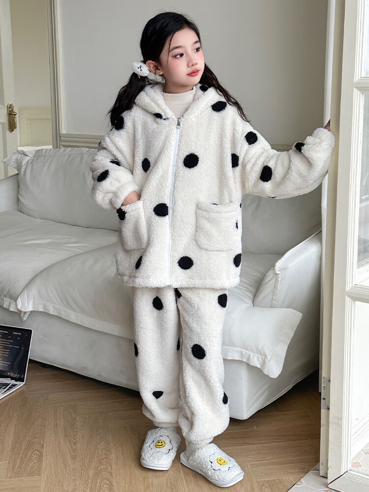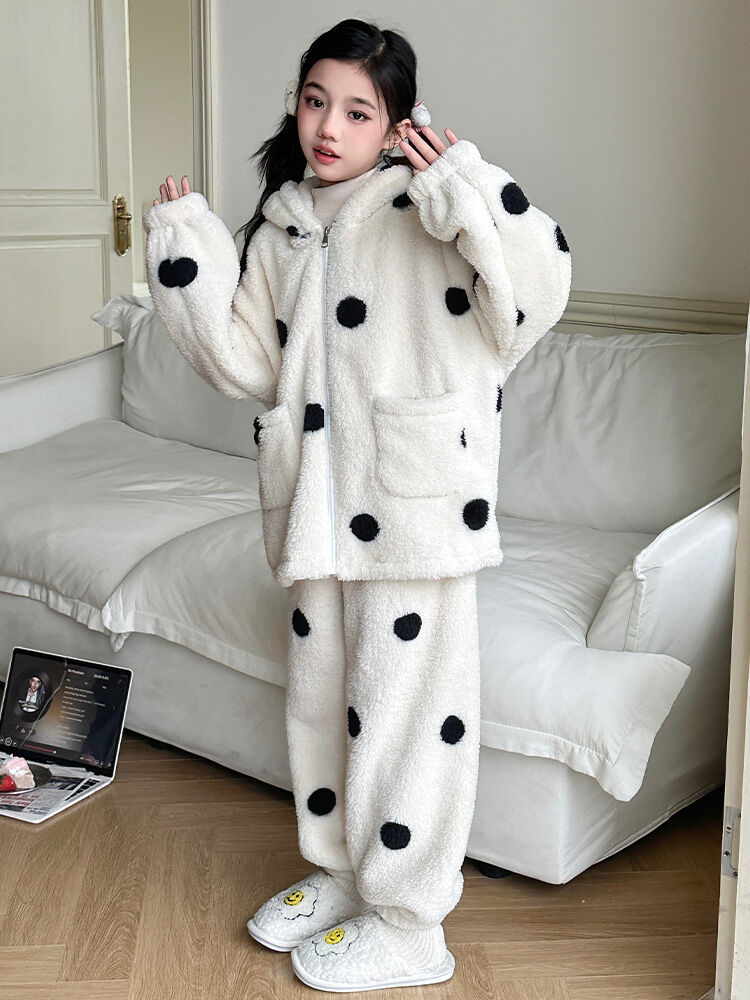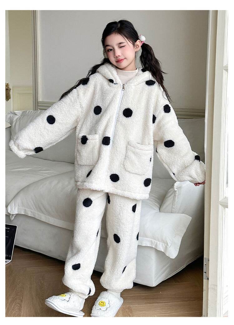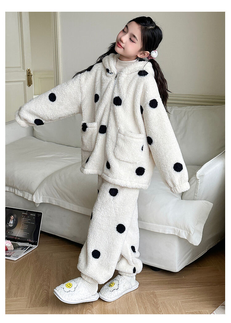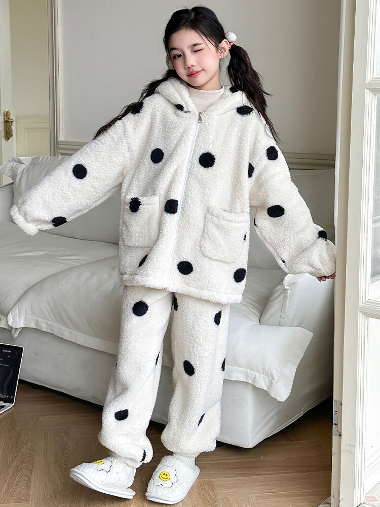 여자 후드 파자마 어린이 겨울 두꺼운 양면 양털 레오파드 무늬 홈 옷 유행 여자 따뜻한 세트 입고