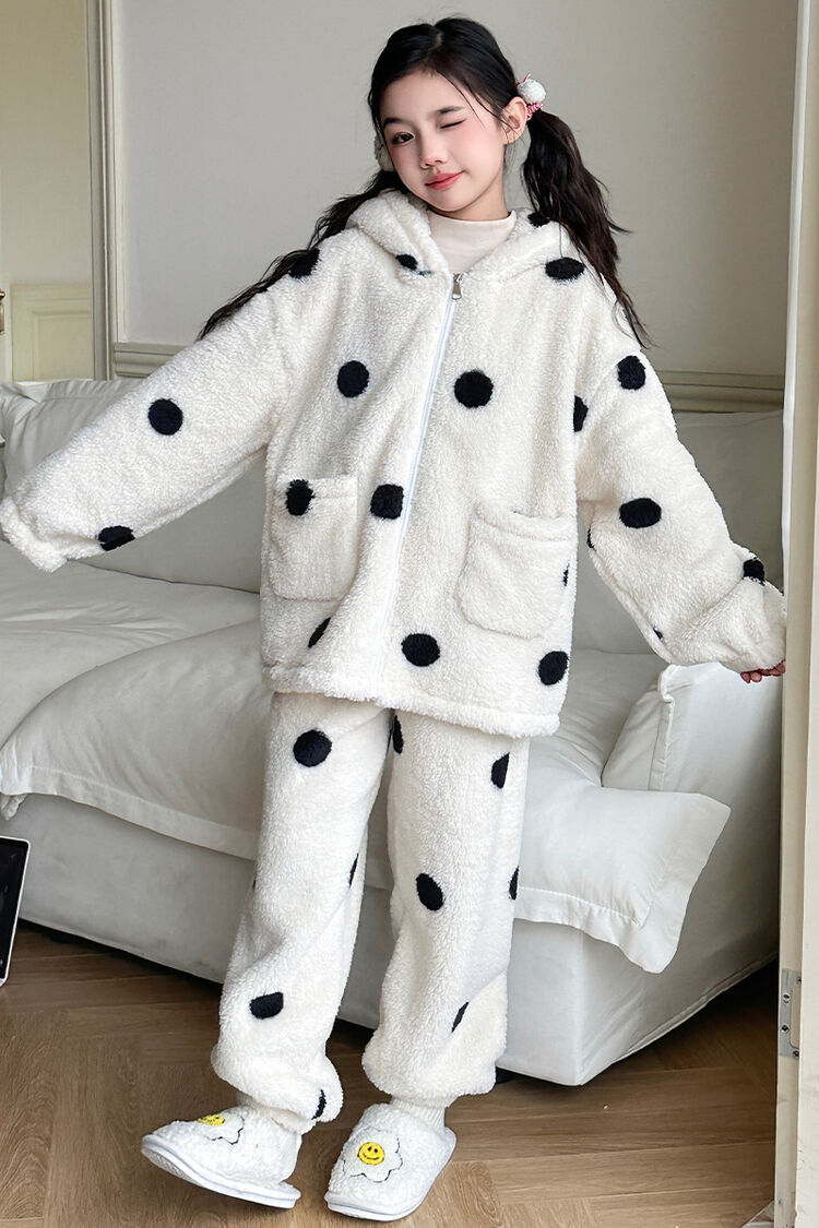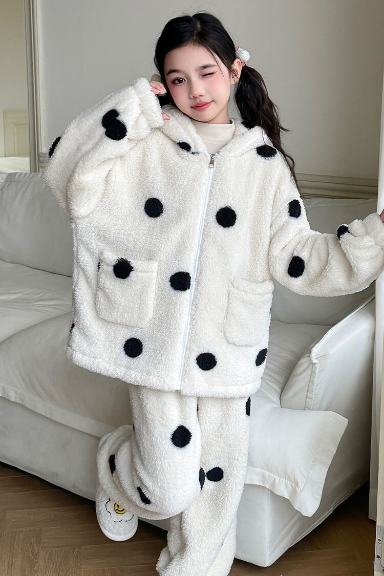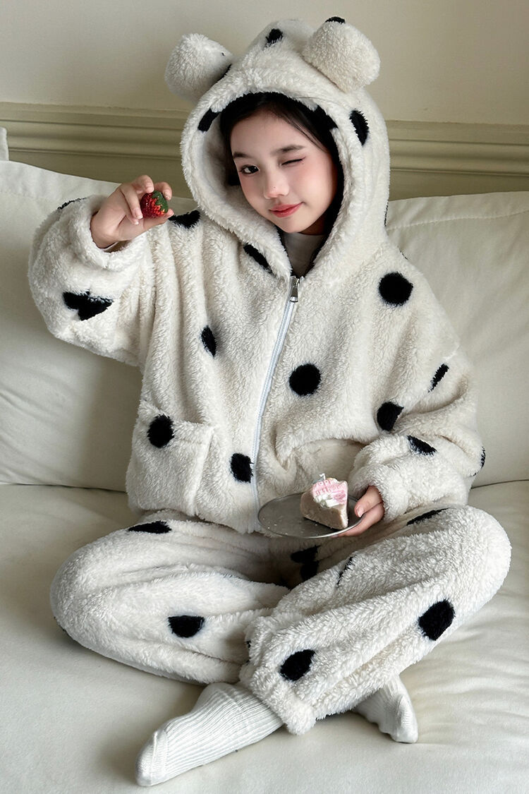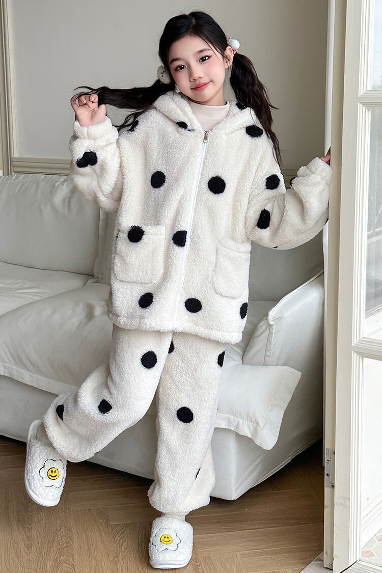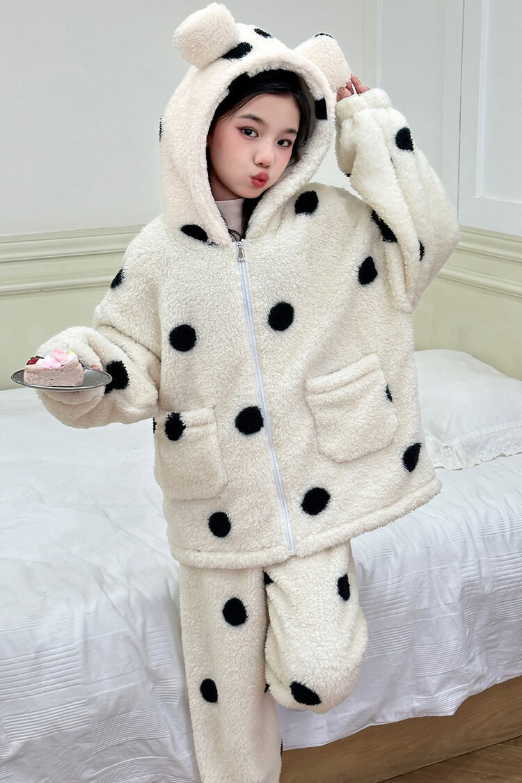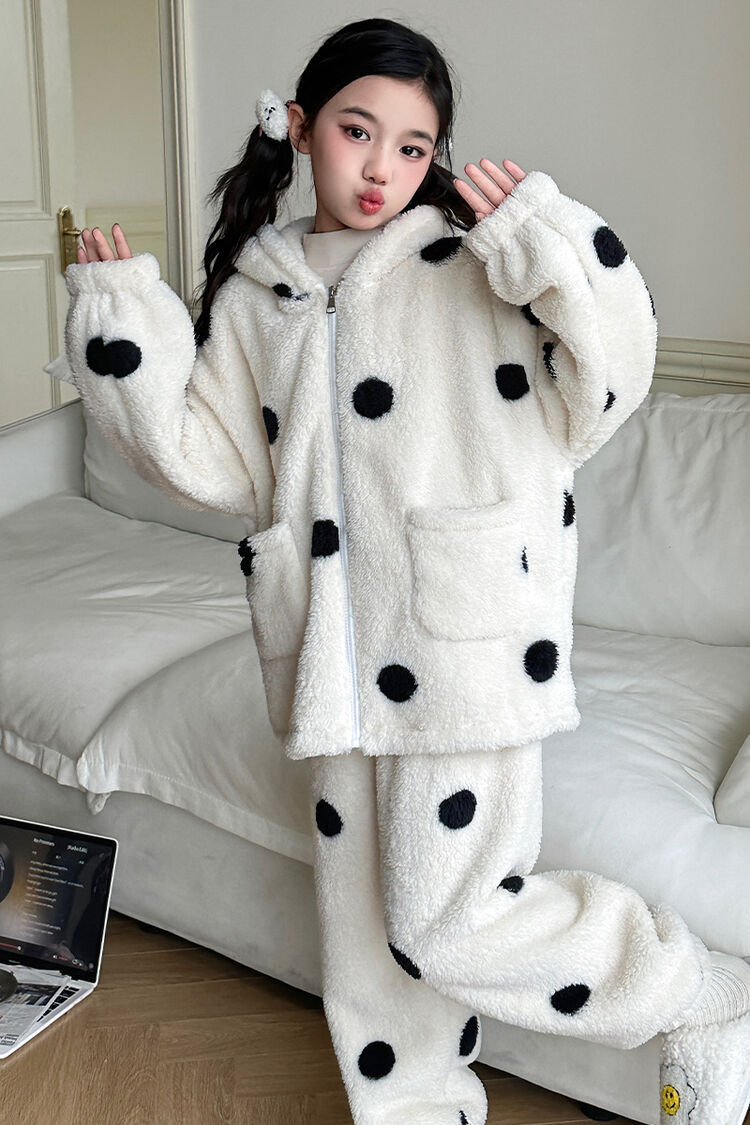 여자 후드 파자마 어린이 겨울 두꺼운 양면 양털 레오파드 무늬 홈 옷 유행 여자 따뜻한 세트 입고