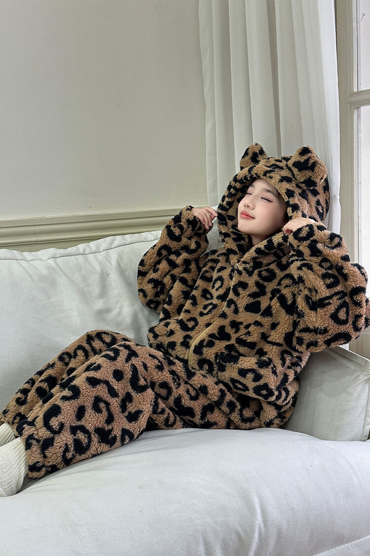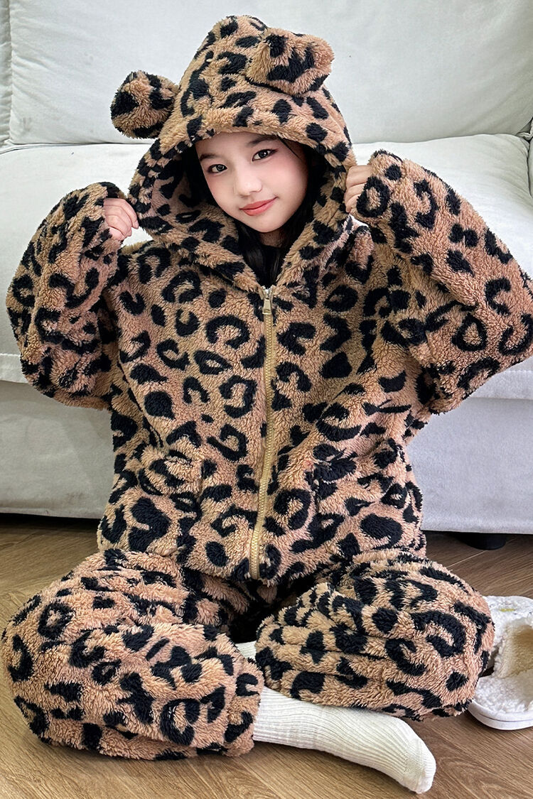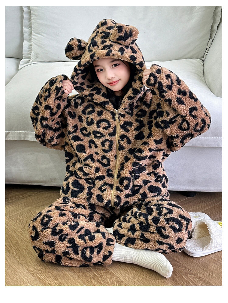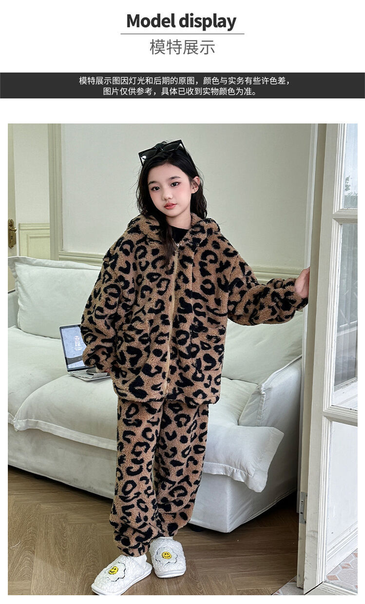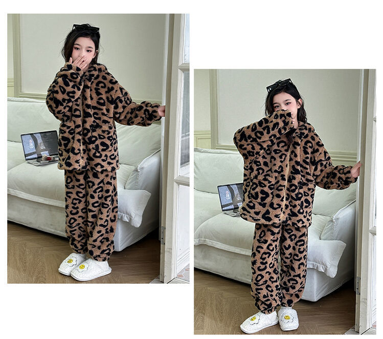 여자 후드 파자마 어린이 겨울 두꺼운 양면 양털 레오파드 무늬 홈 옷 유행 여자 따뜻한 세트 입고스토어 가기