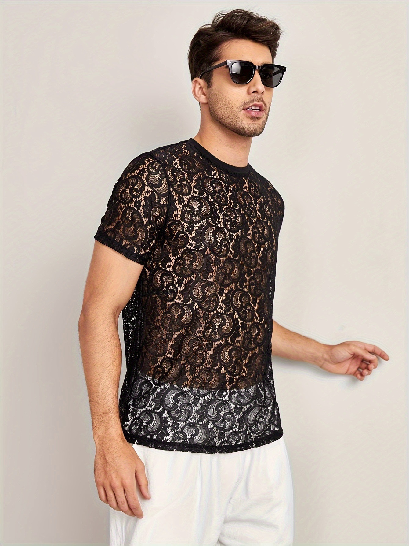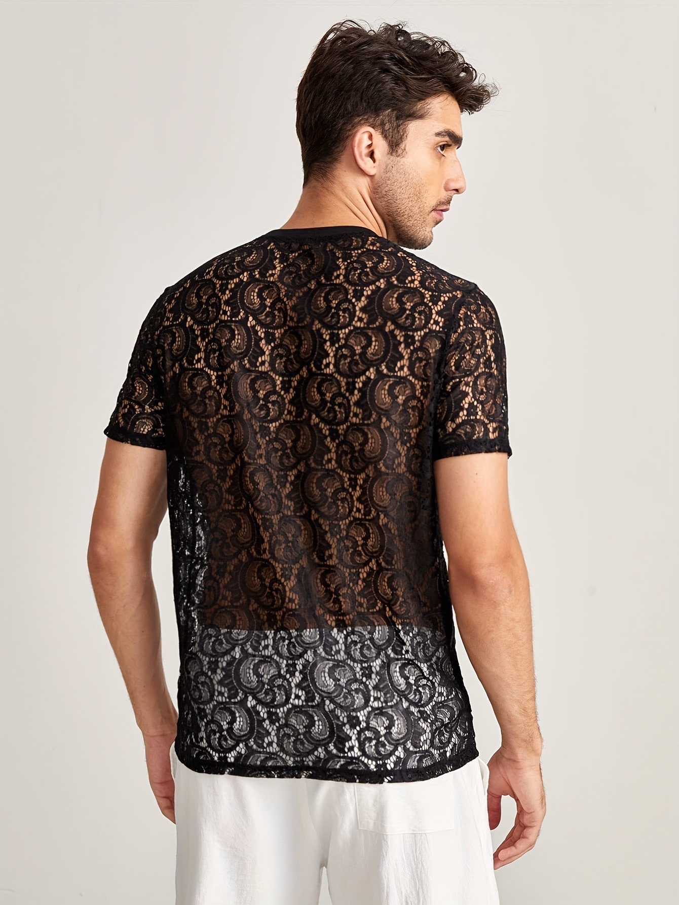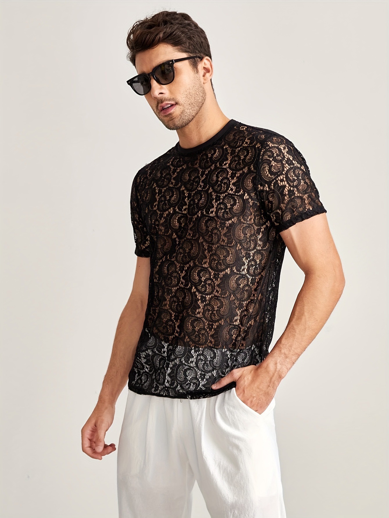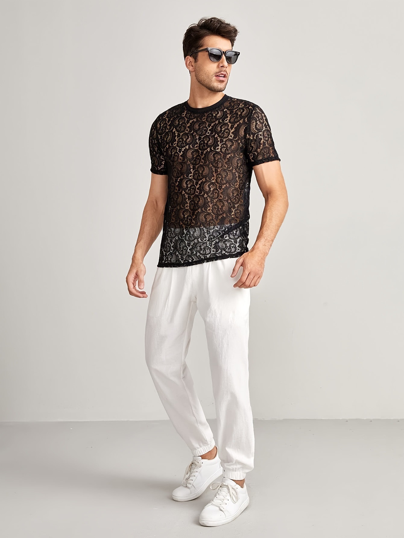 유럽과 미국의 국경 간 남자 새로운 중공 관점 라운드 넥 반팔 레이스 캐주얼 탑 티셔츠 남성 패션베이스 셔츠