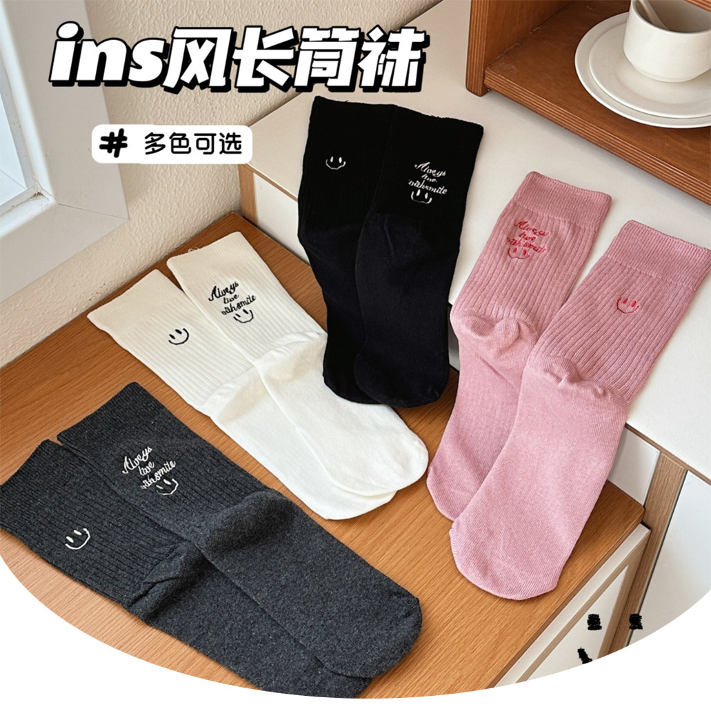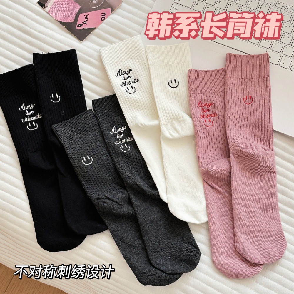 한국 조커 미드 튜브 코튼 양말 바람 귀여운 자수 단색 AB 웃는 얼굴 더미 양말 가을 스타킹 도매스토어 가기