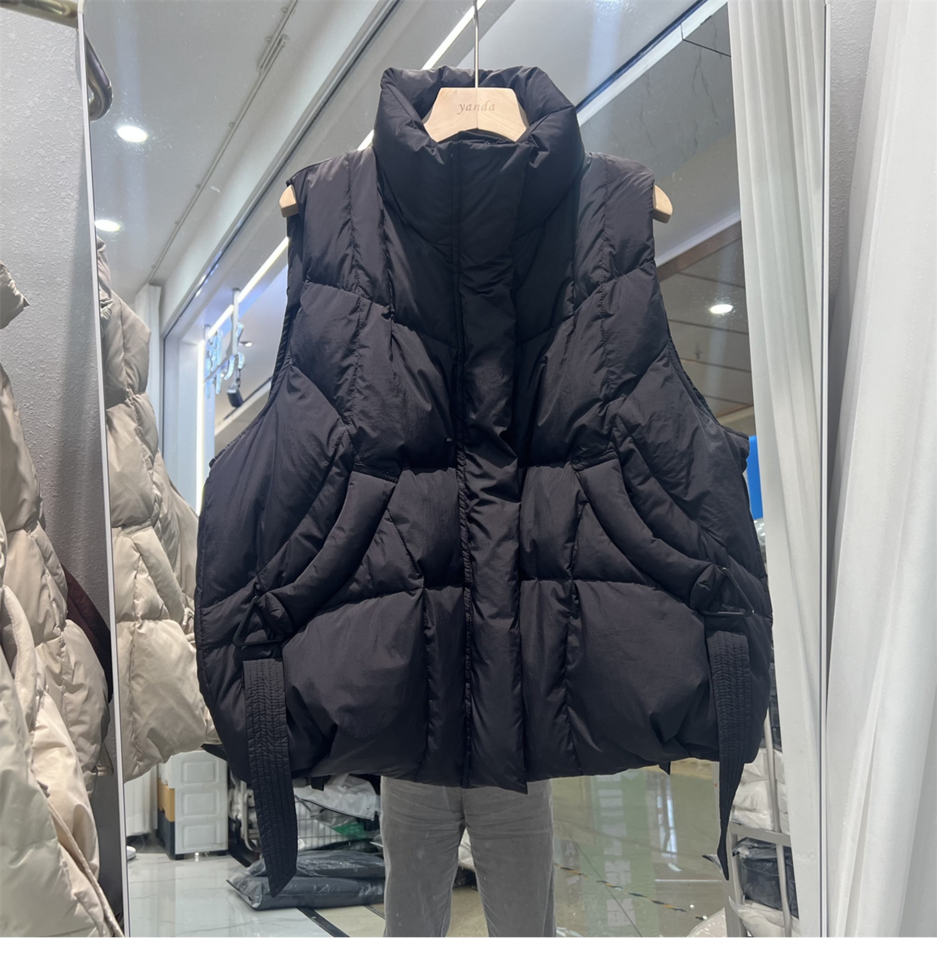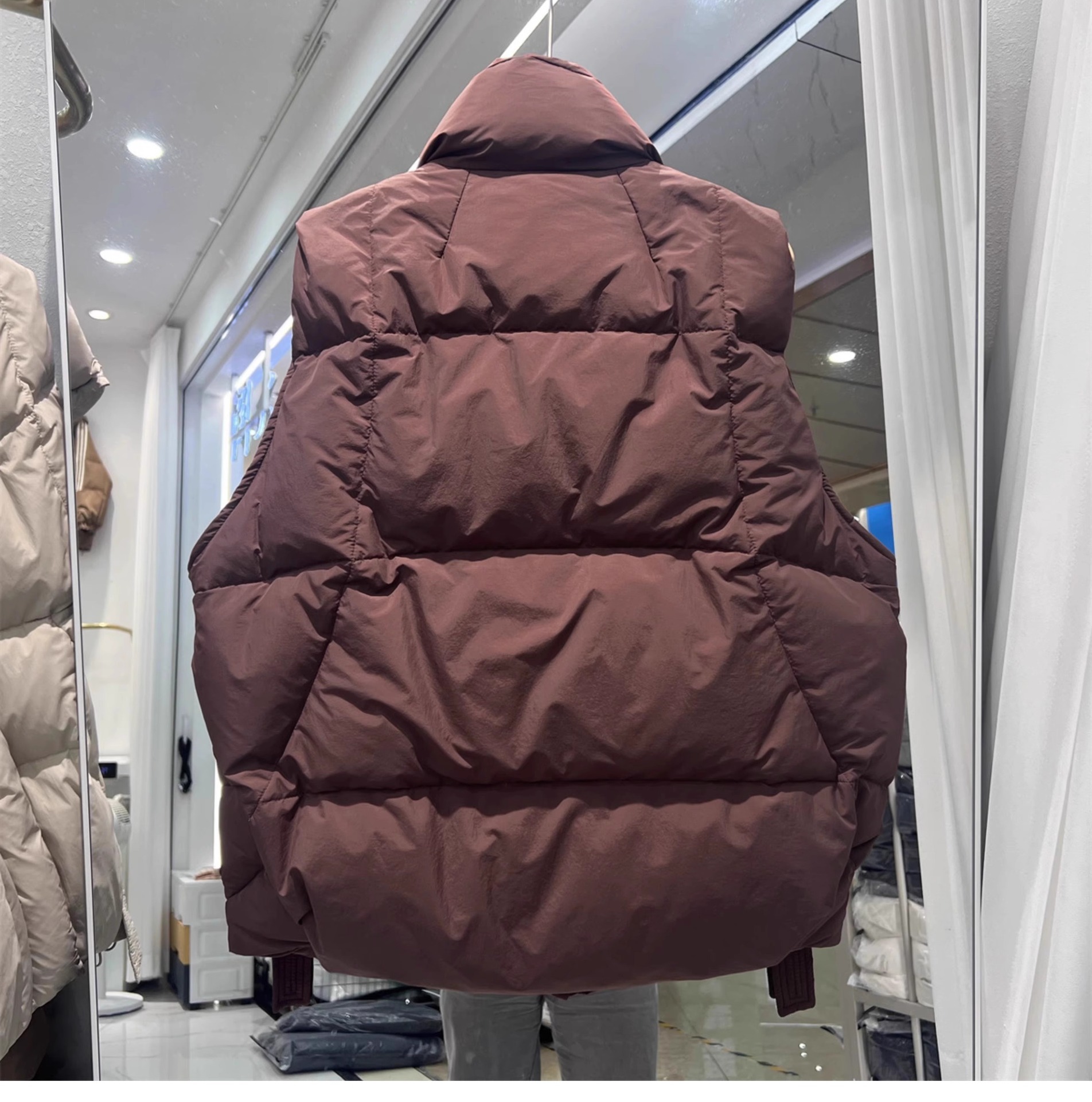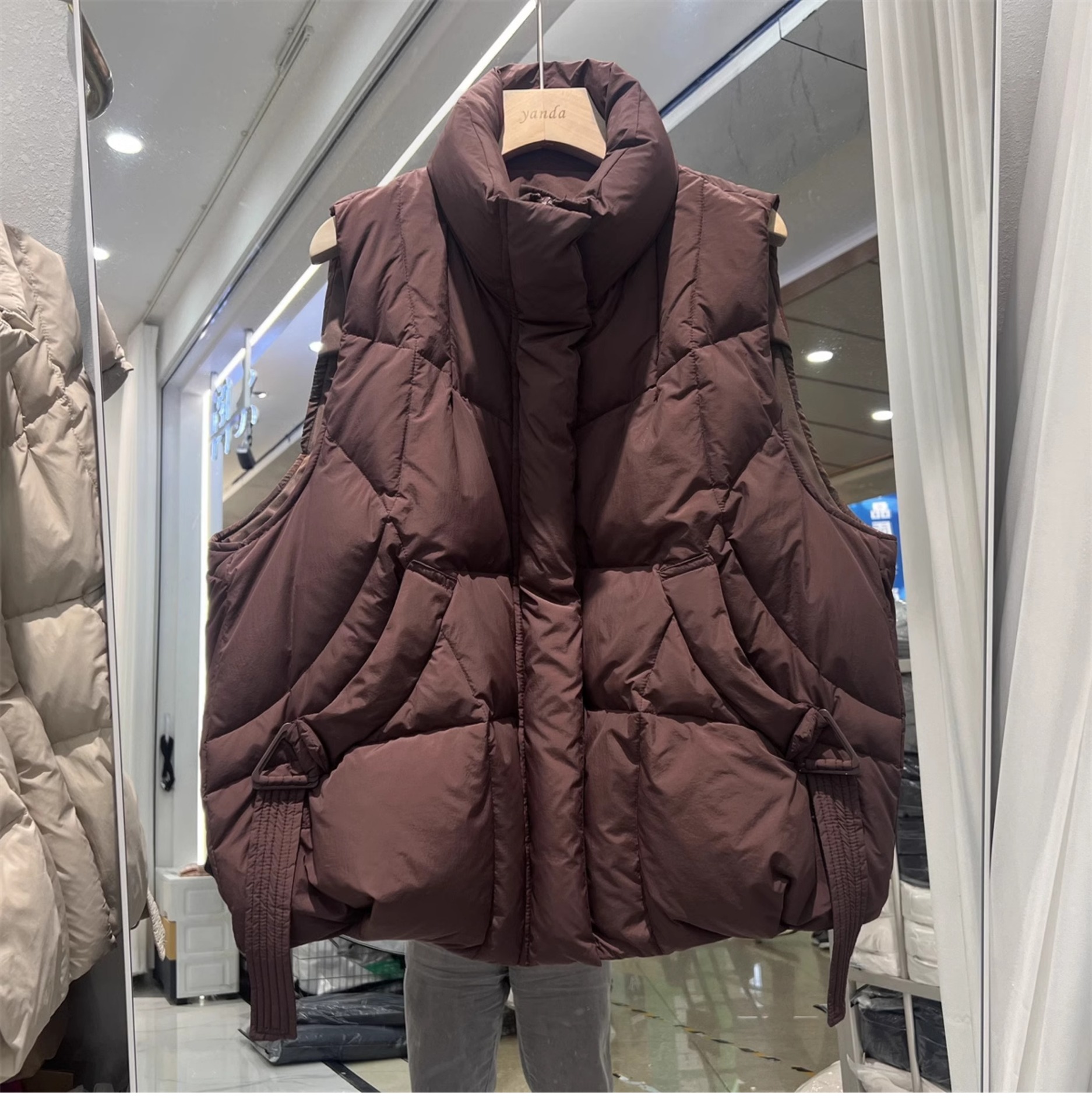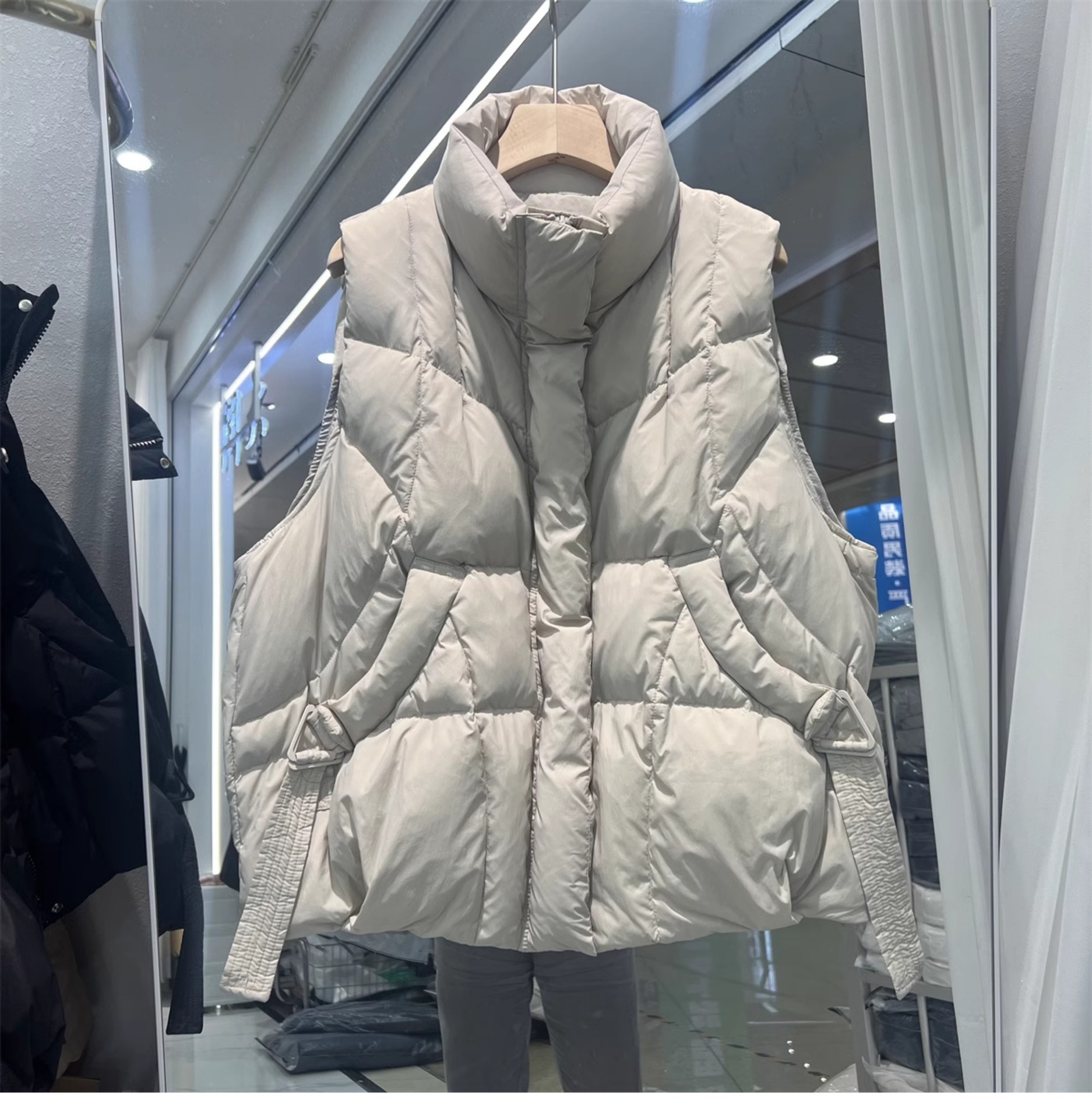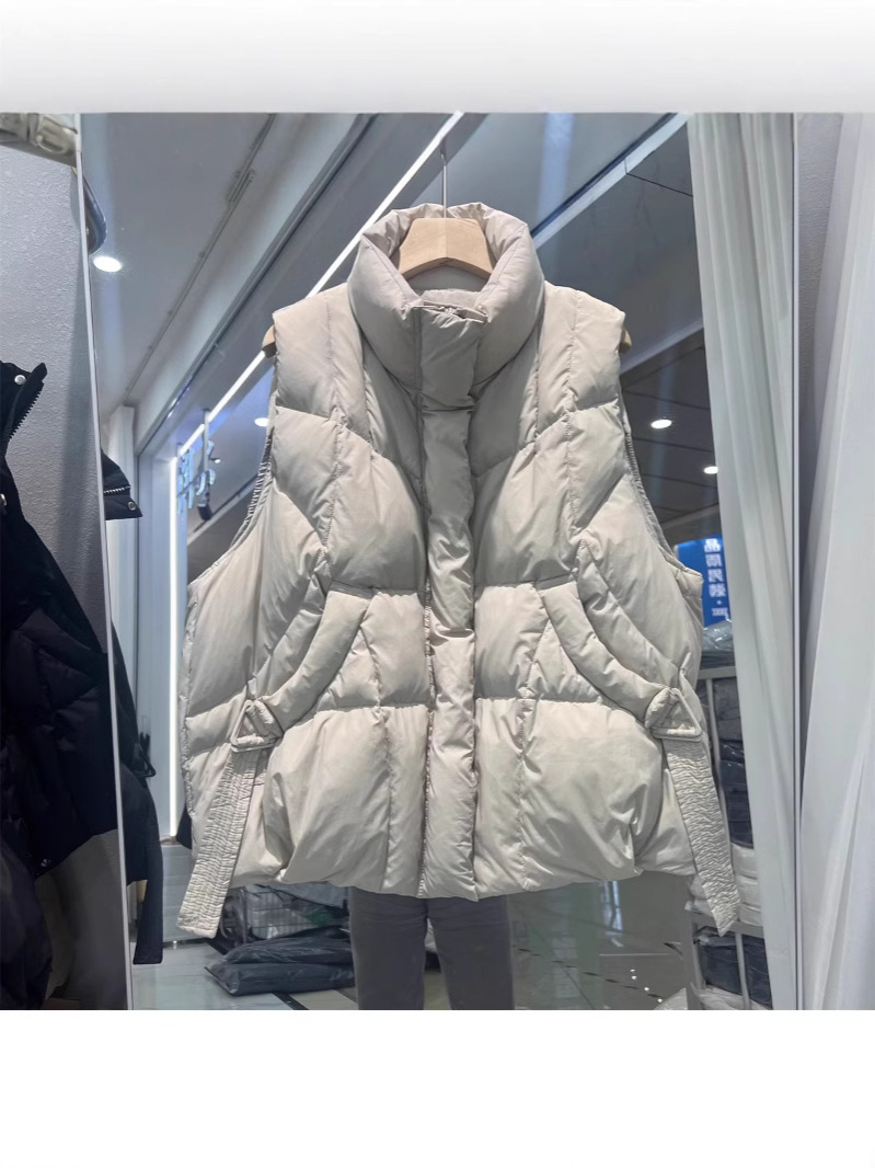 2024 겨울 새로운 짧은 재킷 조끼 여성용 수직 칼라 두꺼운 느슨한 삼각형 버클 화이트 덕 다운 조끼 재킷스토어 가기