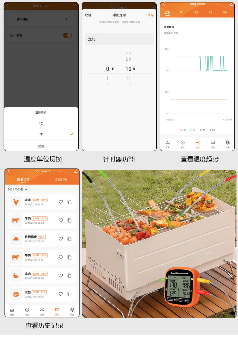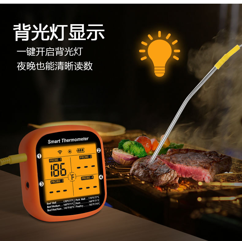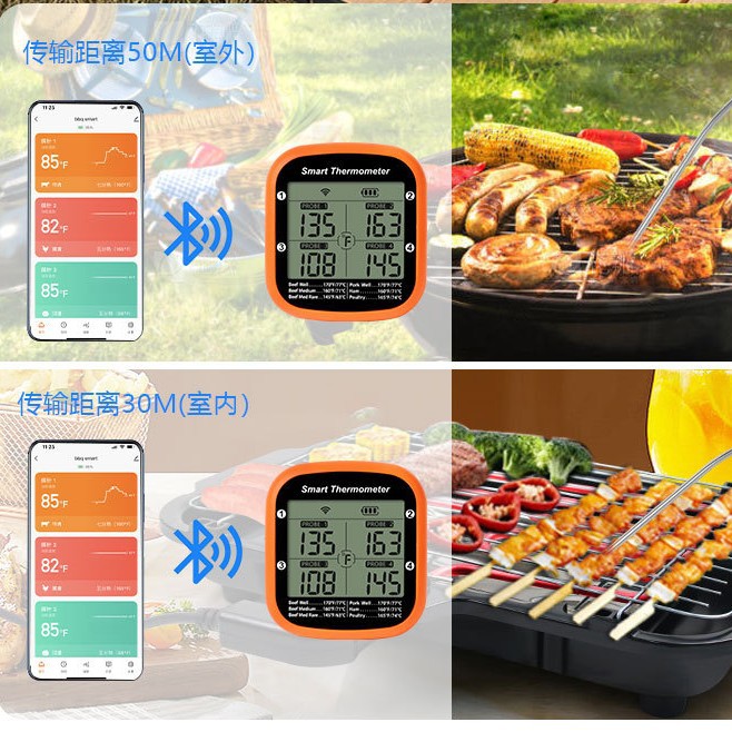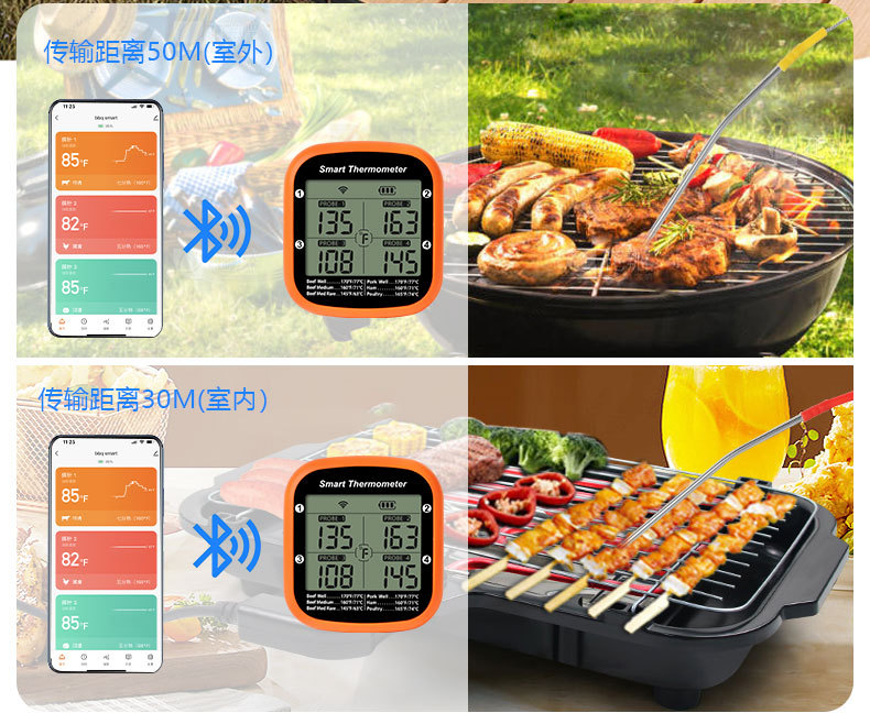 本产品支持手机APP远程监控,登录APP方便,无需账号密码,快速配对;空旷无线距离可达50米,即使不在烤炉旁边,也能读取食物的的温度,可支持1~4只探针,4只探针可同时工作。