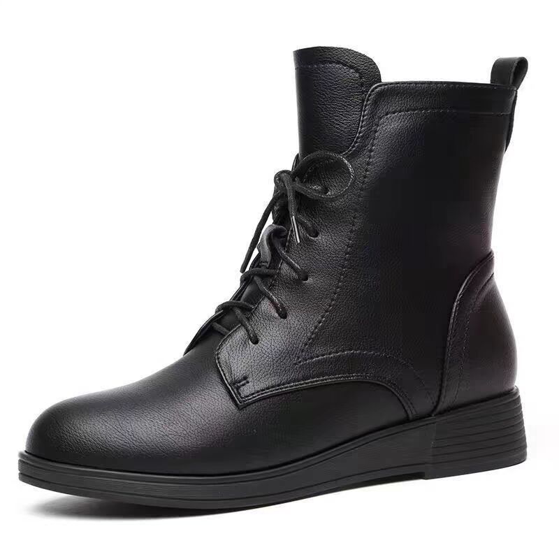 여성용 부드러운 가죽 짧은 부츠 플랫 2024 가을 겨울 신상 면화 플러스 벨벳 영국식 미드 힐 레이스 업 마틴 부츠