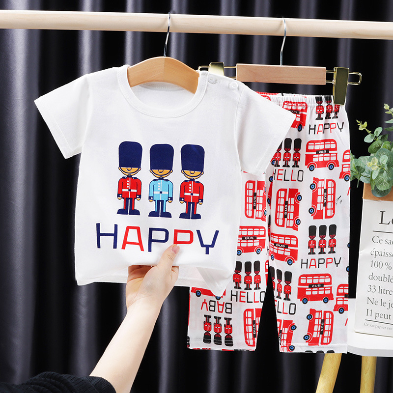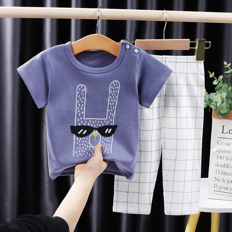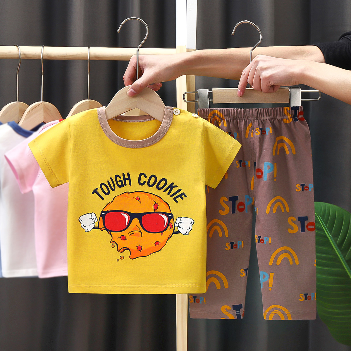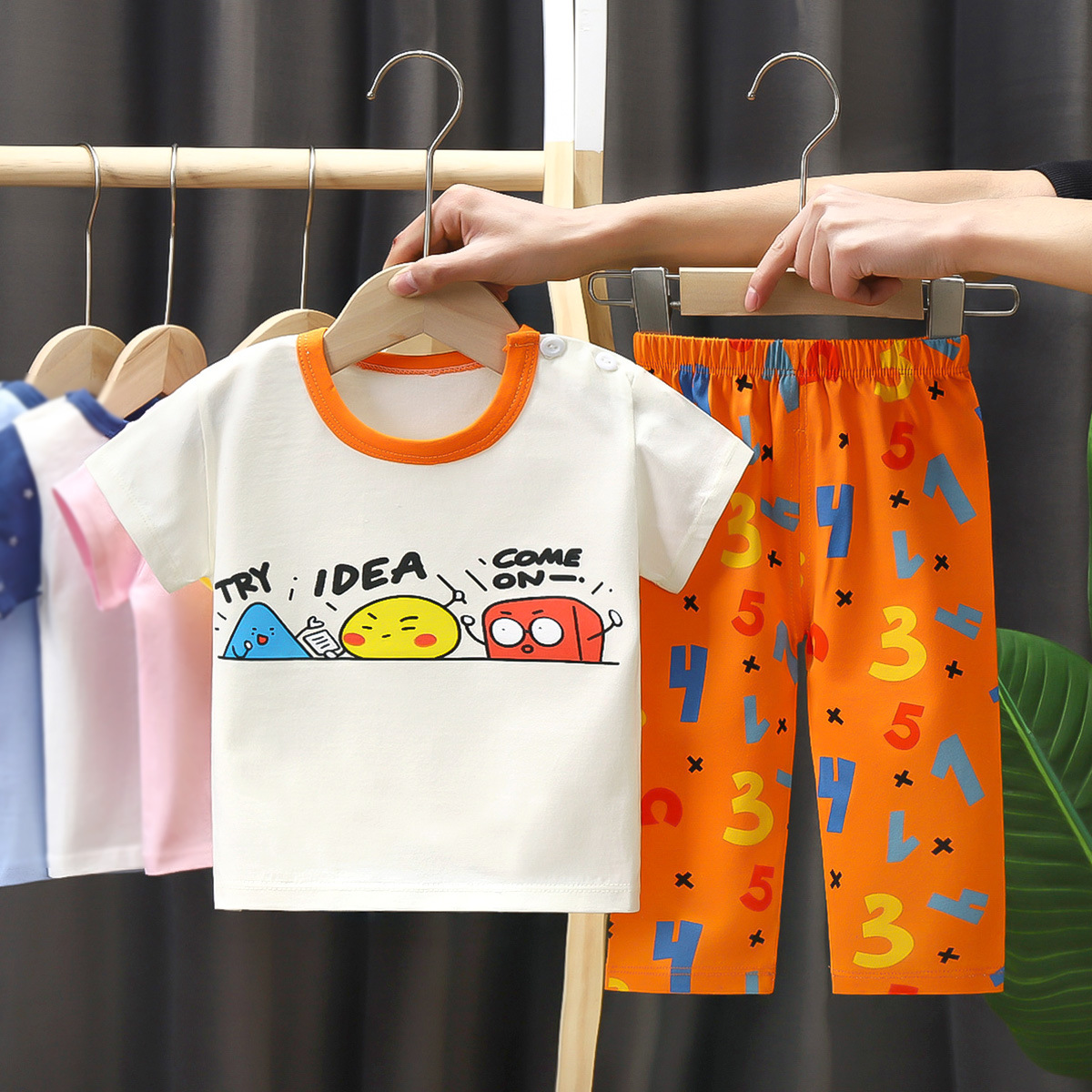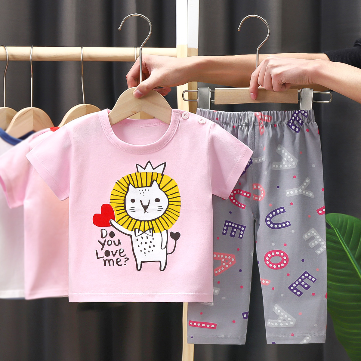 여름 어린이 의류 어린이 에어컨 의류 세트 코튼 아기의 반팔 티셔츠 바지 홈 의류 소년 소녀를위한 파자마스토어 가기