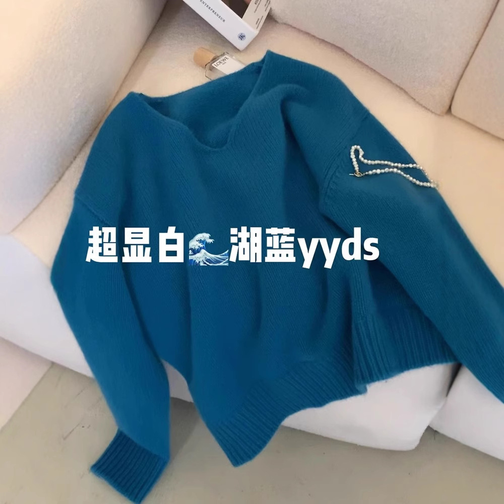 今年流行漂亮显白蓝色v领毛衣浣熊绒软糯针织衫上衣女秋冬打底