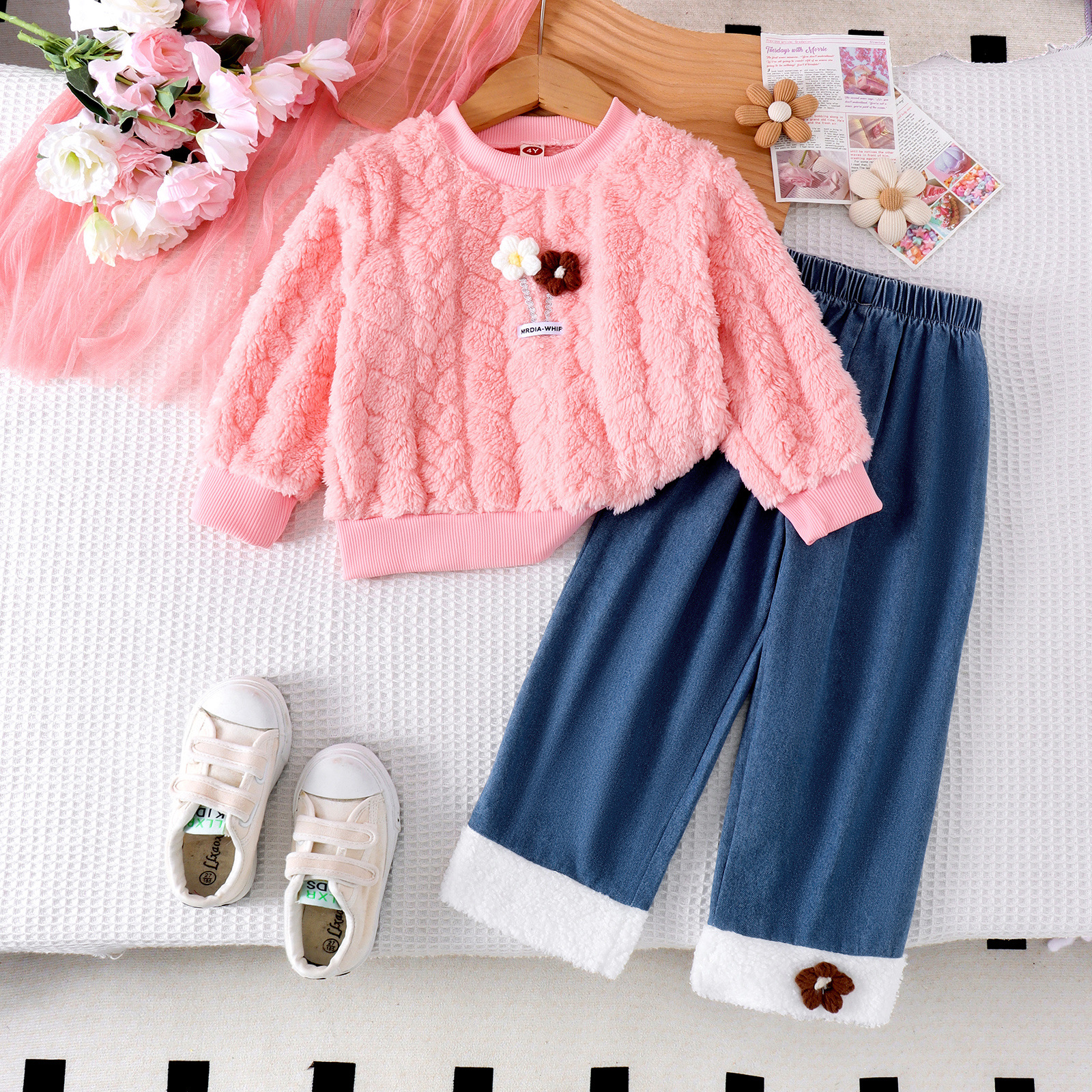 24 국경 간 대외 무역 유럽과 미국 소녀 라운드 목 3 차원 꽃 마오 마오 핑크 최고 모방 데님 바지 어린이 세트
