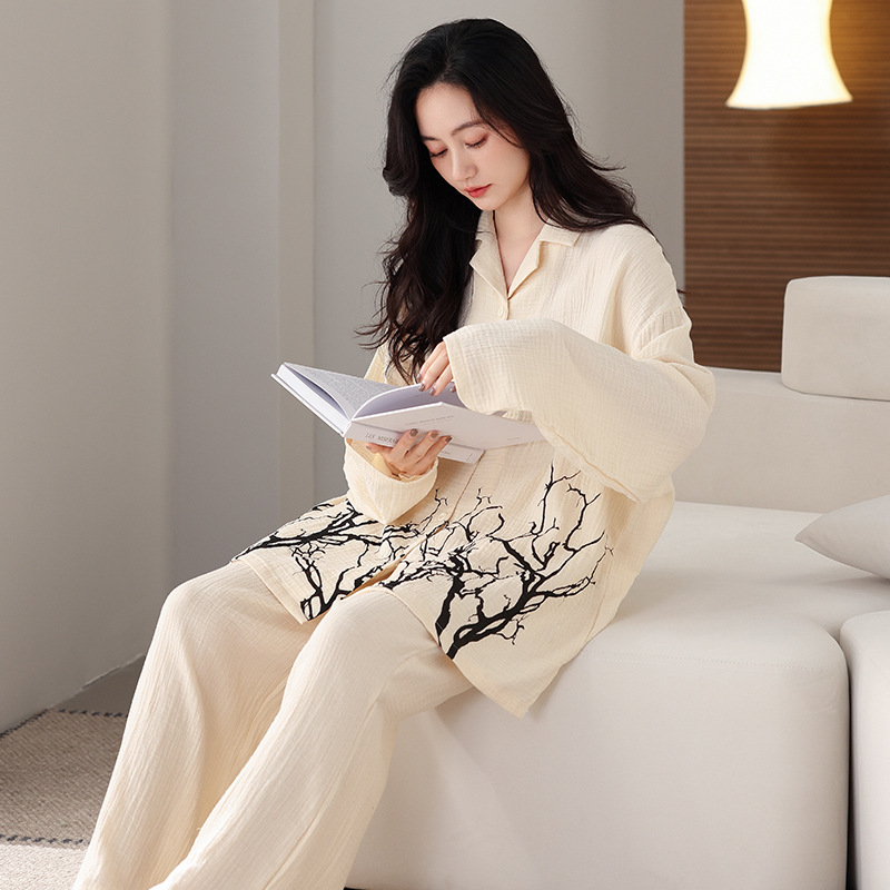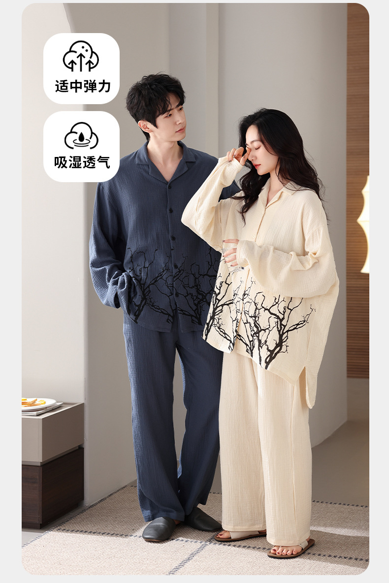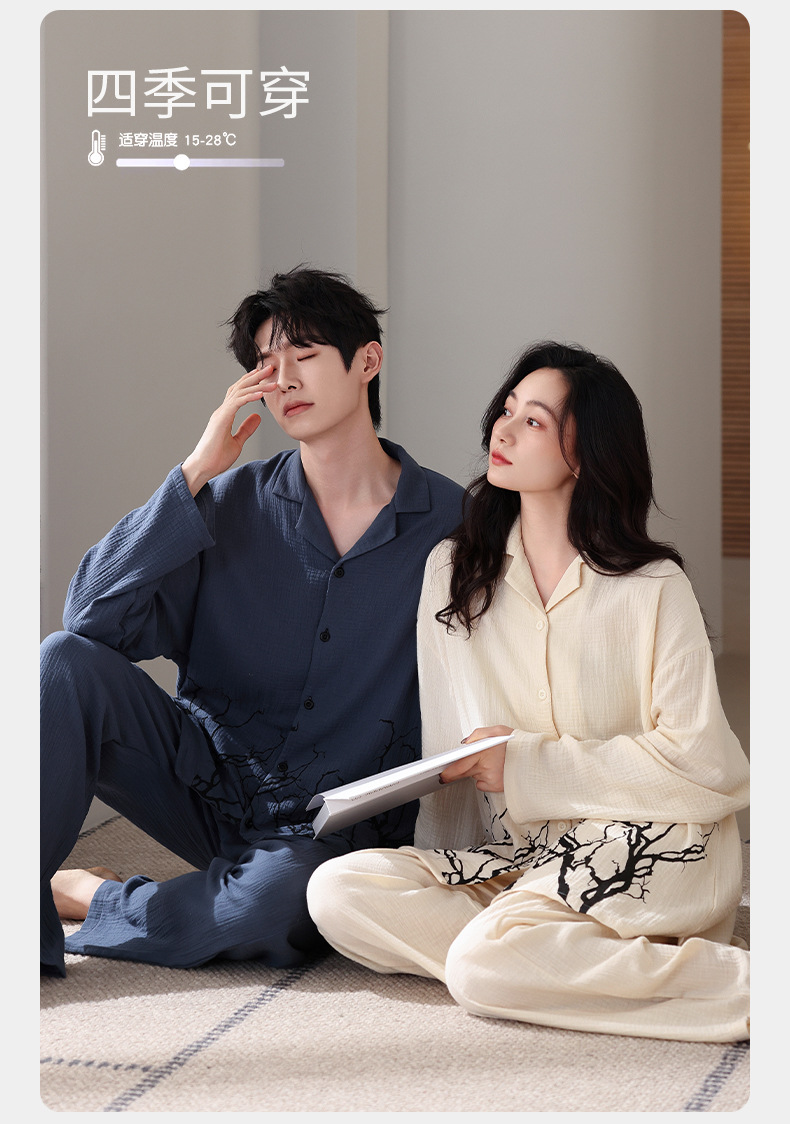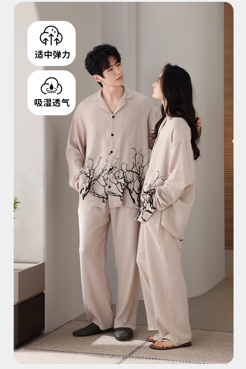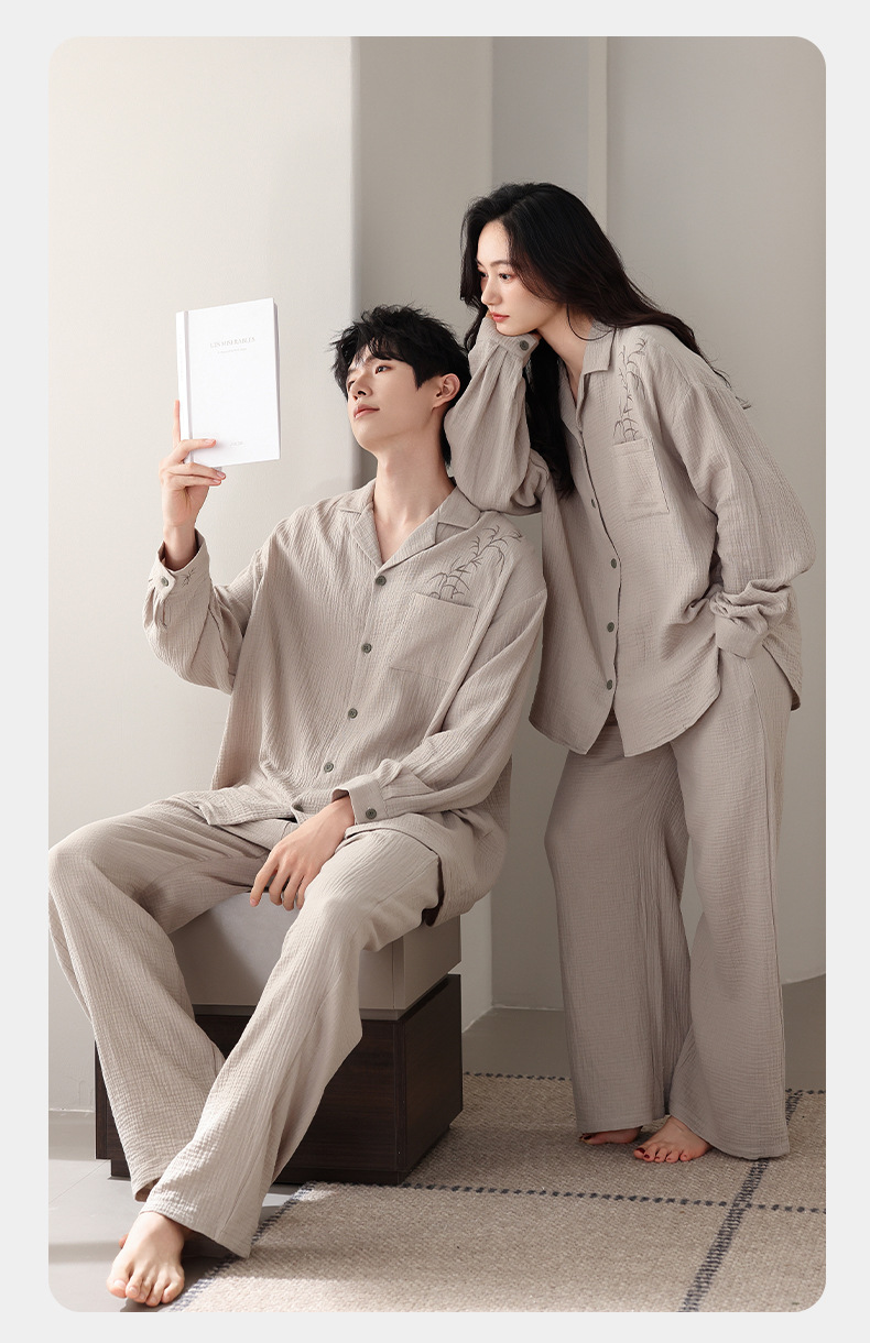 커플 잠옷 봄과 가을 짠 코튼 거즈 긴팔 홈 의류 느슨한 캐주얼 의류 남녀 세트스토어 가기
