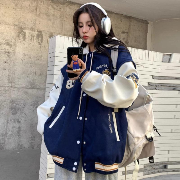 미국 복고풍 야구 세트 코트 여자 2024 새로운 가을과 겨울 특대 학생 느슨한 후드 재킷