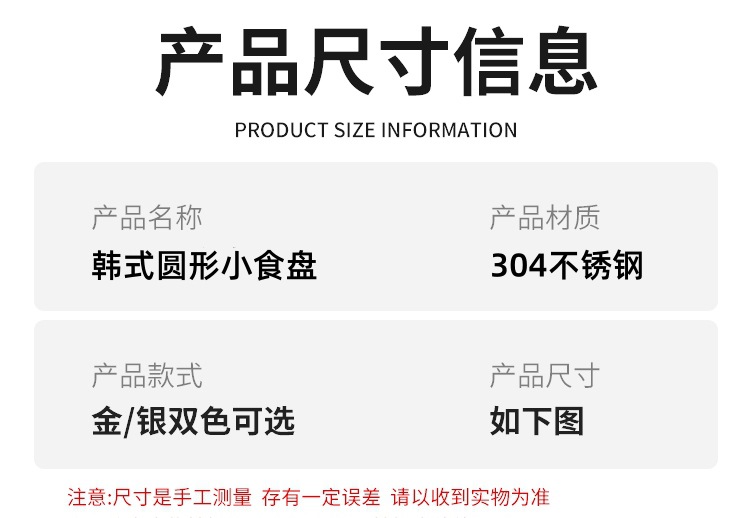 한국식 304 스테인레스 스틸 바이노럴 스낵 플레이트 레스토랑 샐러드 플레이트 차가운 접시 캔디 플레이트 디저트 트레이 디스크 골드스토어 가기