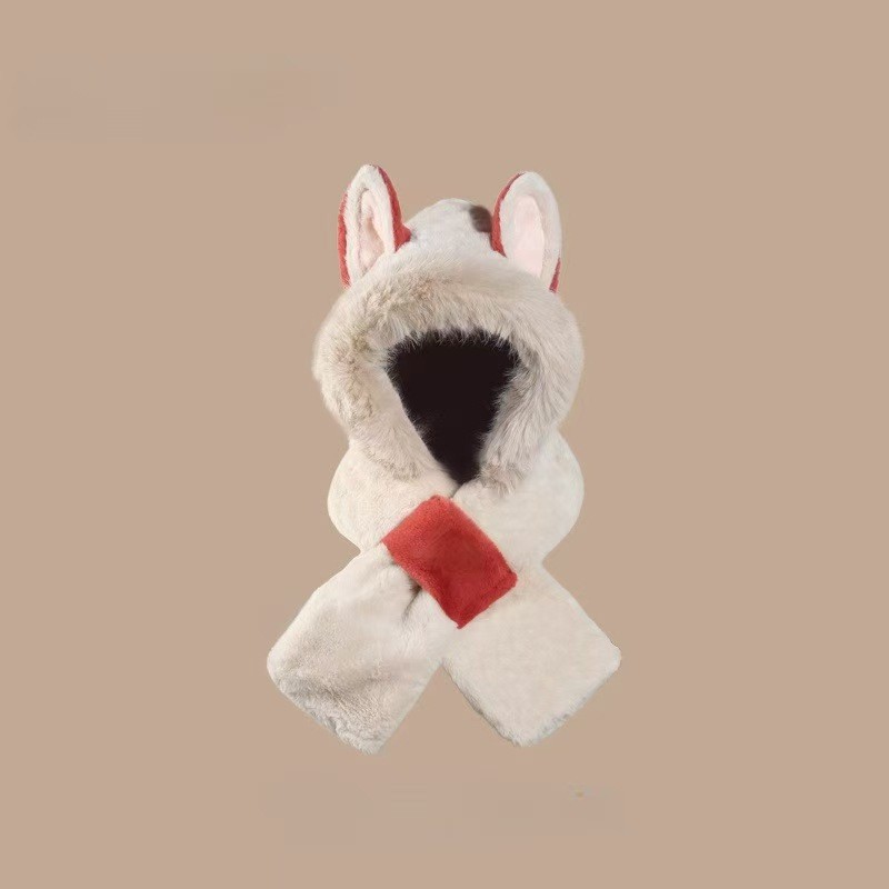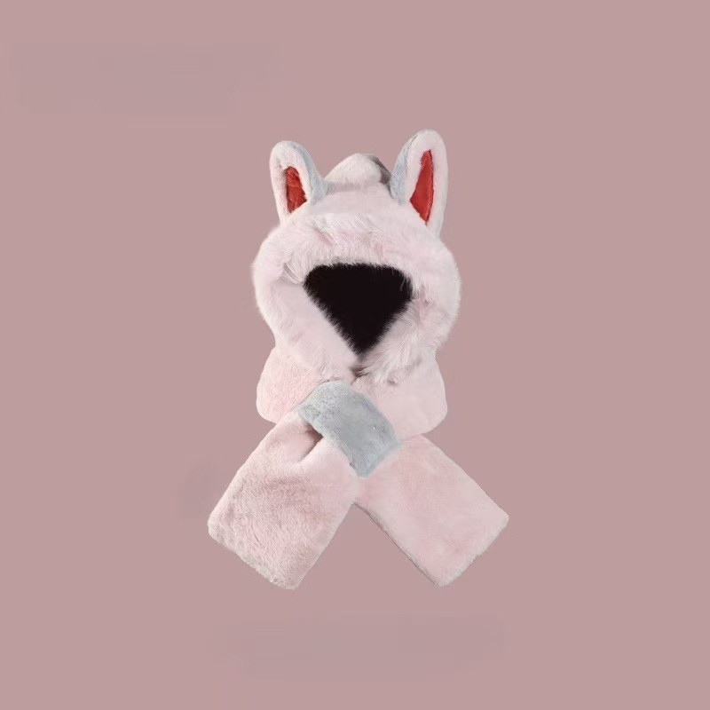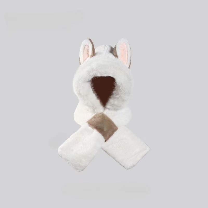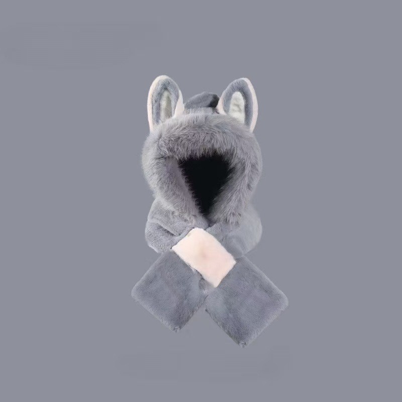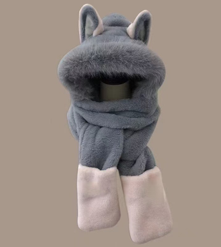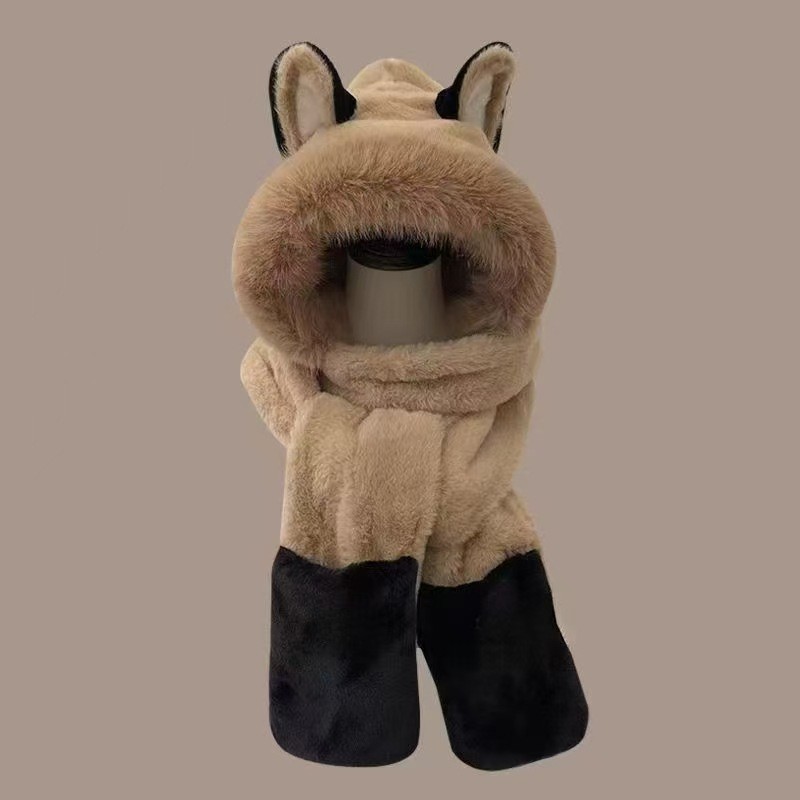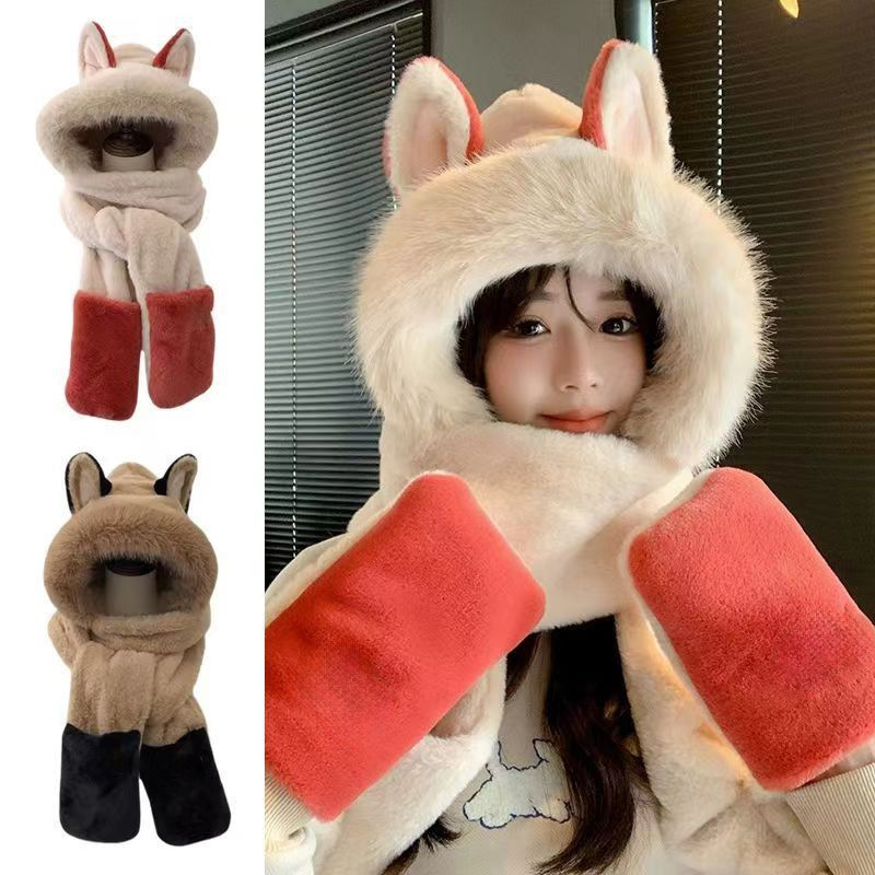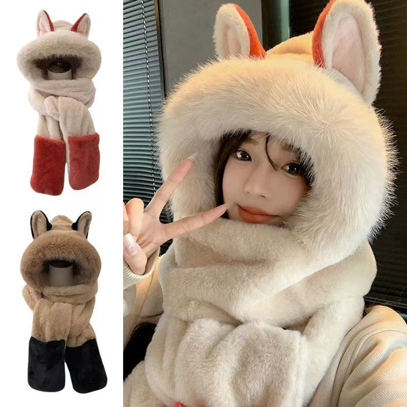 폭스 모피 모자 스카프 장갑 올인원 여성용 겨울 스카프 후드 귀여운 따뜻한 모자 플러시 겨울 3 피스 세트