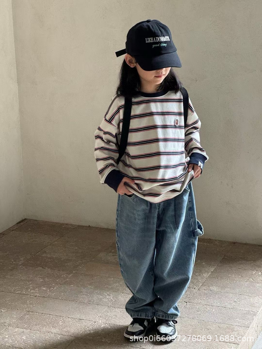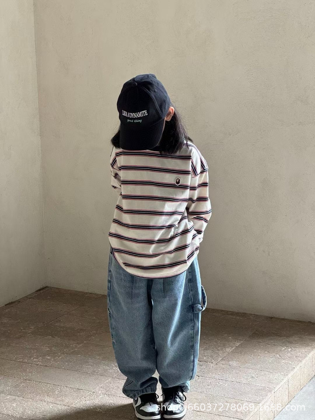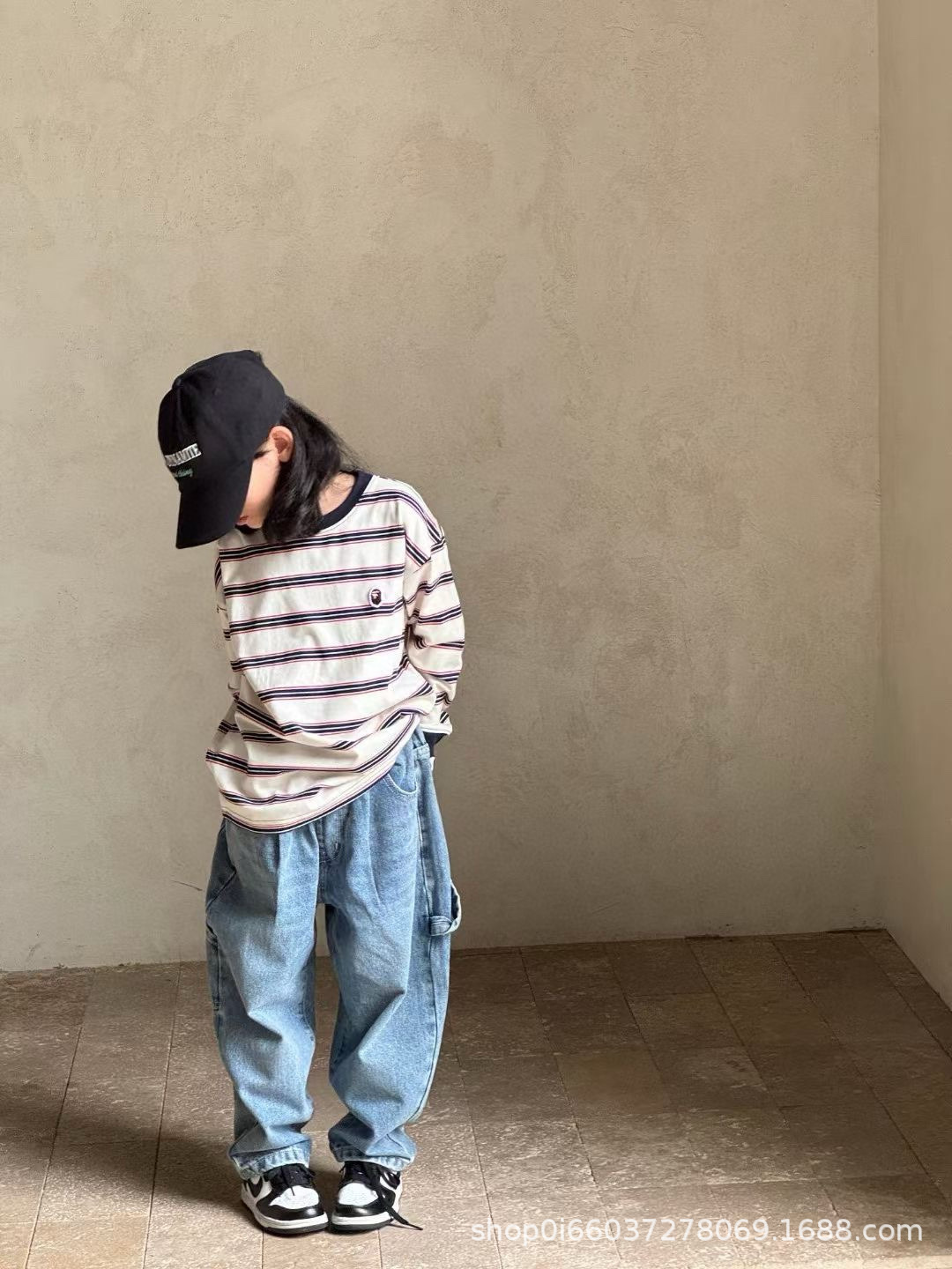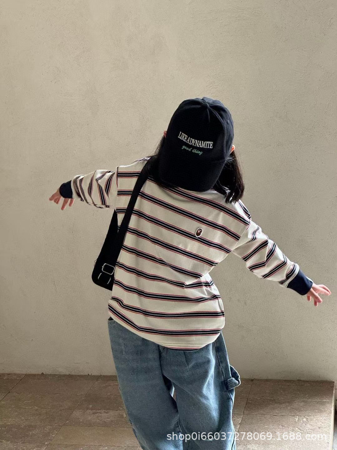 줄무늬 조종 가을 소년 아기 소년의 간단한 자수 라벨 원사 염색 긴 소매 느슨한 크루 넥베이스 셔츠