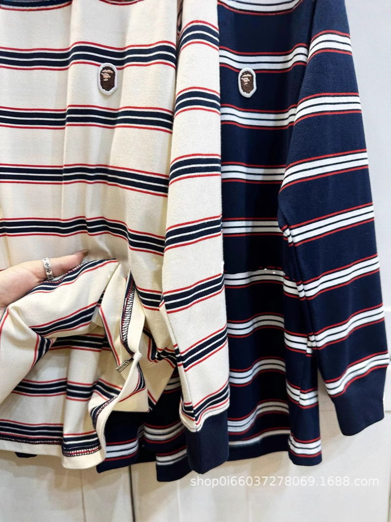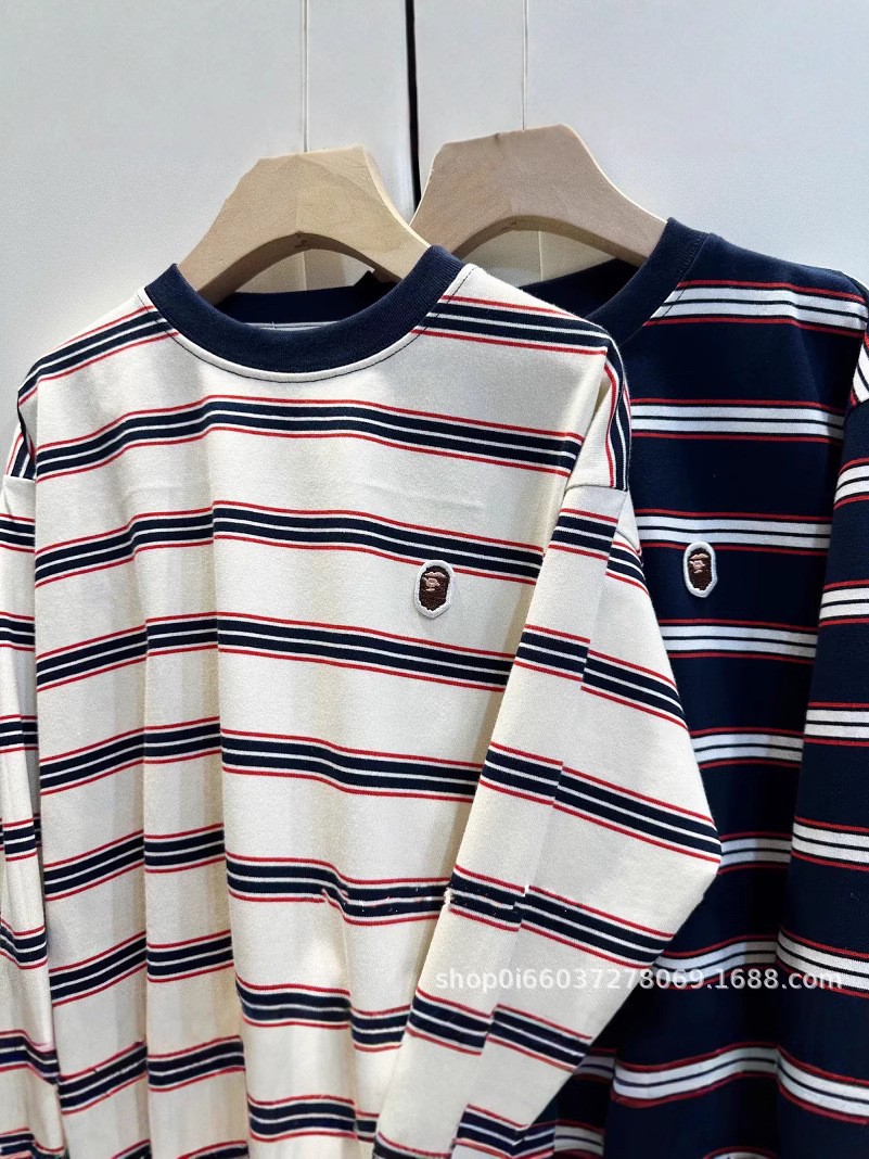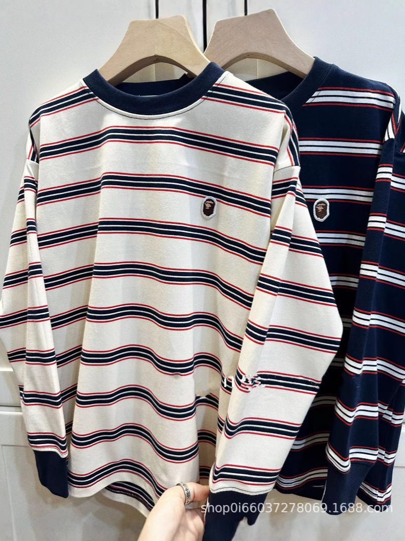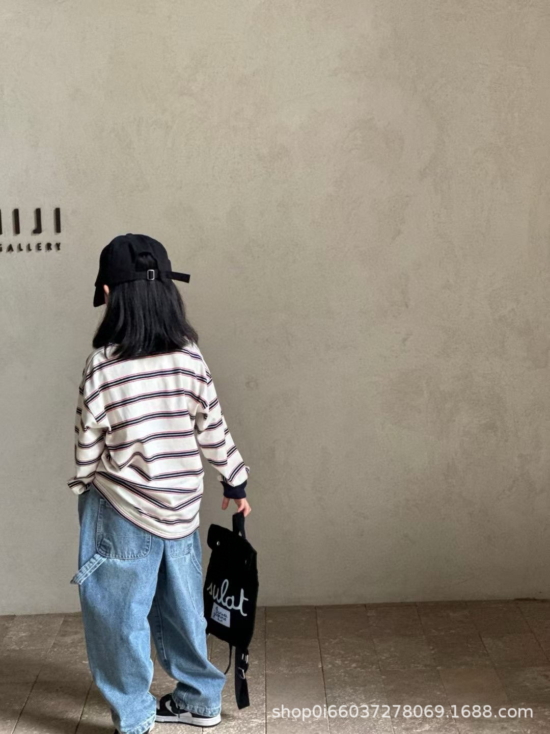 줄무늬 조종 가을 소년 아기 소년의 간단한 자수 라벨 원사 염색 긴 소매 느슨한 크루 넥베이스 셔츠