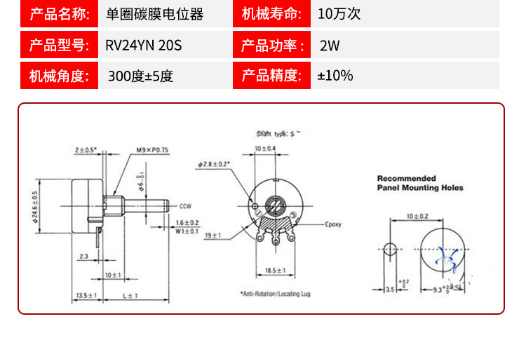 단일 회전 탄소 필름 전위차계 조정 가능한 저항 RV24YN20S B103 B502 1K 2K 5K 10K 노브