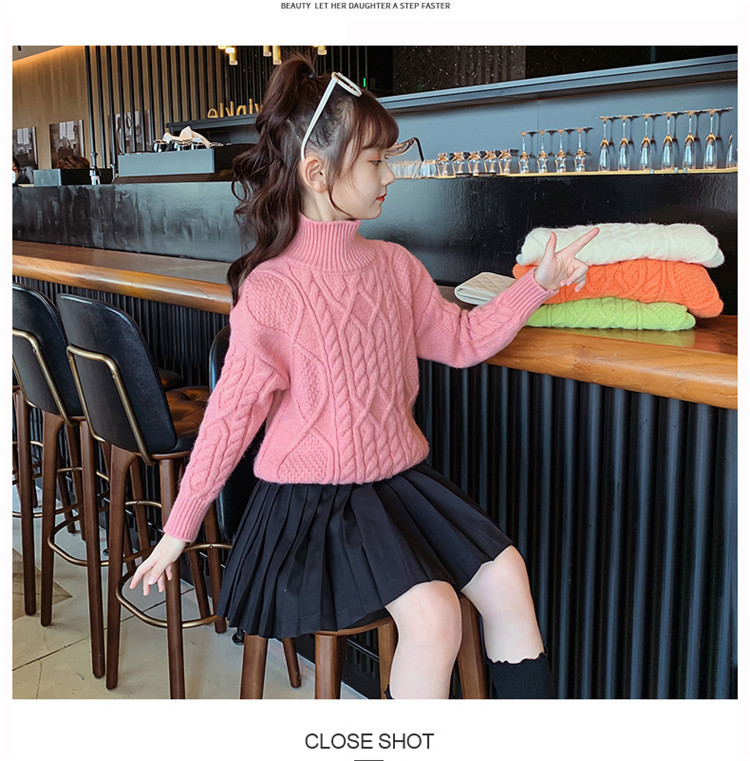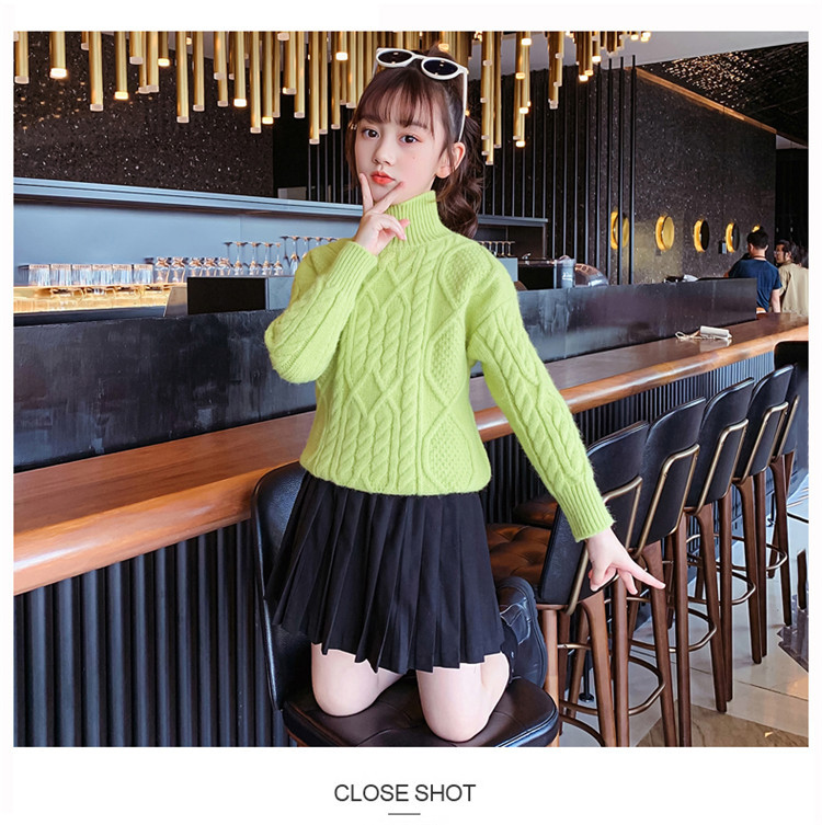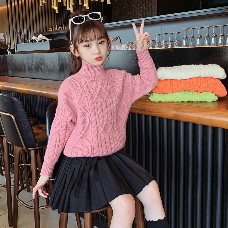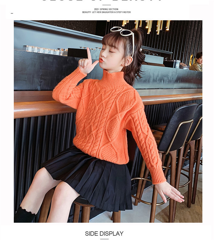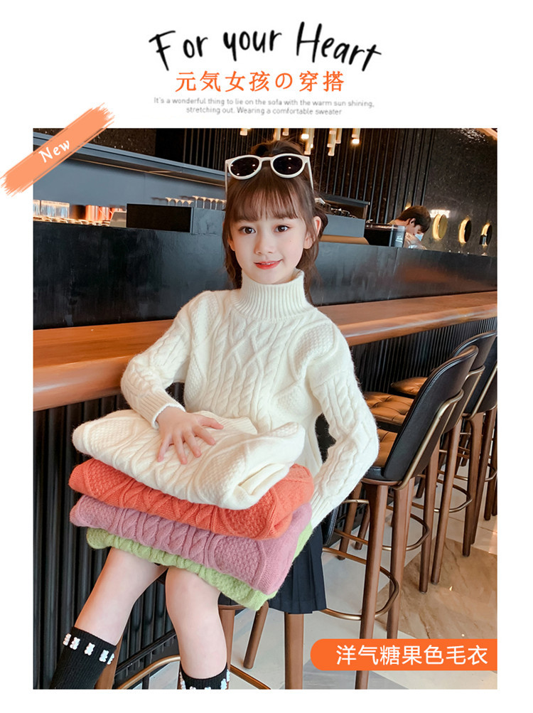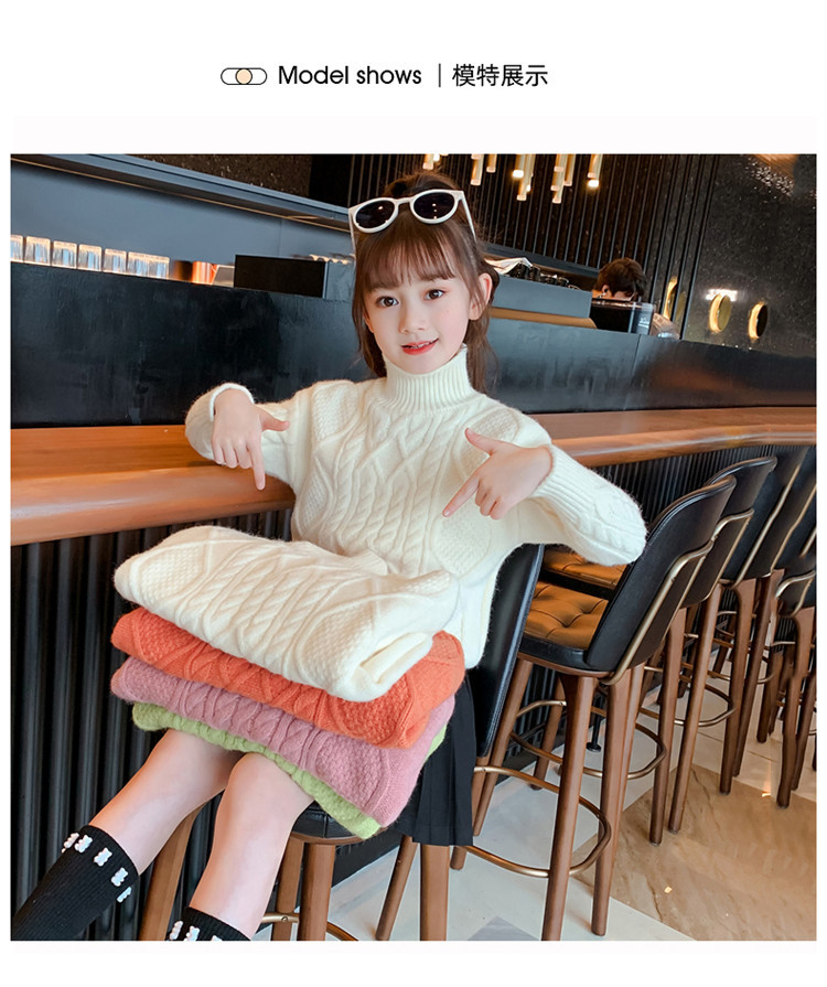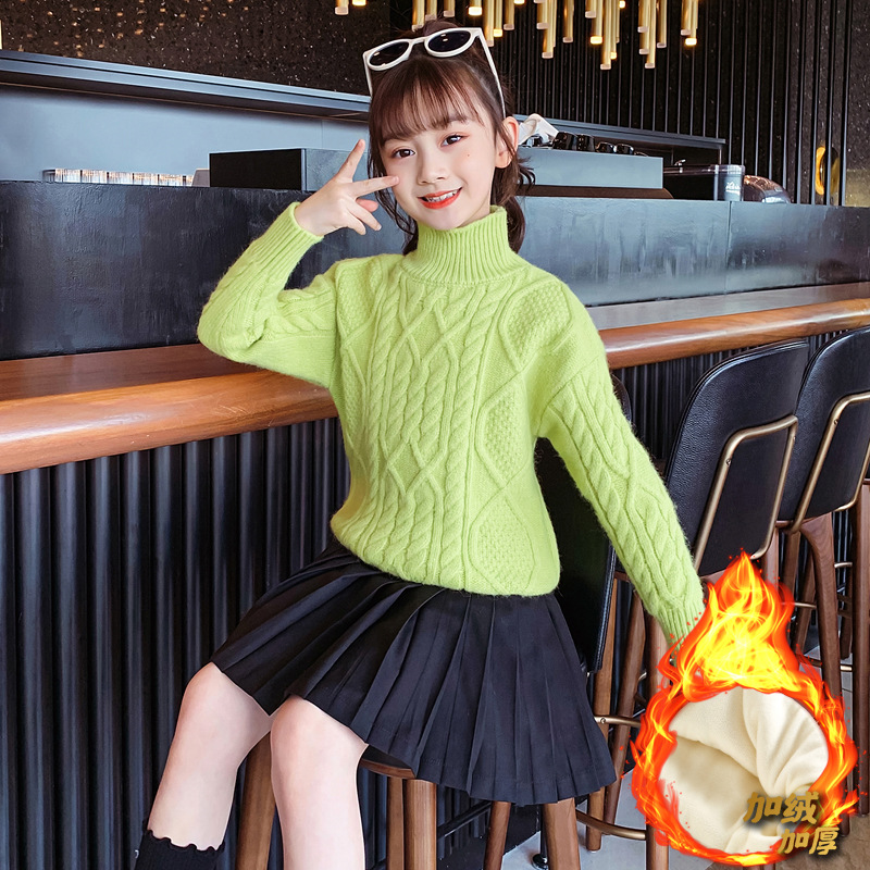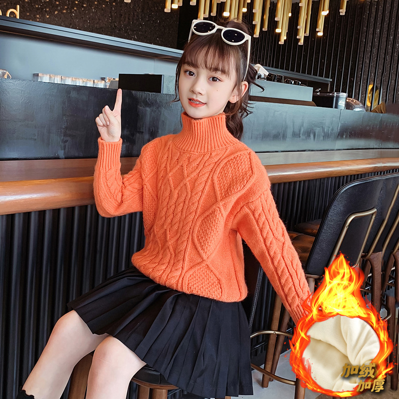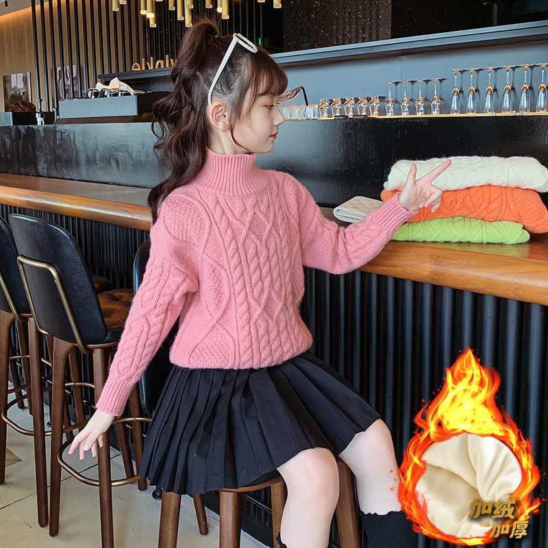 소녀의 가을과 겨울 스웨터 2024 새로운 높은 목베이스 셔츠 어린이를위한 단색 두꺼운 기모 니트 스웨터