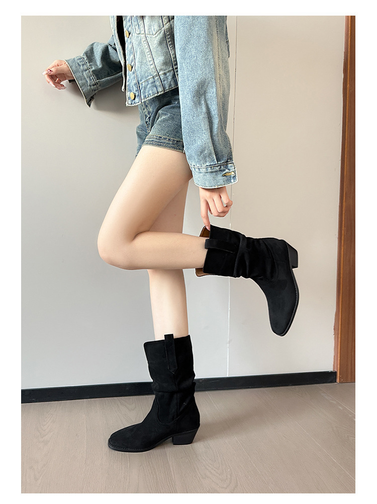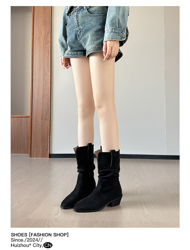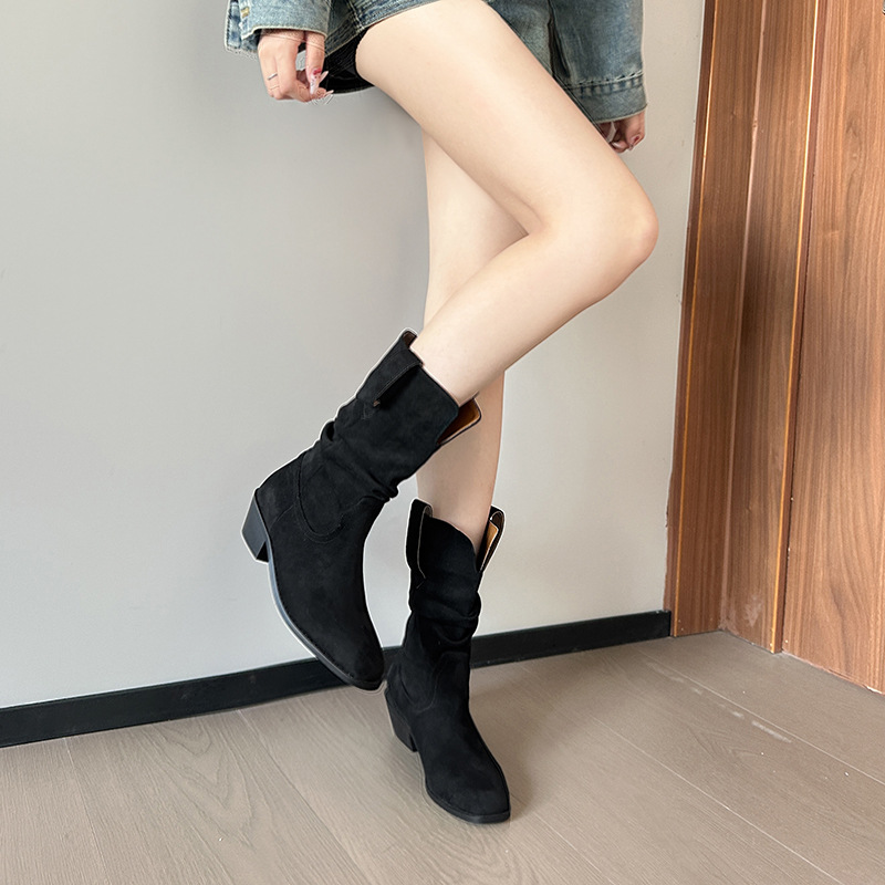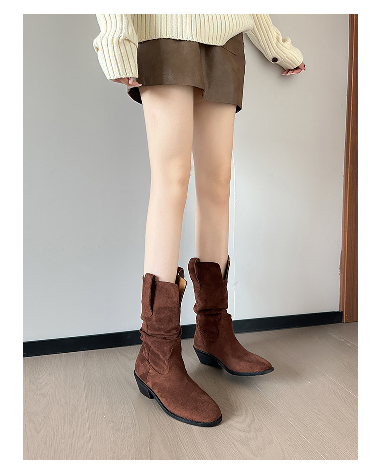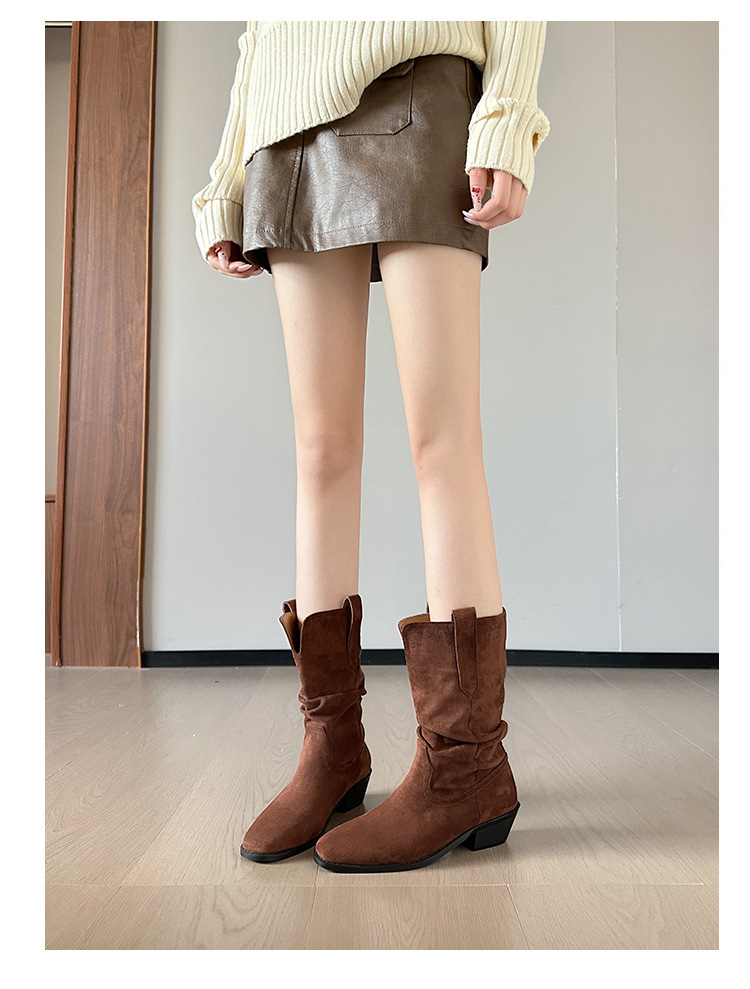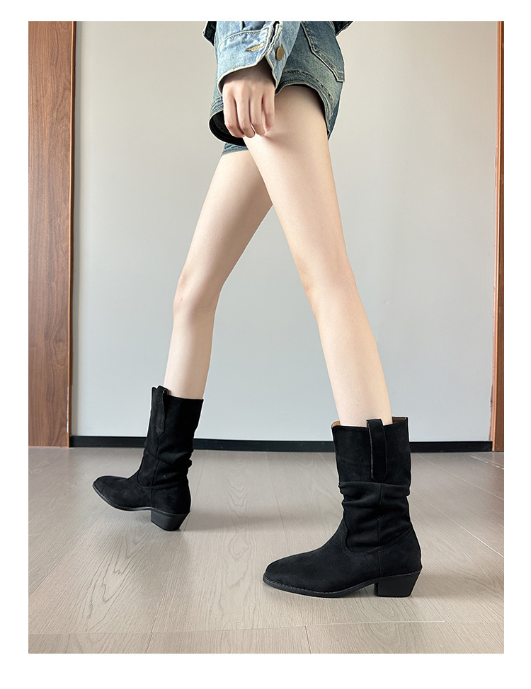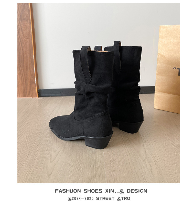 여성을위한 복고풍 패션 카우보이 부츠 2025 봄과 가을 새로운 스타일 뾰족한 발가락 두꺼운 굽 주름 짧은 마틴 부츠 나이트 부츠
