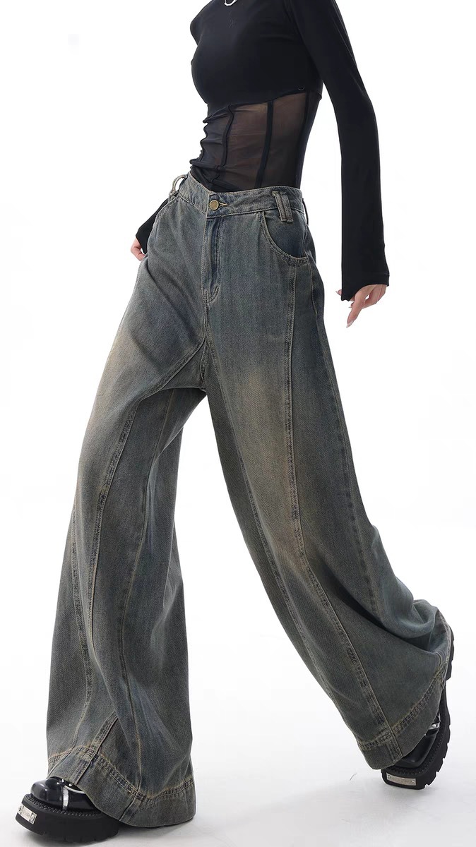 아메리칸 스타일 폭발성 와이드 레그 청바지 여성용 루즈 하이 웨이스트 디핑 올 매치 모핑 팬츠 스트레이트 레그 팬츠 포시즌 착용 바지