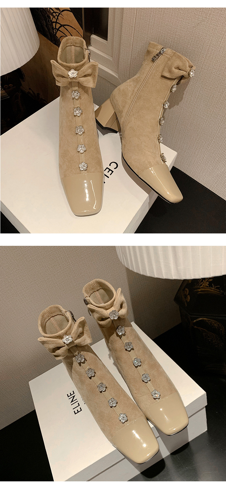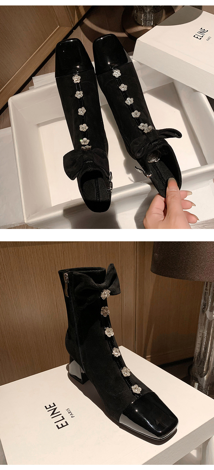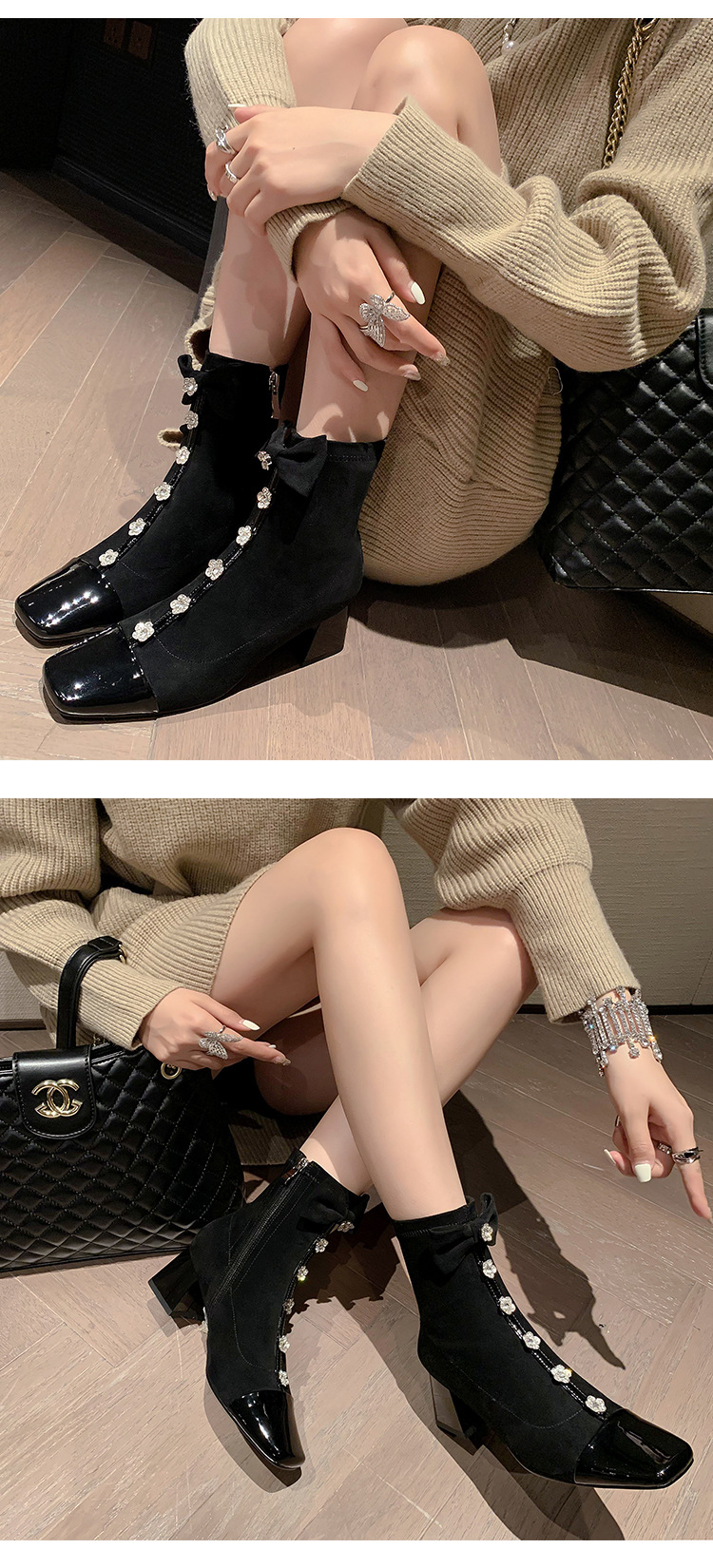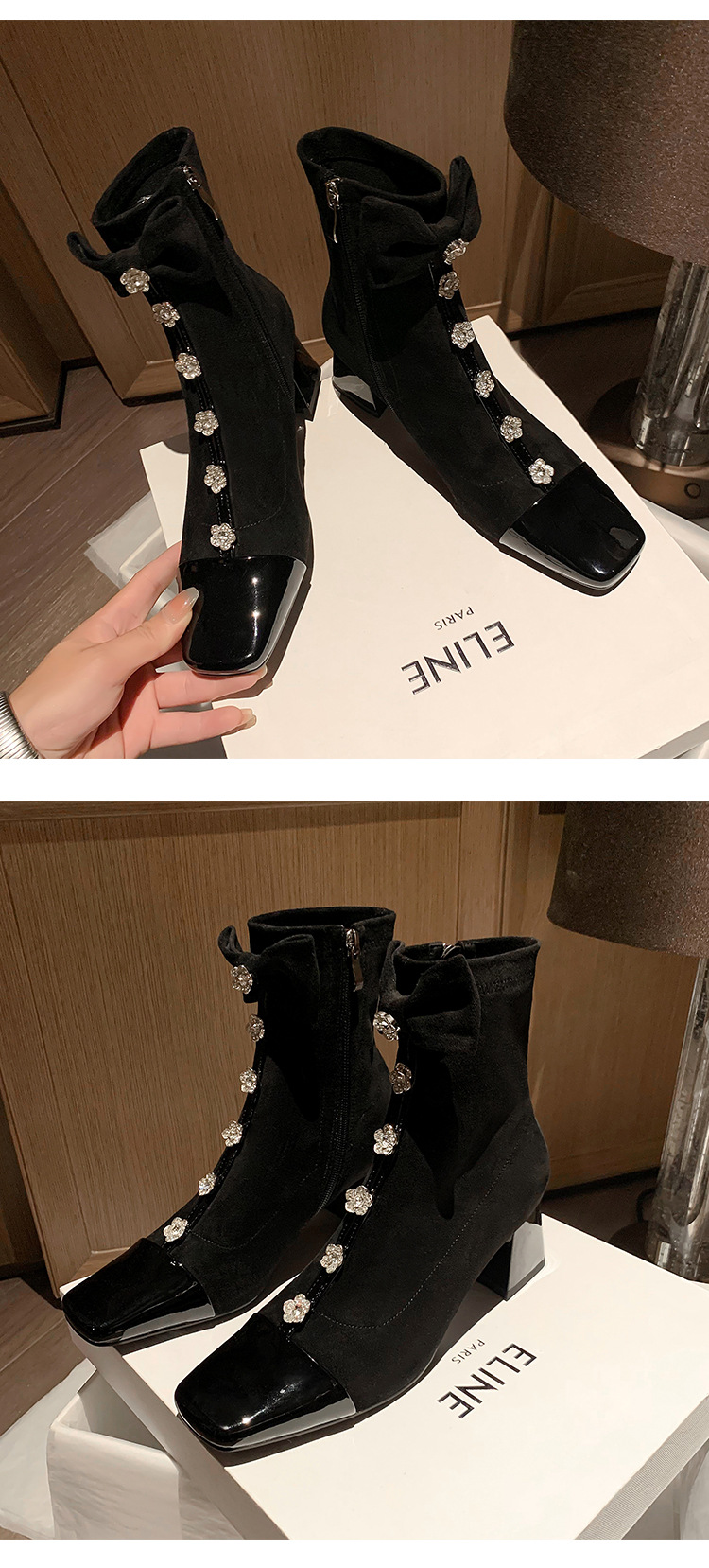 활 꽃 다이아몬드 버클 발목 부츠 여성 가을 및 겨울 빛 럭셔리 레이디 스타일 스위트 스퀘어 헤드 두꺼운 힐 사이드 지퍼 패션 부츠