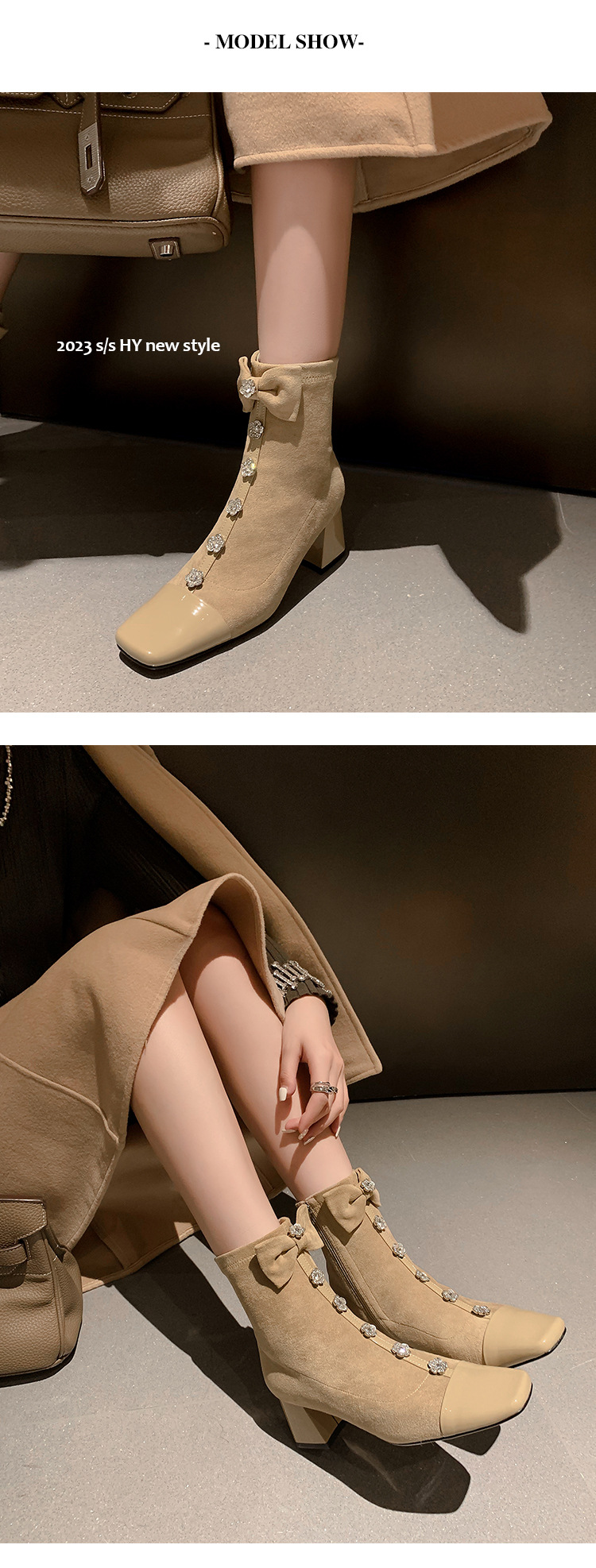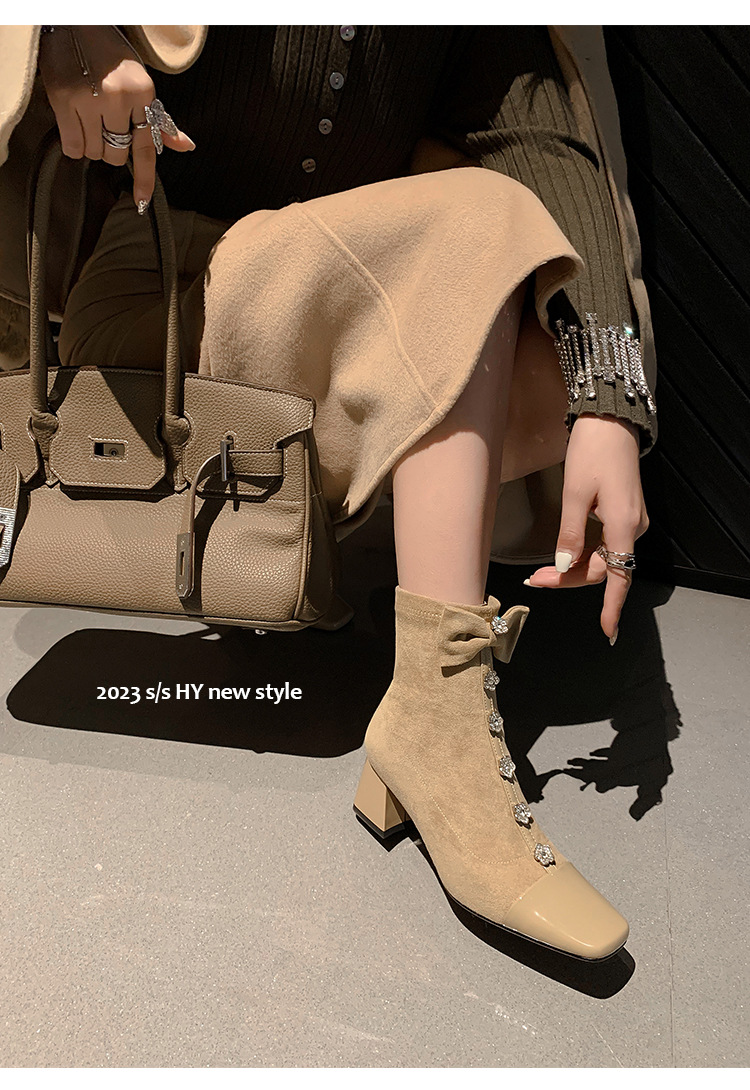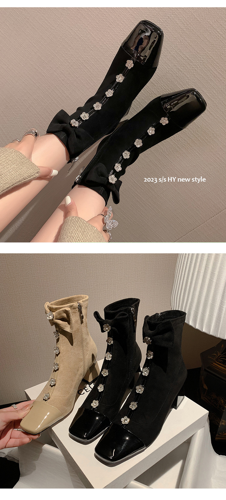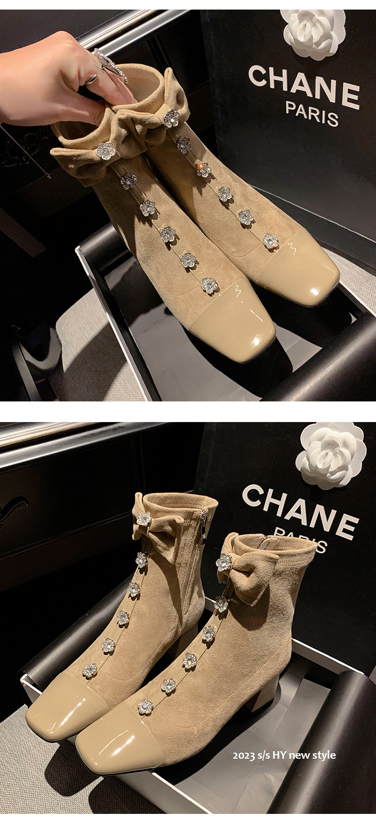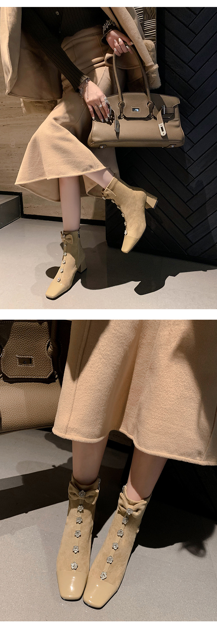 활 꽃 다이아몬드 버클 발목 부츠 여성 가을 및 겨울 빛 럭셔리 레이디 스타일 스위트 스퀘어 헤드 두꺼운 힐 사이드 지퍼 패션 부츠