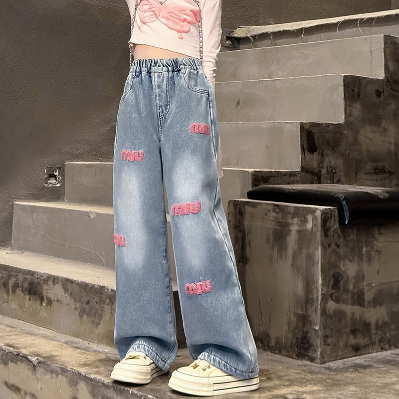소녀 데님 넓은 다리 바지 봄과 가을 어린이 좁은 캐주얼 긴 바지 기모 직선 다리 넓은 다리 캐주얼 중 큰 어린이스토어 가기