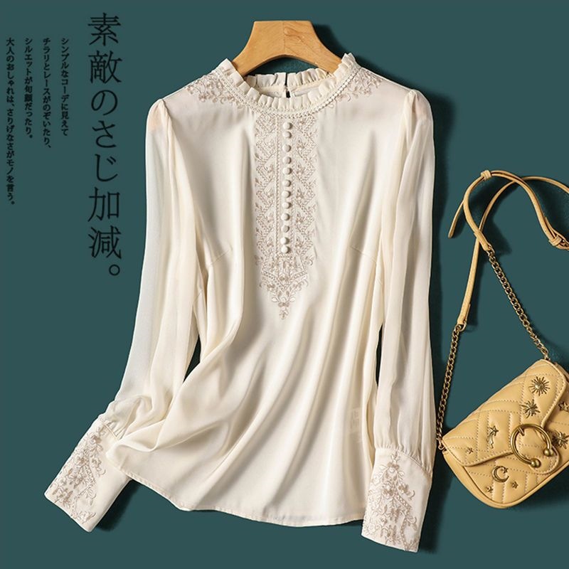 여성을위한 중공업 자수 실크 셔츠 2022 가을 새로운 스타일 버진 실크 긴팔 티셔츠 탑스토어 가기