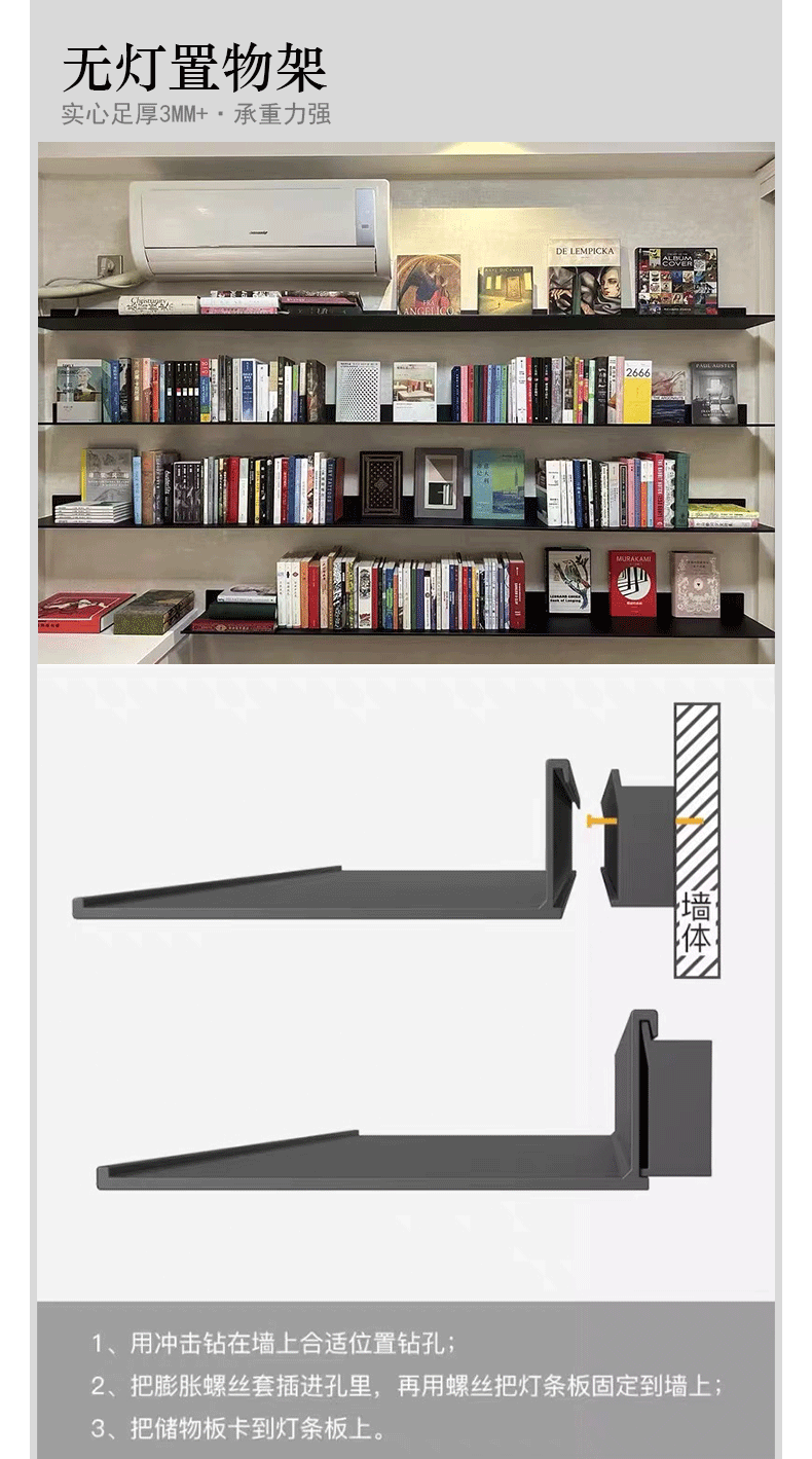 알루미늄 합금 금속 LED 발광 보드 저장 랙 벽 교수형 보드 저장 랙 한 단어 디스플레이 책장스토어 가기