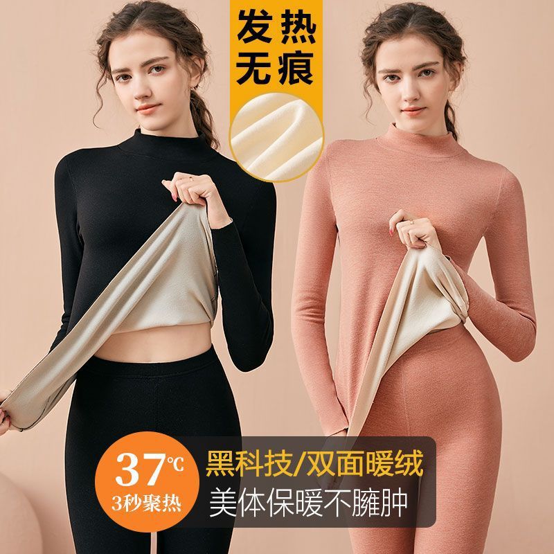 중간 높이 목 열 속옷 여성 두껍고 벨벳 세트 벨벳 피버 가을 바지 기본 단색 면 스웨터 홍지스토어 가기