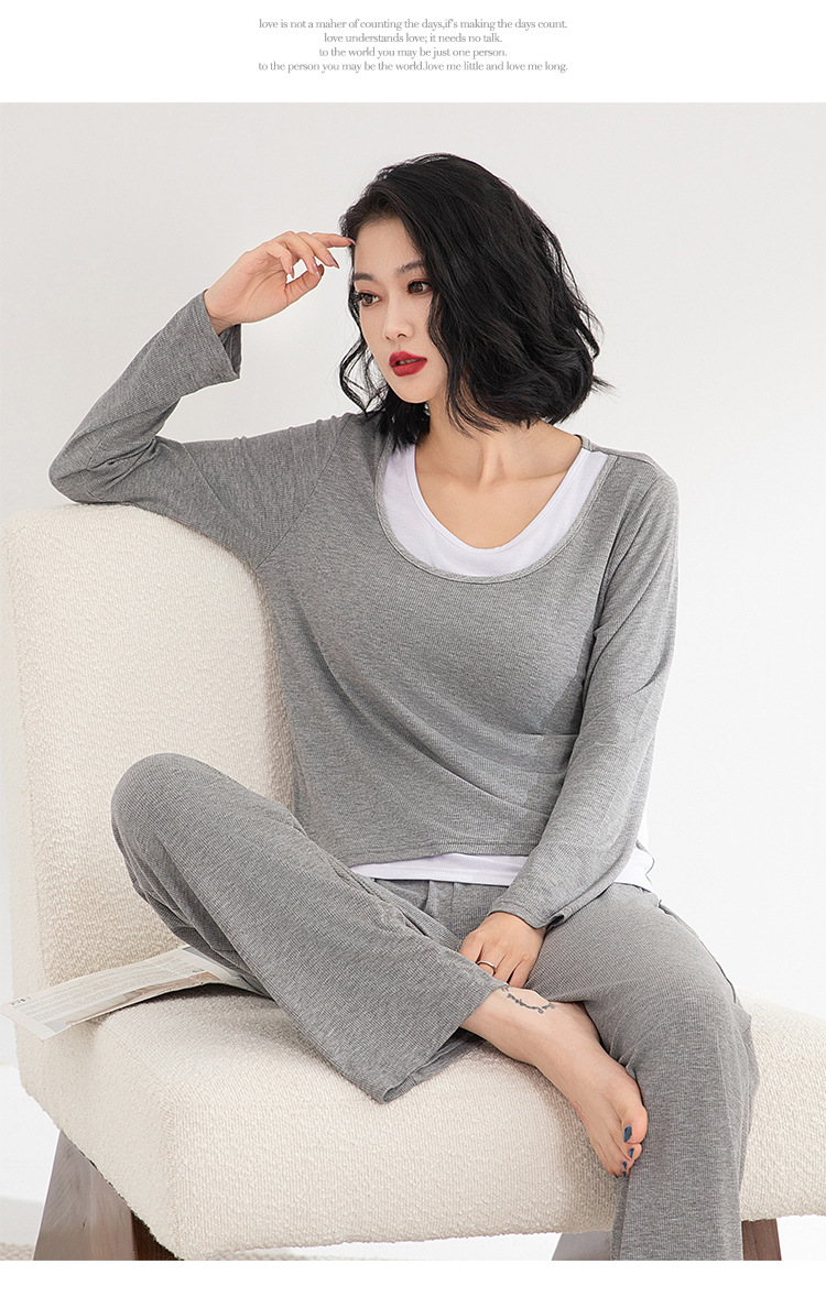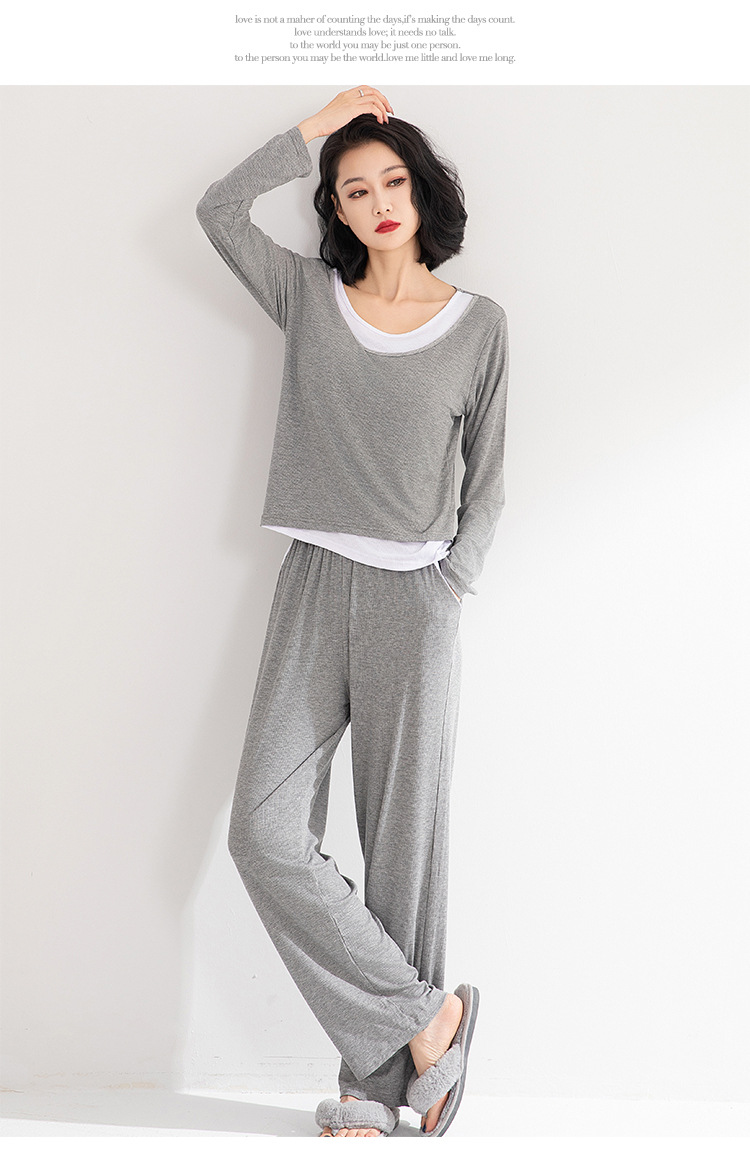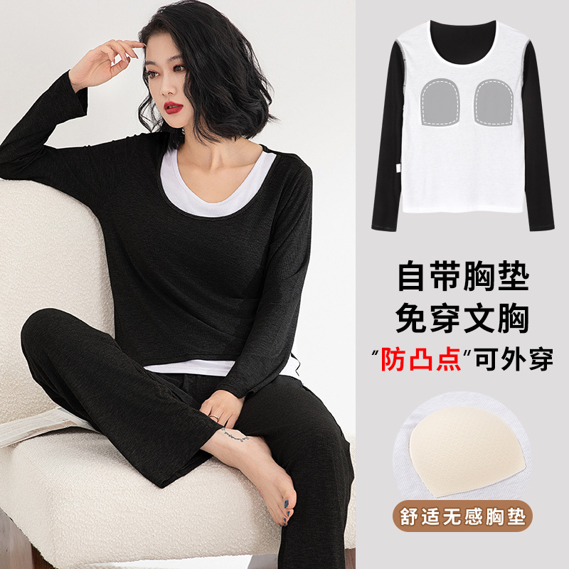 모달 파자마 여성의 봄과 가을 가슴 패드 원피스 긴팔 가을과 겨울 플러스 사이즈 가짜 투피스 세트 홈 의류