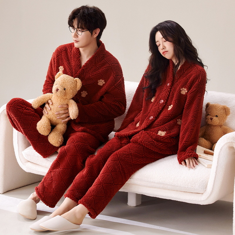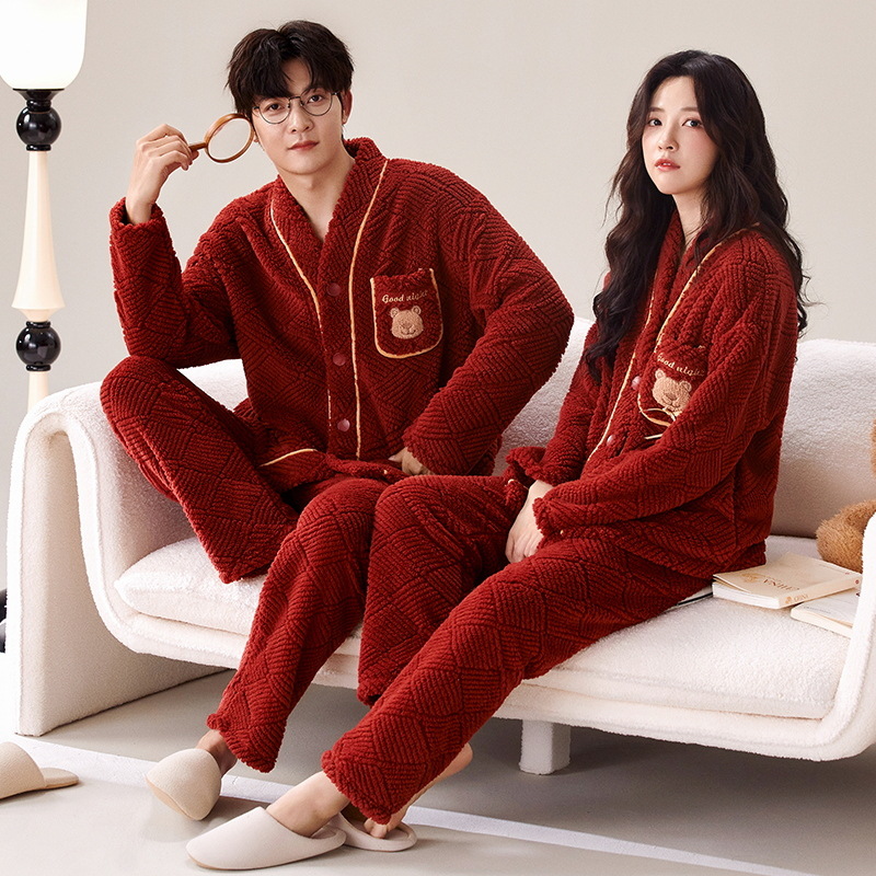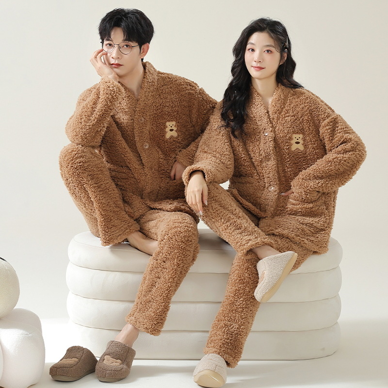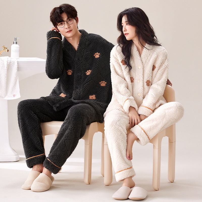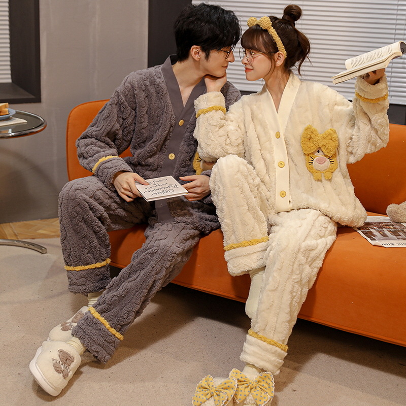 커플 잠옷 가을과 겨울 산호 벨벳 한 남자와 한 여자 기모 두꺼운 플란넬 겨울 카디건 홈 옷 세트