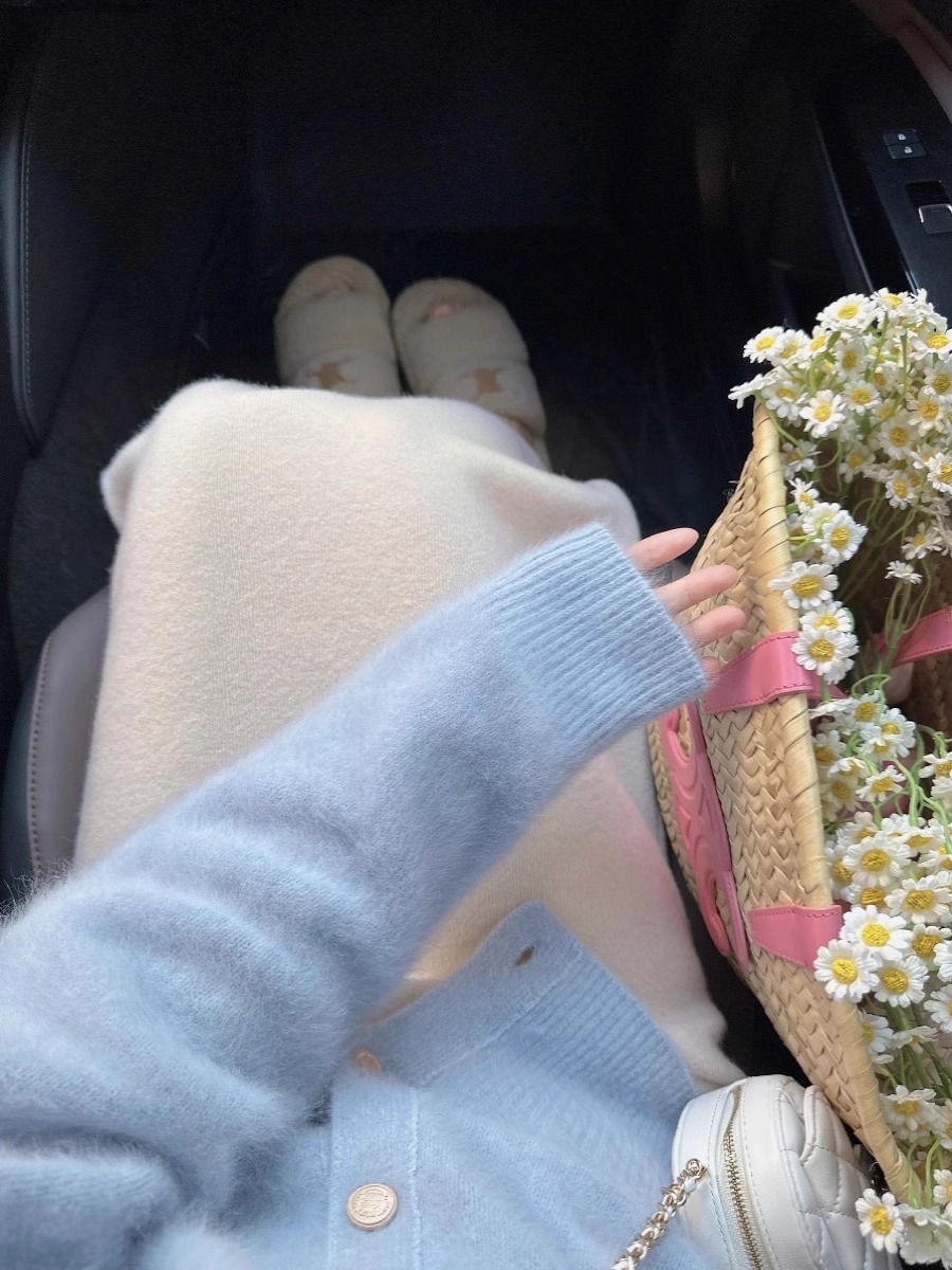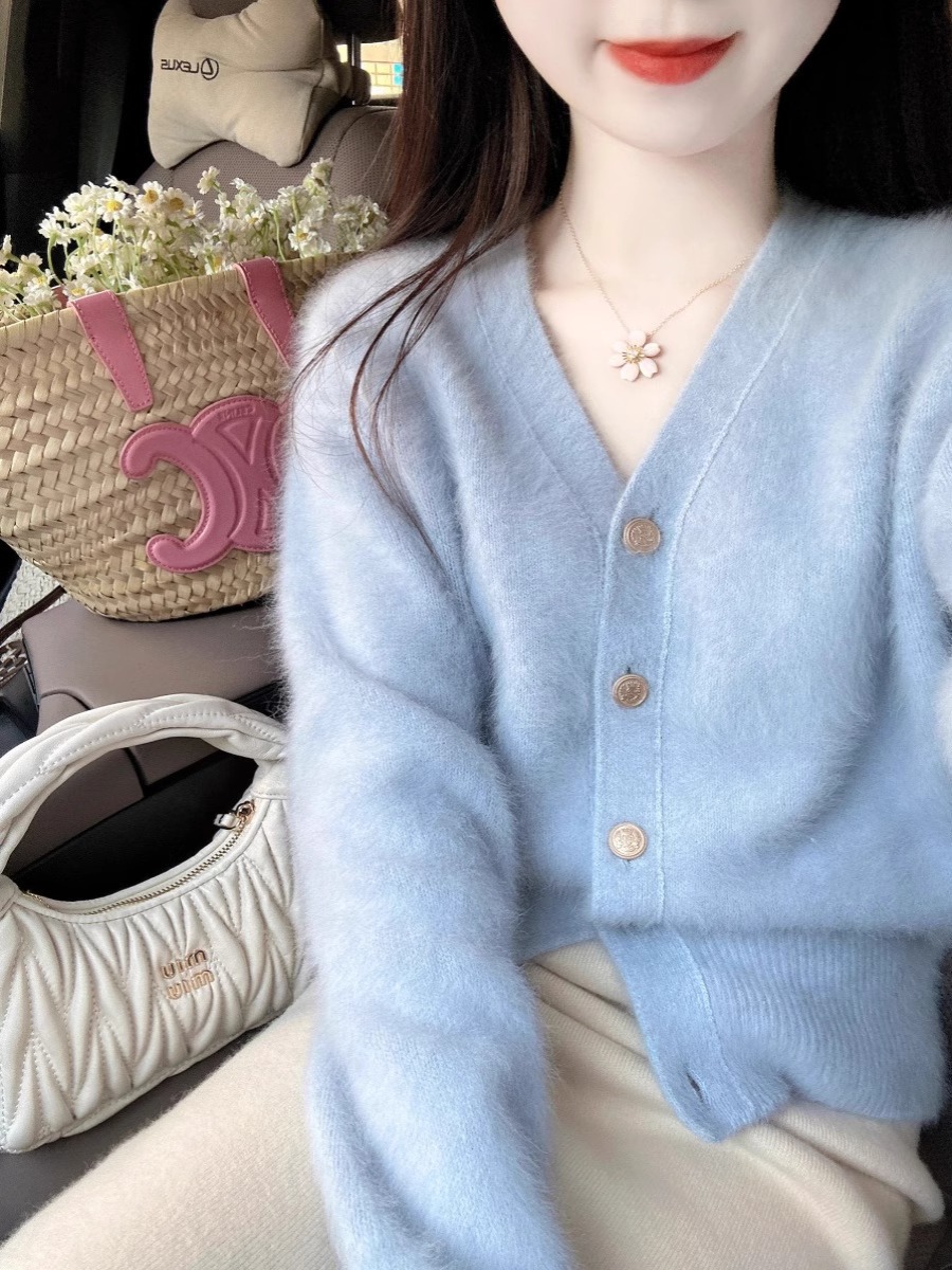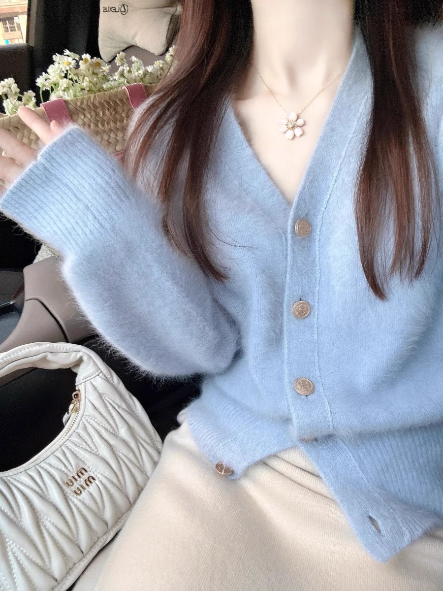 밀크 블루 게으른 스타일 V-Neck Mahair 스웨터 코트 여성의 가을과 겨울 느슨한 부드러운 왁스 밀크 푸푸 스웨터 탑