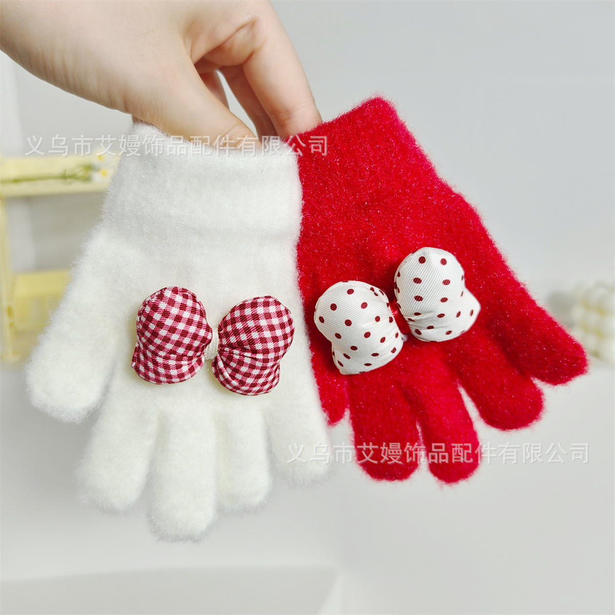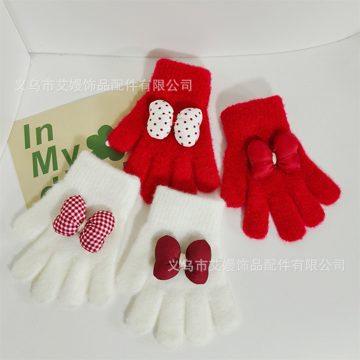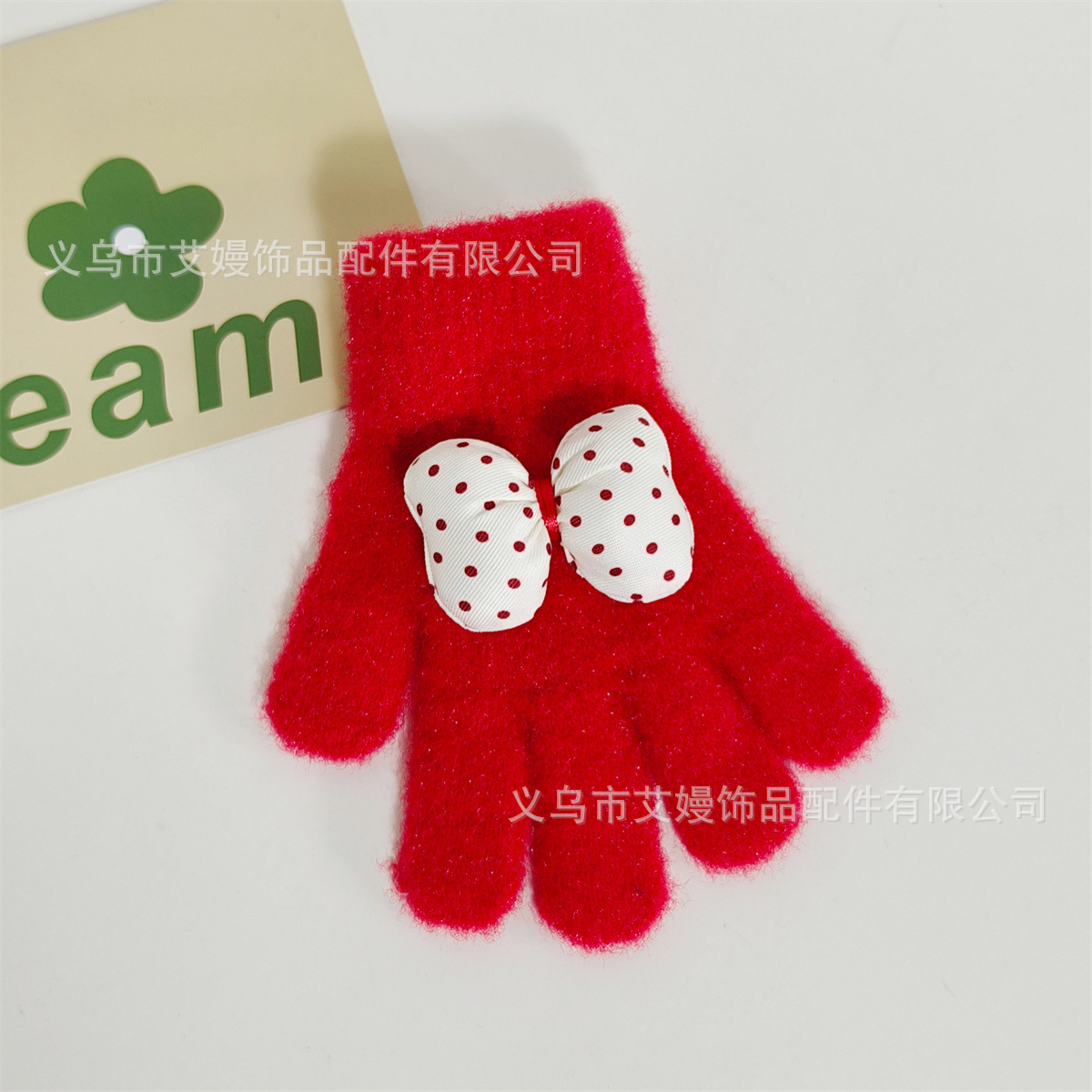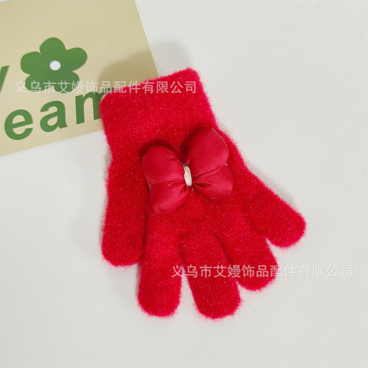 어린이 가을 겨울 한국 스타일 붉은 활 봉제 장갑 새해 붉은 따뜻한 손가락 보호 부동액 다섯 손가락