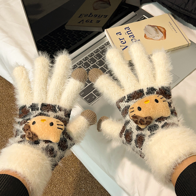 2024 겨울 새 승마 따뜻한 감기 만화 레오파드 무늬 Maillard 시리즈 Kt 고양이 손가락 장갑