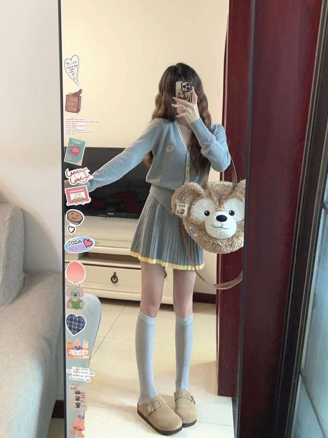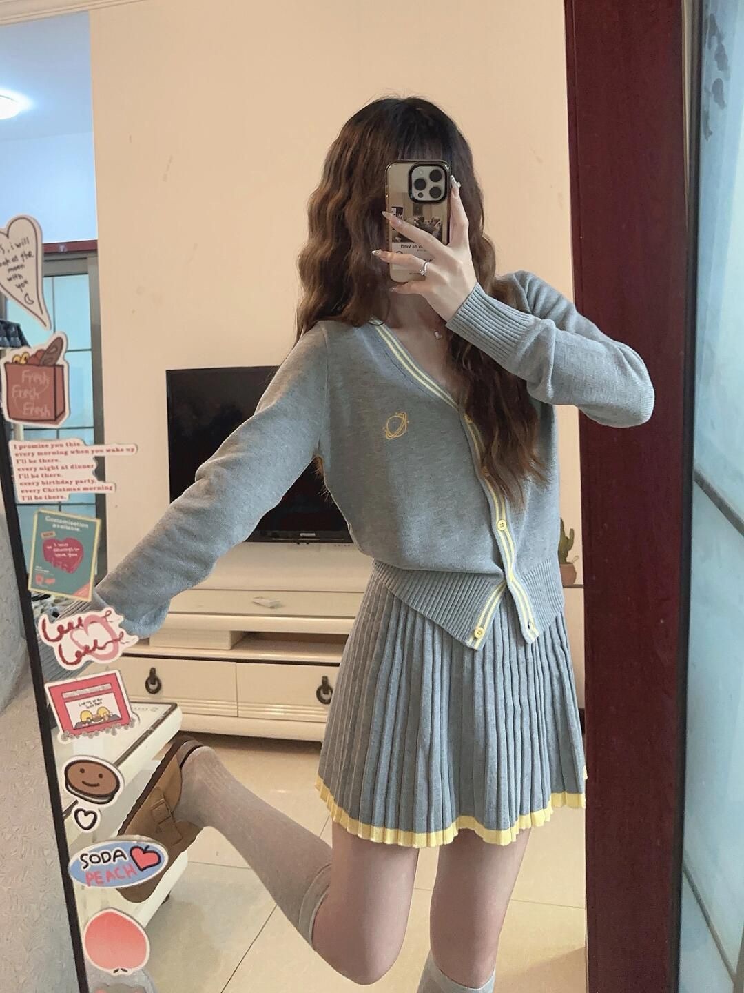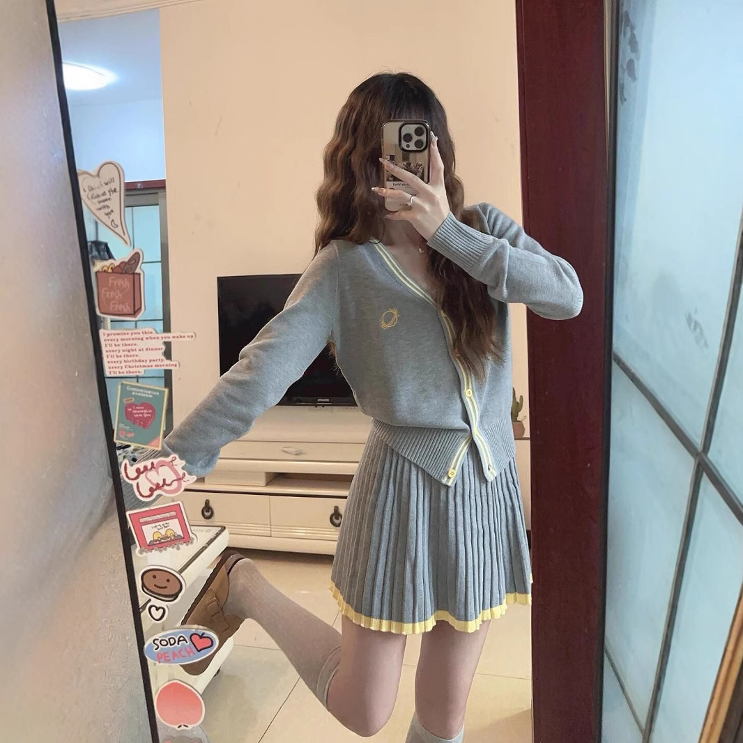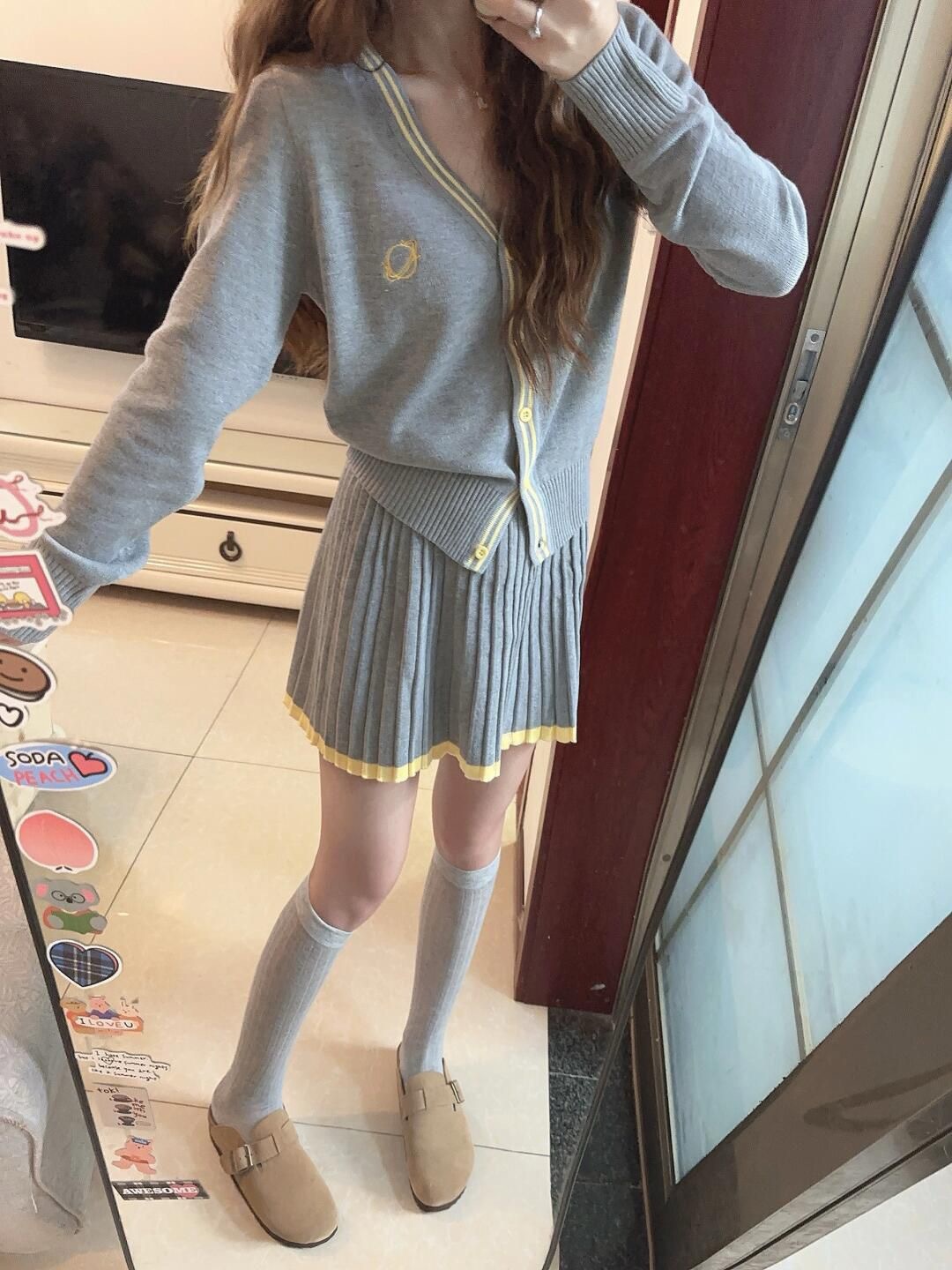작은 대학 스타일은 어린이 가을과 겨울 2024 새로운 치마를 원피스 세트 긴 소매 니트 착용