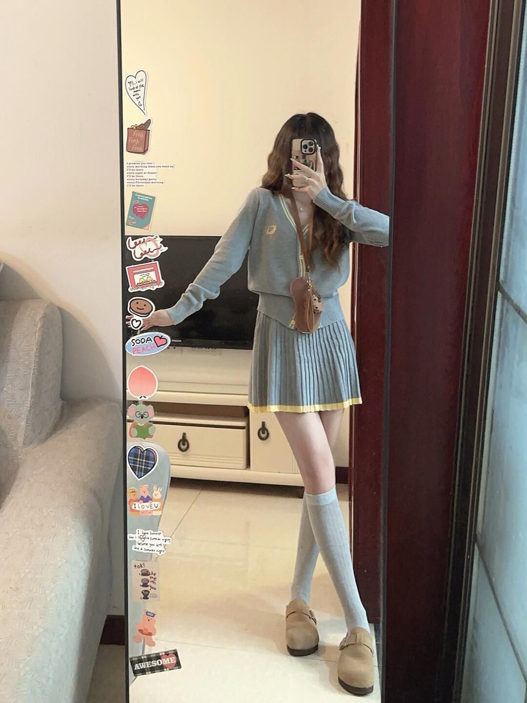 작은 대학 스타일은 어린이 가을과 겨울 2024 새로운 치마를 원피스 세트 긴 소매 니트 착용스토어 가기