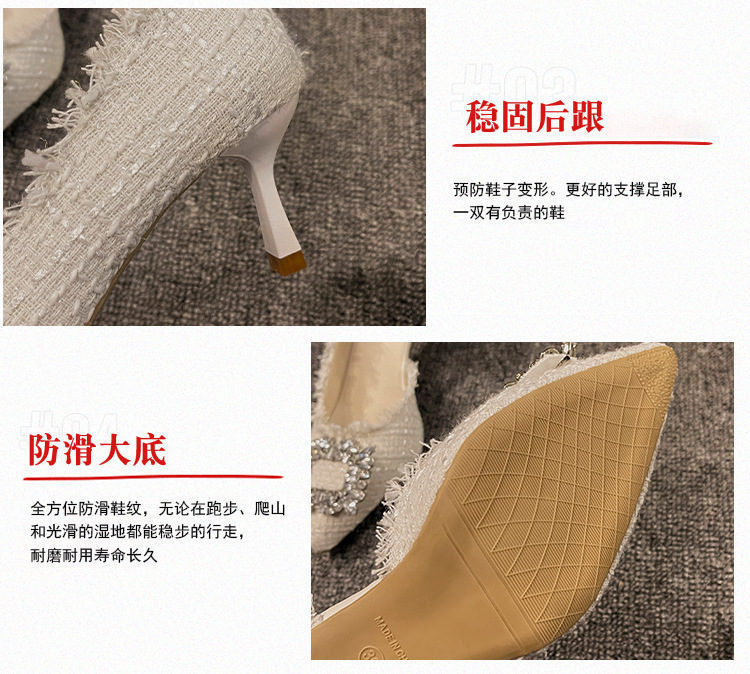 하이힐 여성 2024 년 여름 새로운 틈새 디자인 프렌치 포인티드 슈즈 얇은 힐 샤넬 스타일 라인스톤 싱글 슈즈스토어 가기