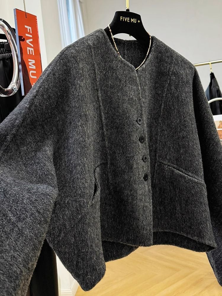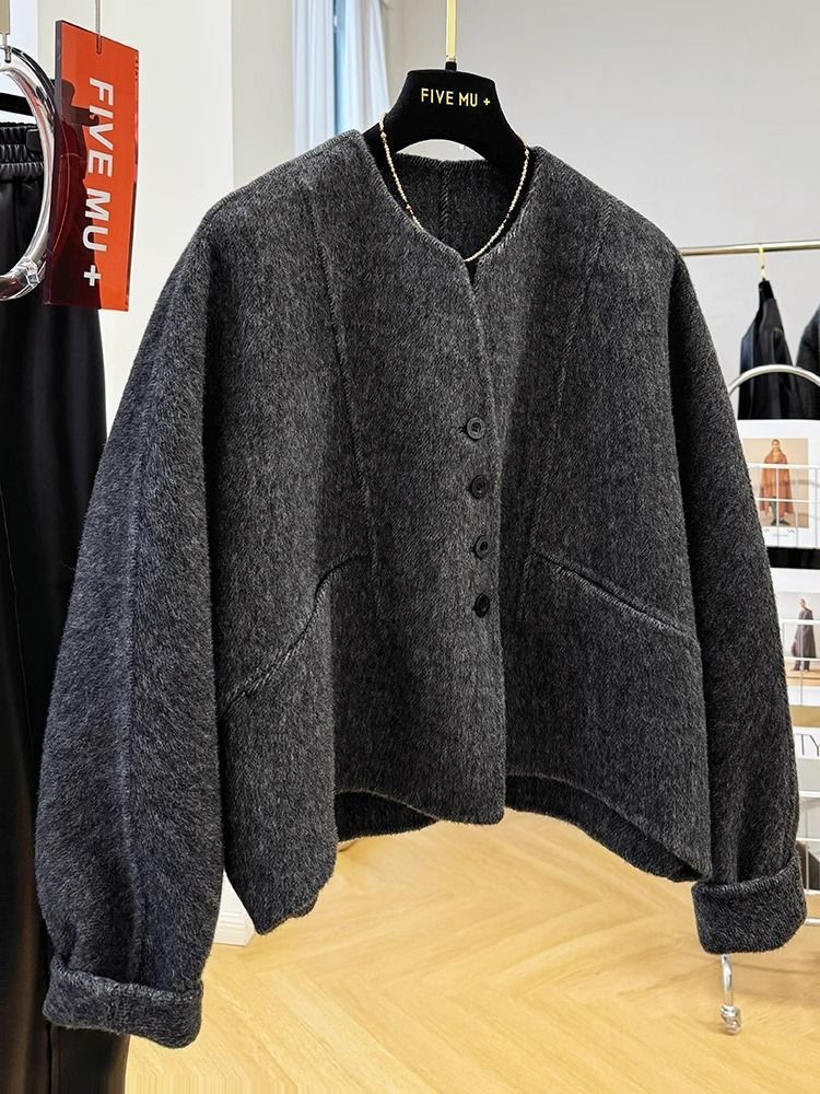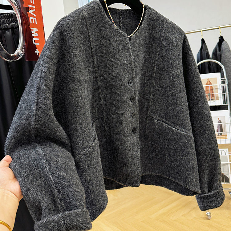 고급스러운 한국 스타일 라운드넥 모직 코트 여성용 가을 겨울 기모 처리된 짧은 패션 모직 코트