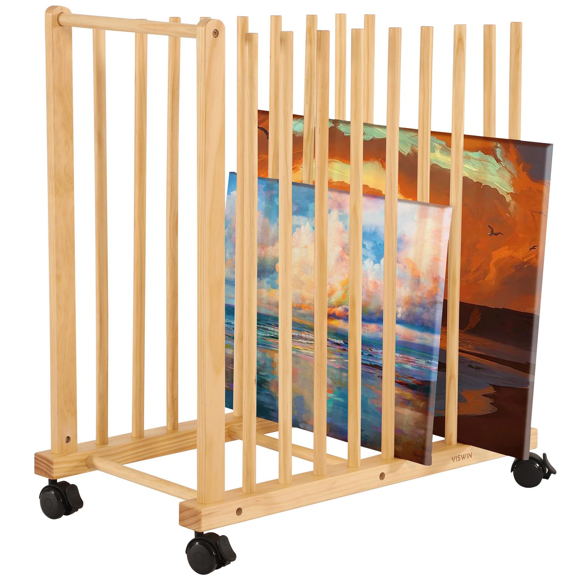 나무 유화 스토리지 랙 캐스터 멀티 그리드 아트 캔버스 페인팅 스토리지 랙 유화 보관 건조 랙