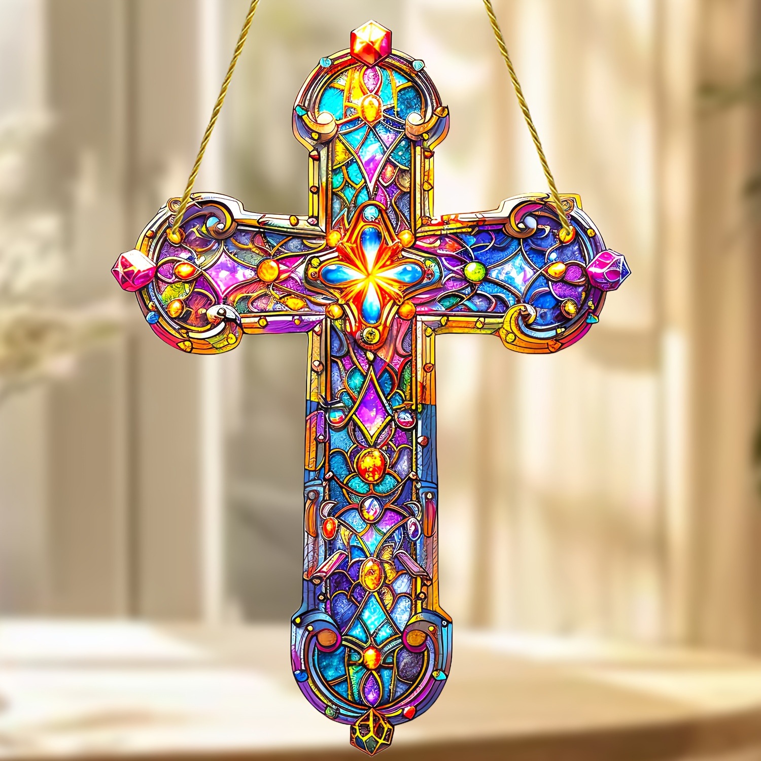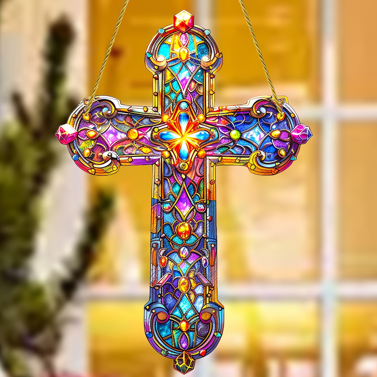 국경 아크릴 스테인드 글라스 스타일 선 캐처 크로스 코트야드 장식 종교 선물 휴일 장식