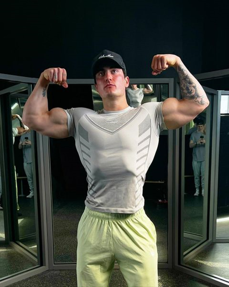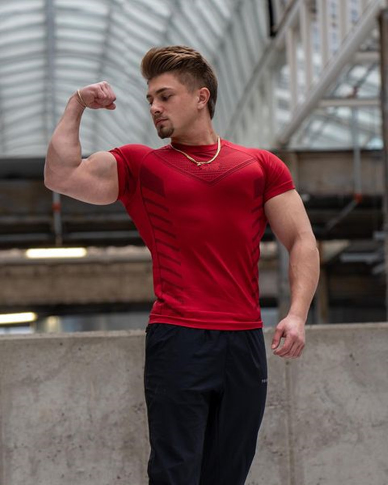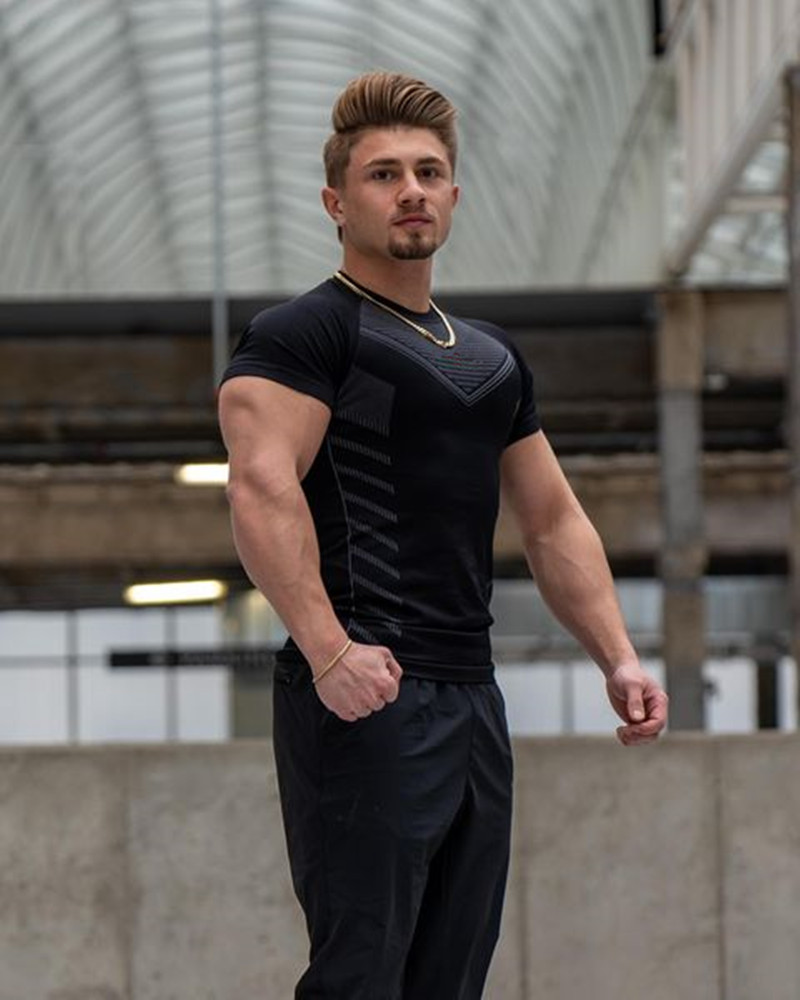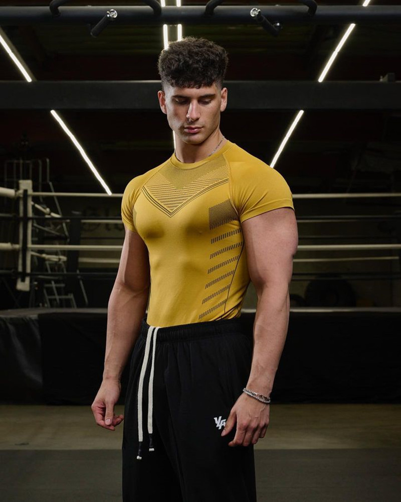 미국의 새로운 체육관 코치 스포츠 티셔츠 근육 타이트 남자의 높은 탄성 훈련 옷 짧은 소매 피트니스 옷스토어 가기