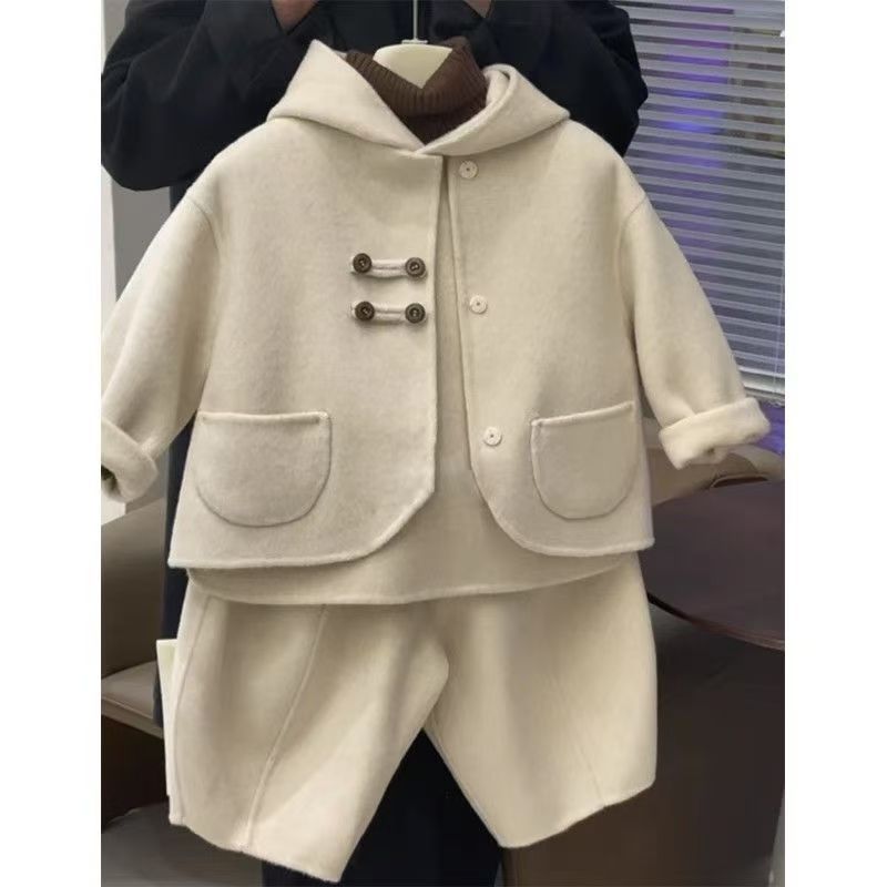한국 아동복 2024 가을 새 소녀 세트 어린이 디자인 감각 모직 코트 느슨한 바지 투피스 세트스토어 가기