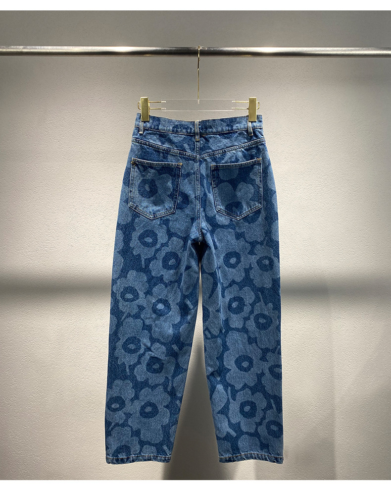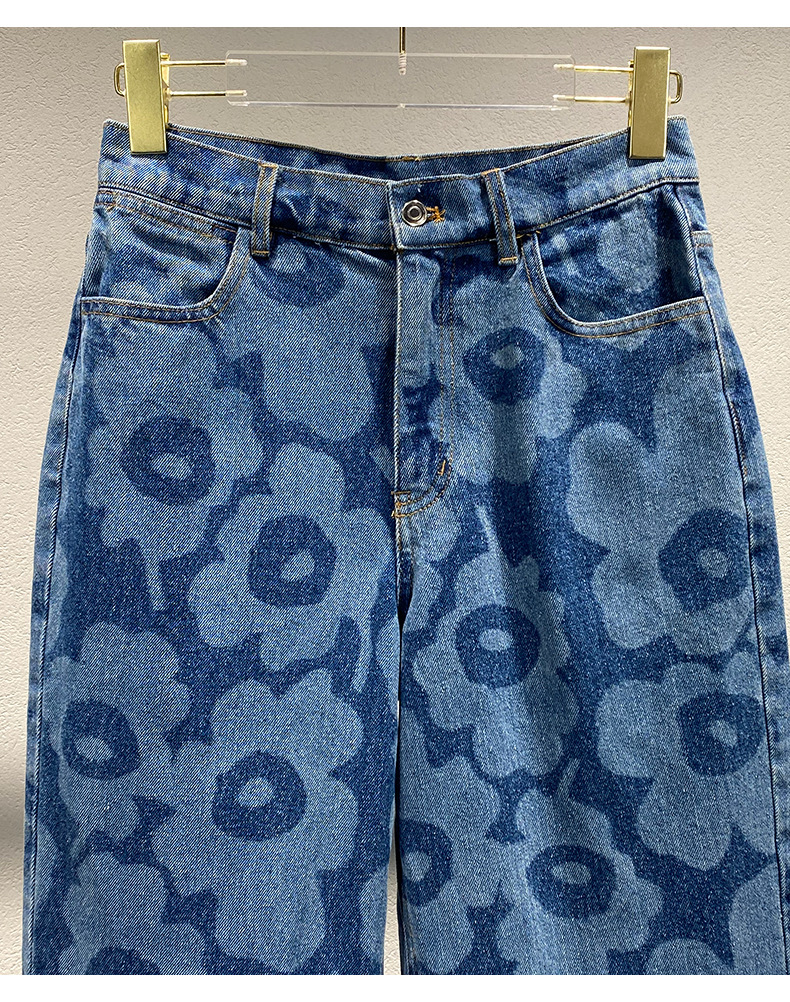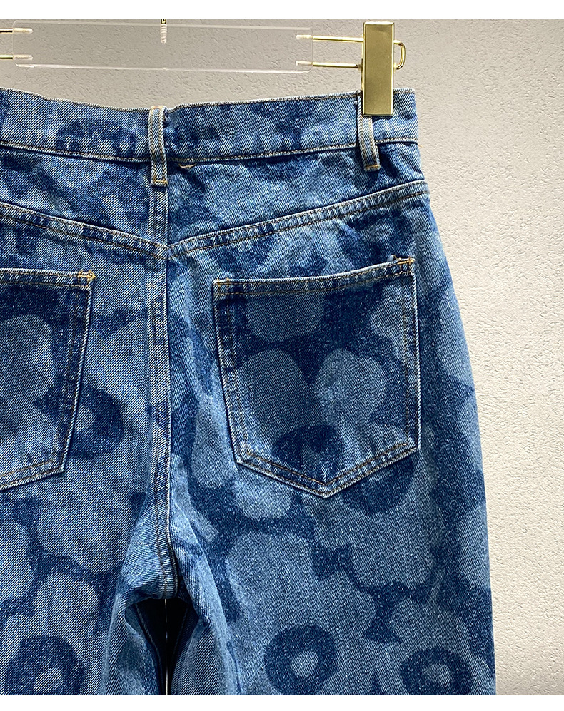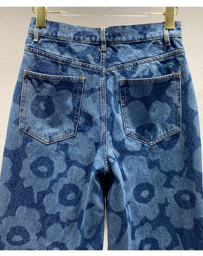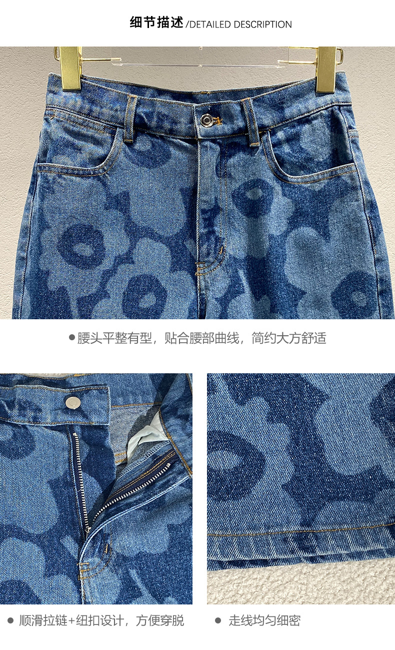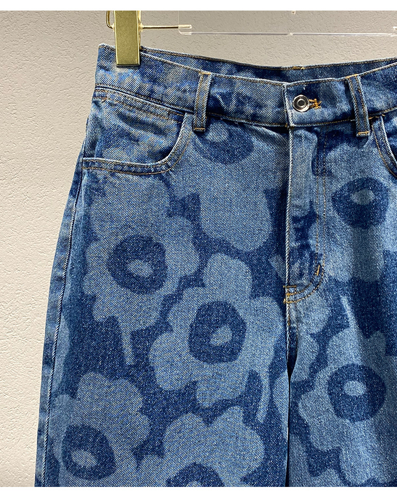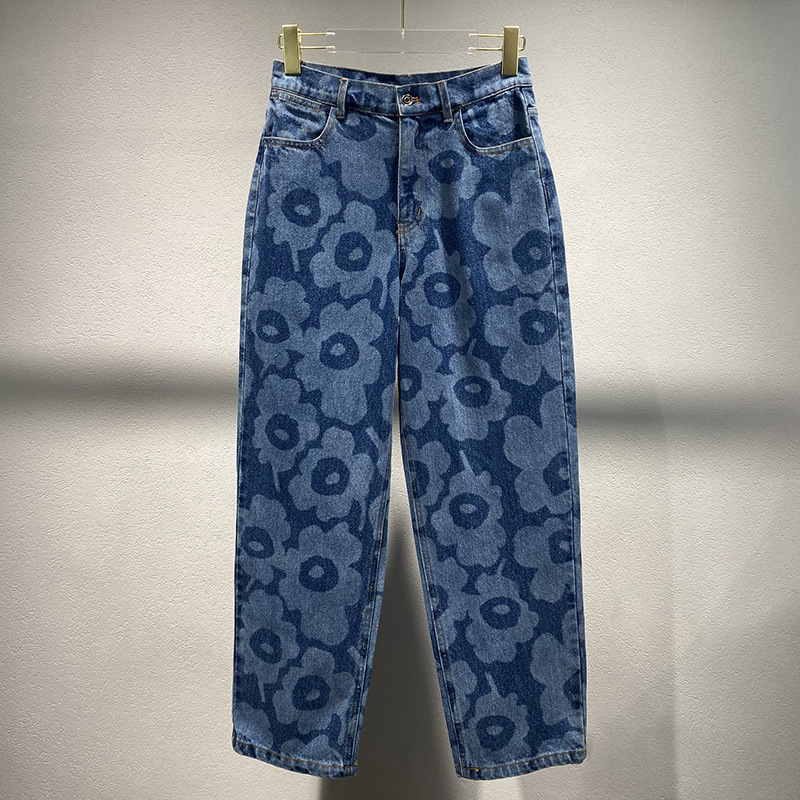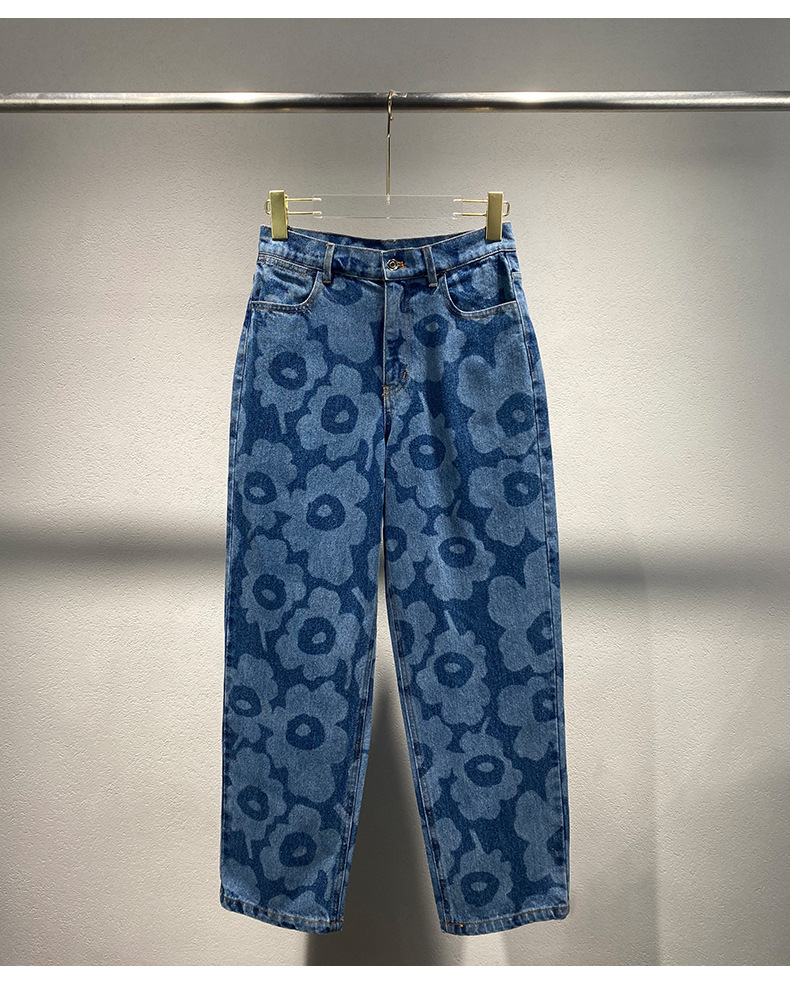 Xiaozhong 2024 가을과 겨울 새로운 푸른 꽃 인쇄 높은 허리 올스타 데님 바지스토어 가기