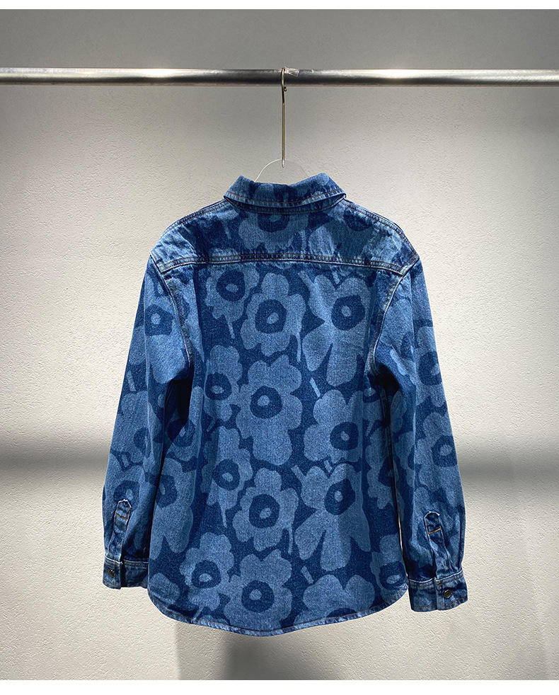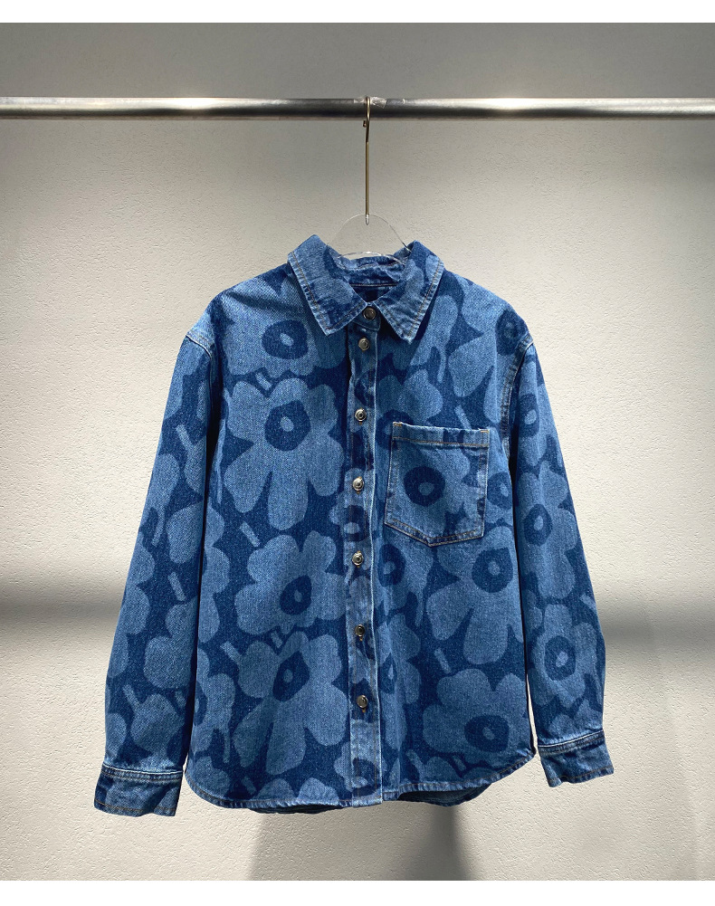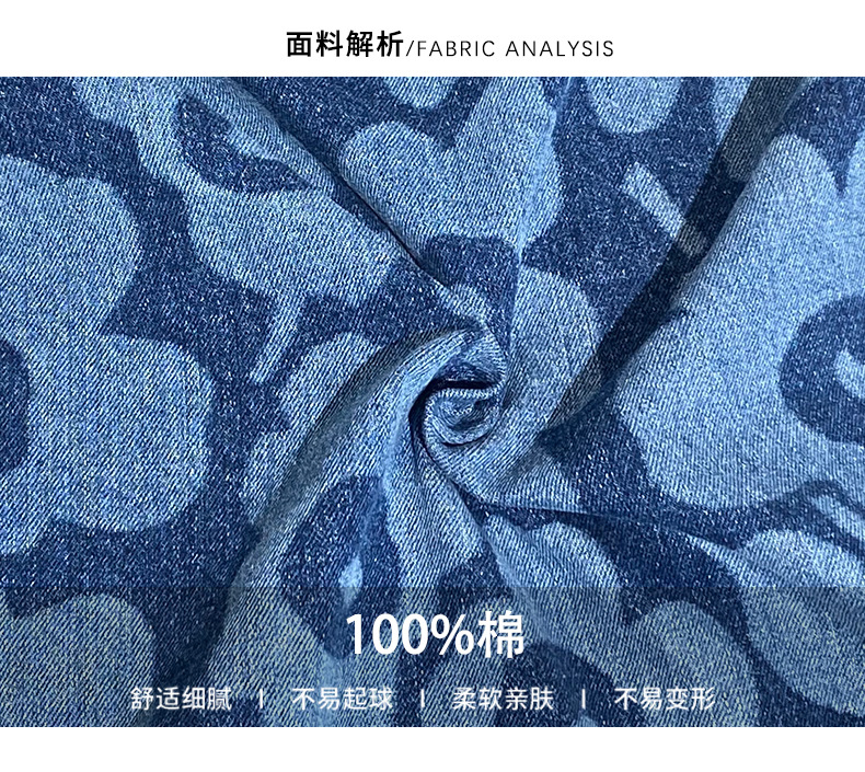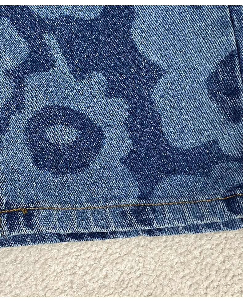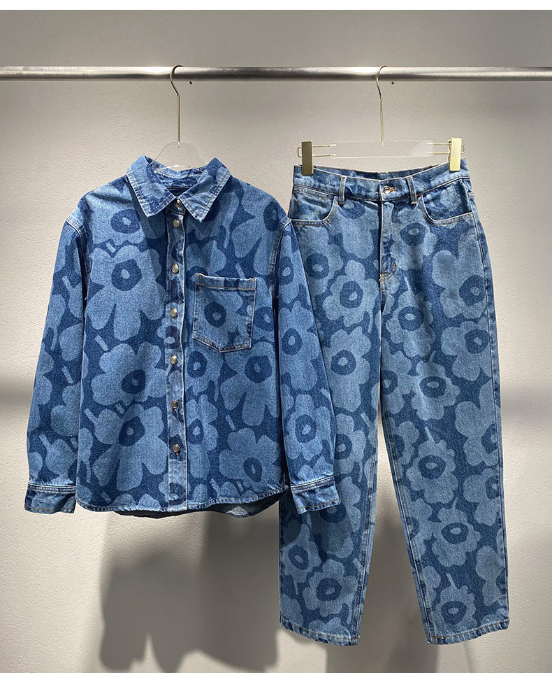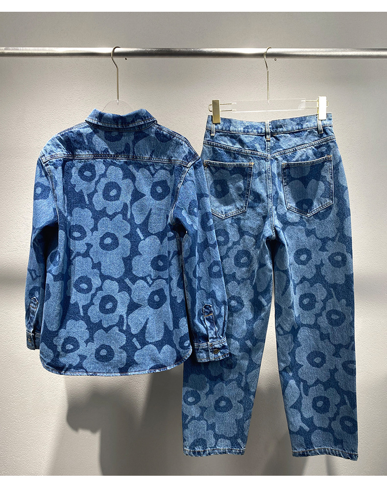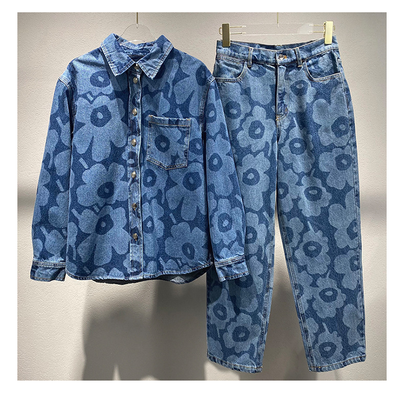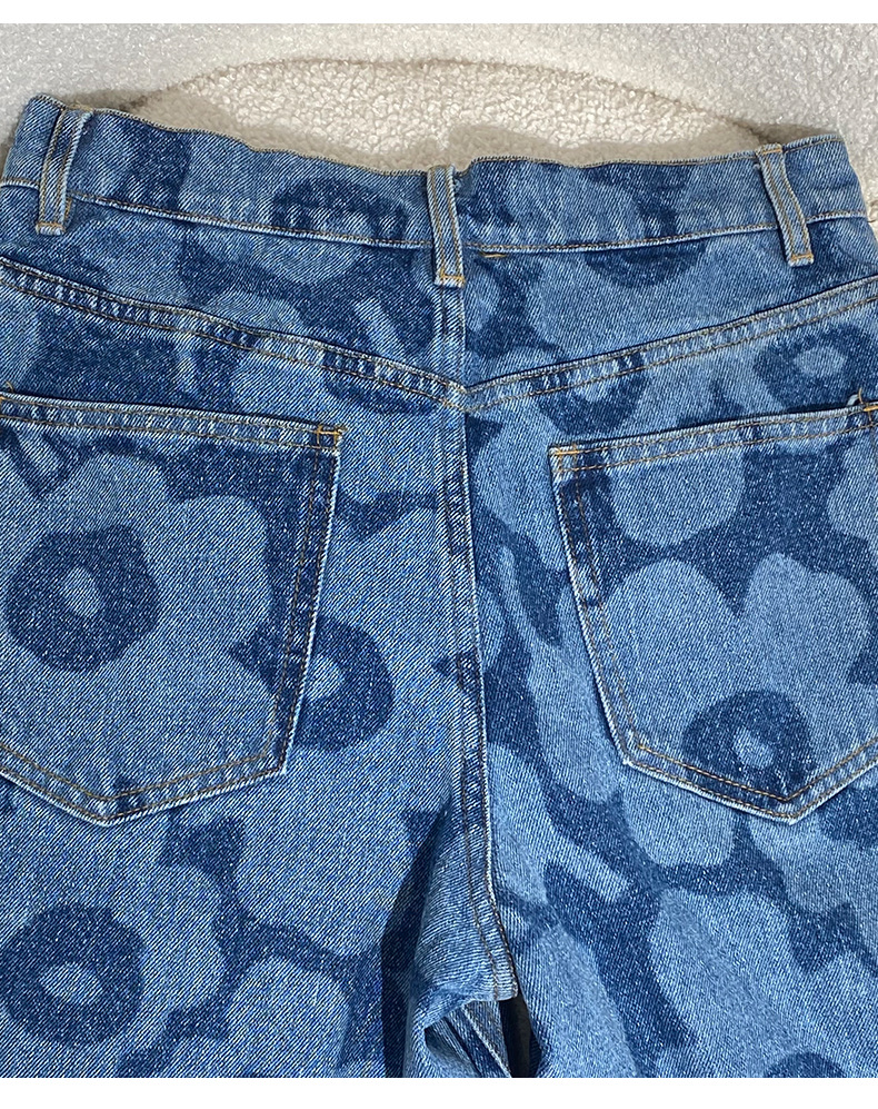 Xiaozhong 2024 가을과 겨울 새로운 푸른 꽃 인쇄 높은 허리 올스타 데님 바지스토어 가기